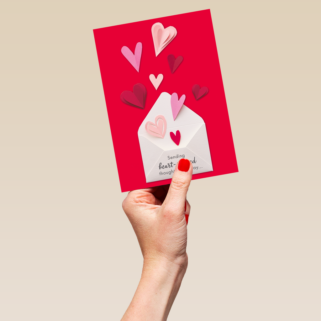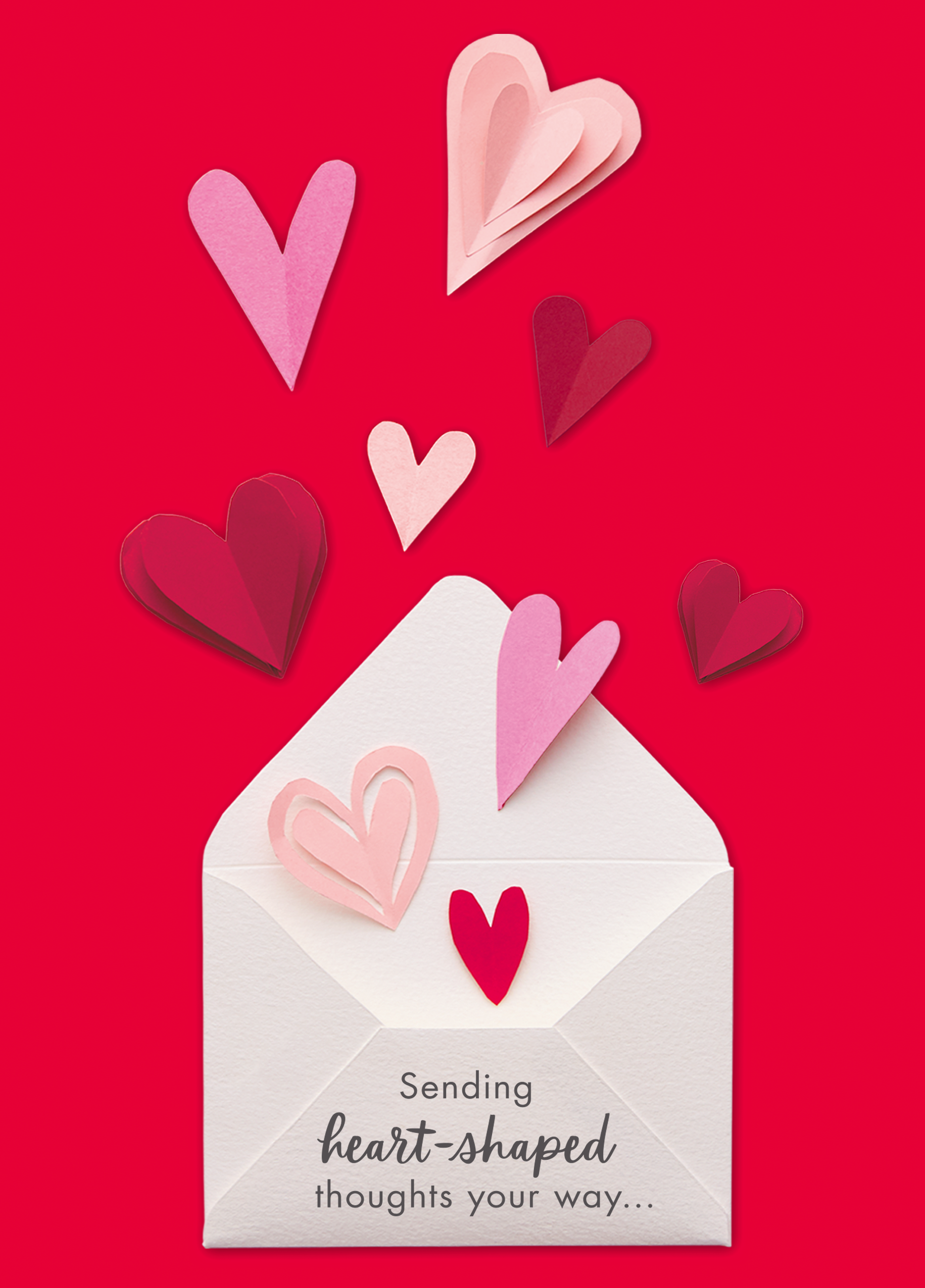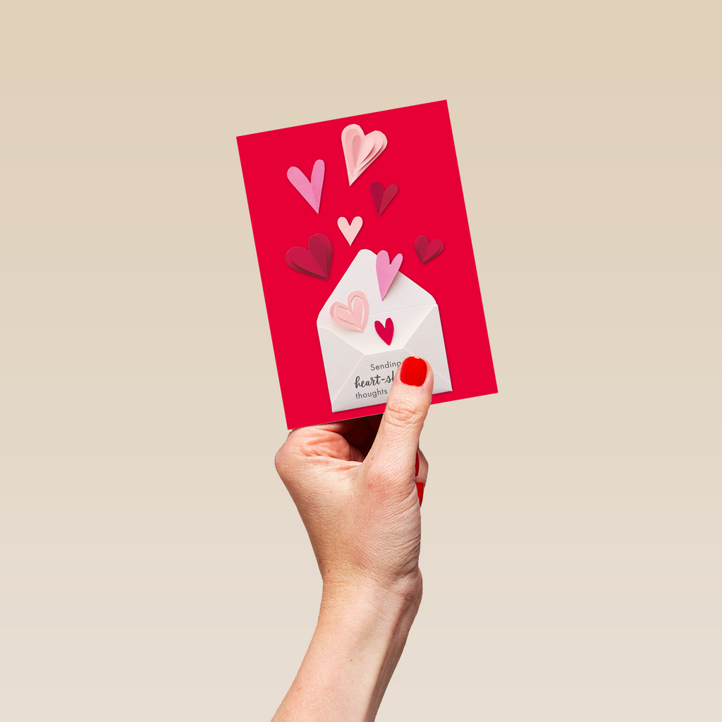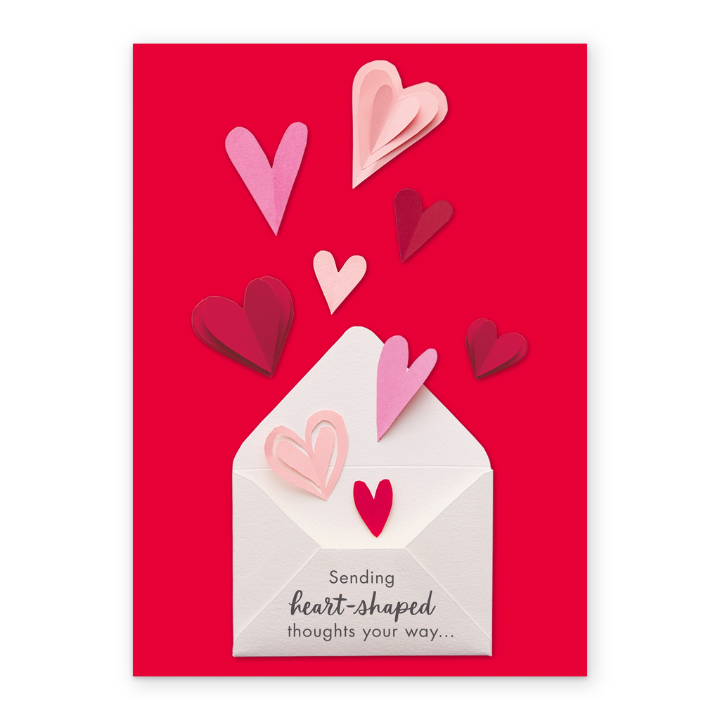 Printed on premium-quality board, this card features hearts exploding out of an envelope, with the message 'Sending heart-shaped thoughts your way…', and comes complete with a co-ordinating white envelope.