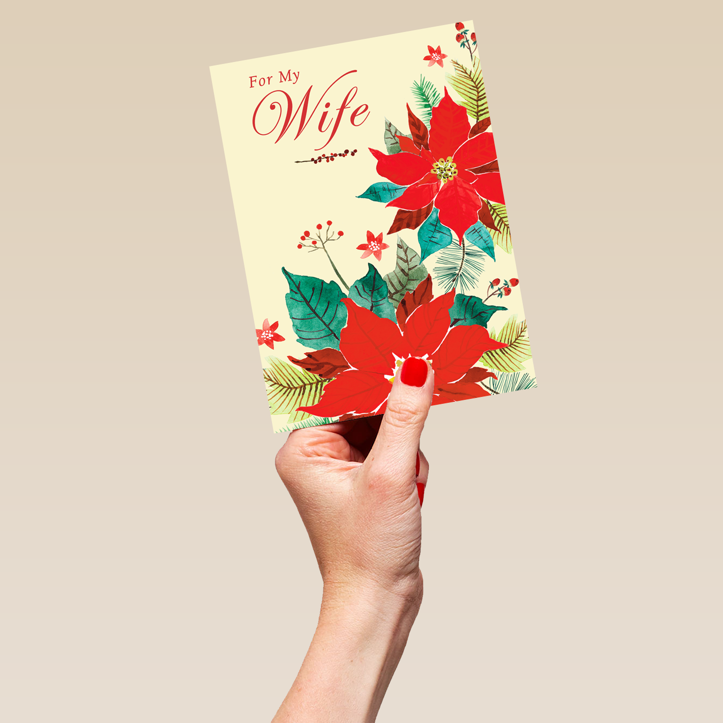 Show them you care with a personalised red poinsettia flowers wife card from Hallmark. Our Christmas cards are printed on premium quality, FSC®-certified card & delivered nationwide. This card is available as standard 12cm by 16.7cm and large 15.5cm by 21.6cm.