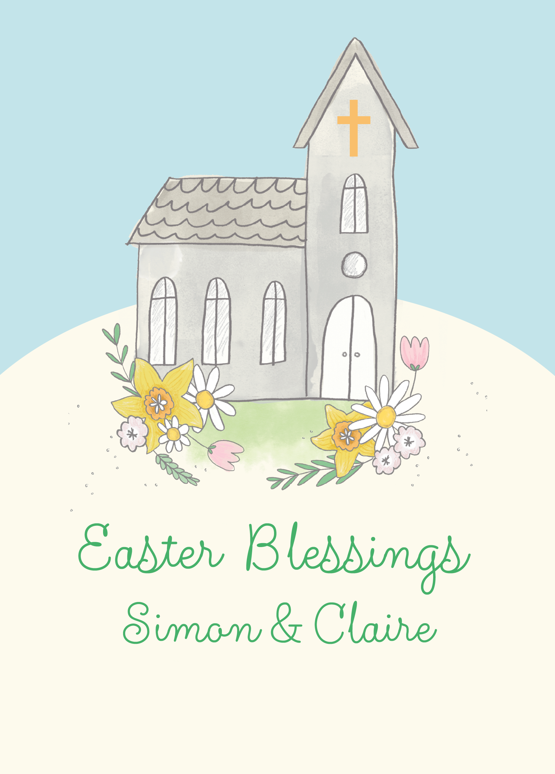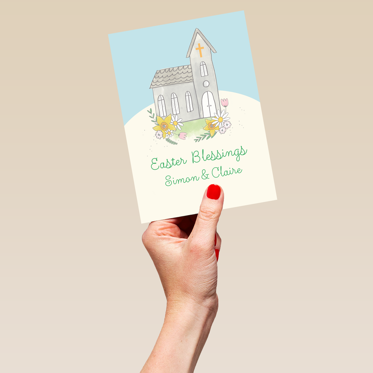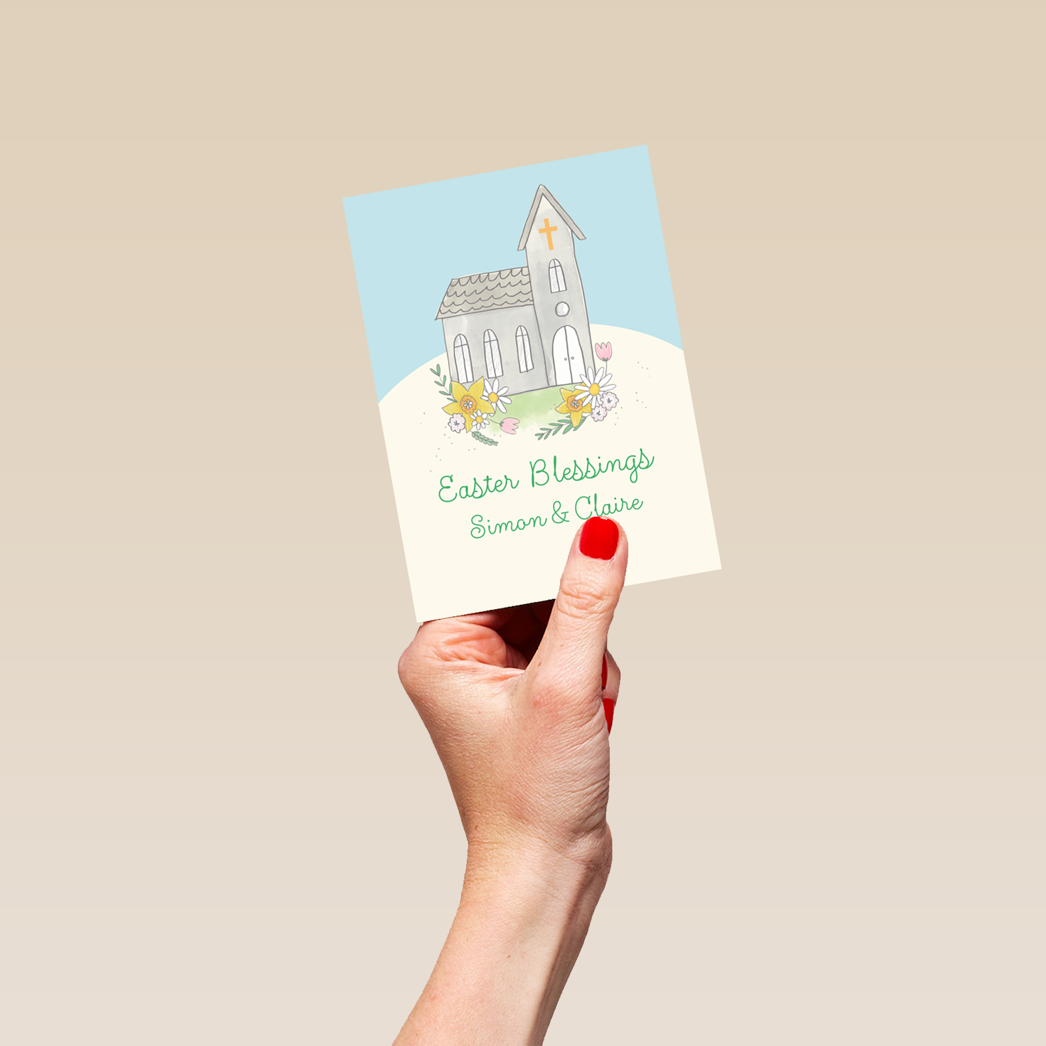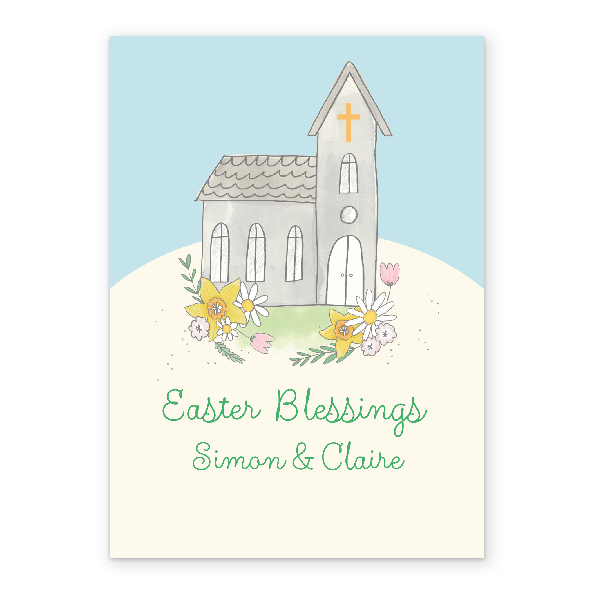 Printed on premium-quality board, this card features an illustrated hilltop church with colourful flowers, and a blue sky background, with the message 'Easter blessings', space to personalise a name, and comes complete with a co-ordinating white envelope.