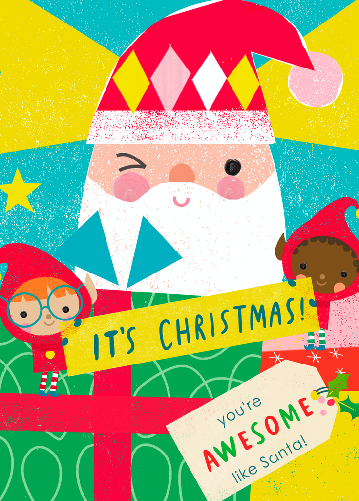 Show them you care with a personalised Santa awesome elf card from Hallmark. Our Christmas cards are printed on premium quality, FSC®-certified card & delivered nationwide. This card is available as standard 12cm by 16.7cm and large 15.5cm by 21.6cm.