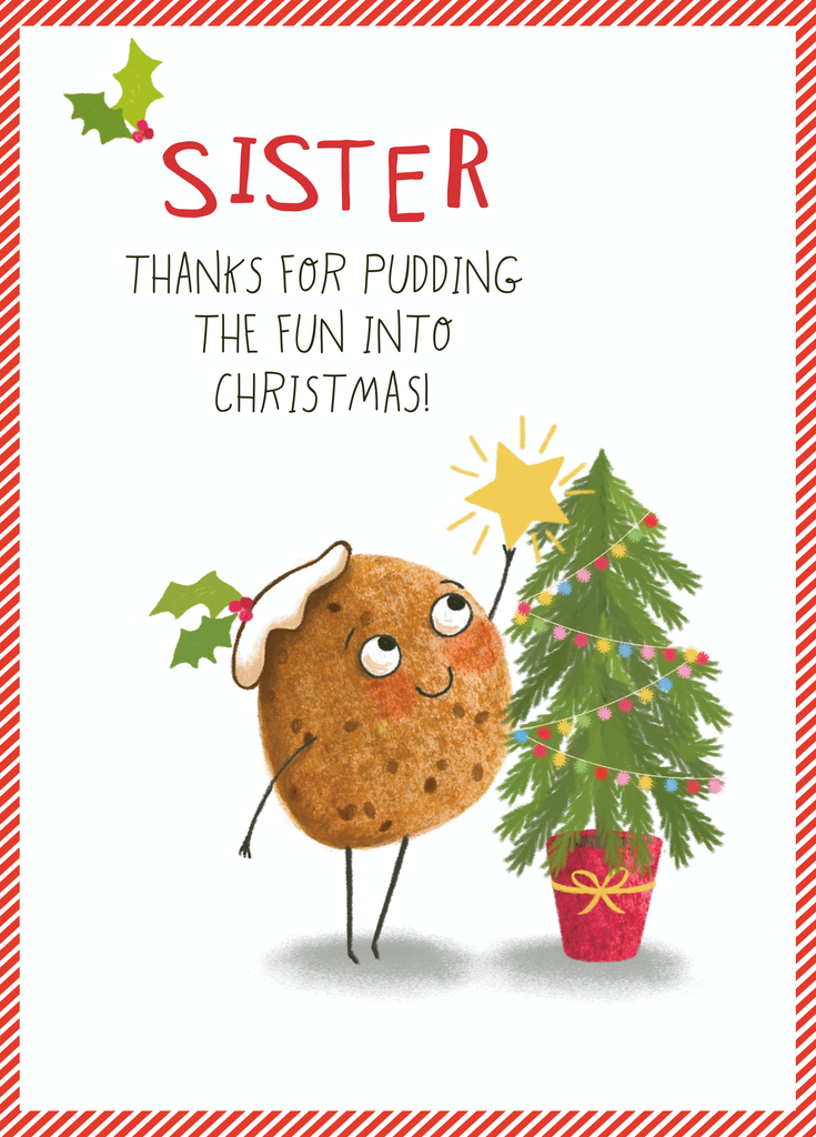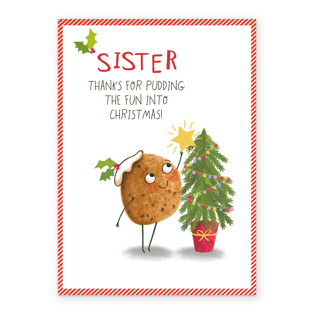 Show them you care with a personalised sister funny pudding Christmas card from Hallmark. Our greetings cards are printed on premium quality, FSC®-certified card & delivered nationwide. This card is available as standard 12cm by 16.7cm and large 15.5cm by 21.6cm.
