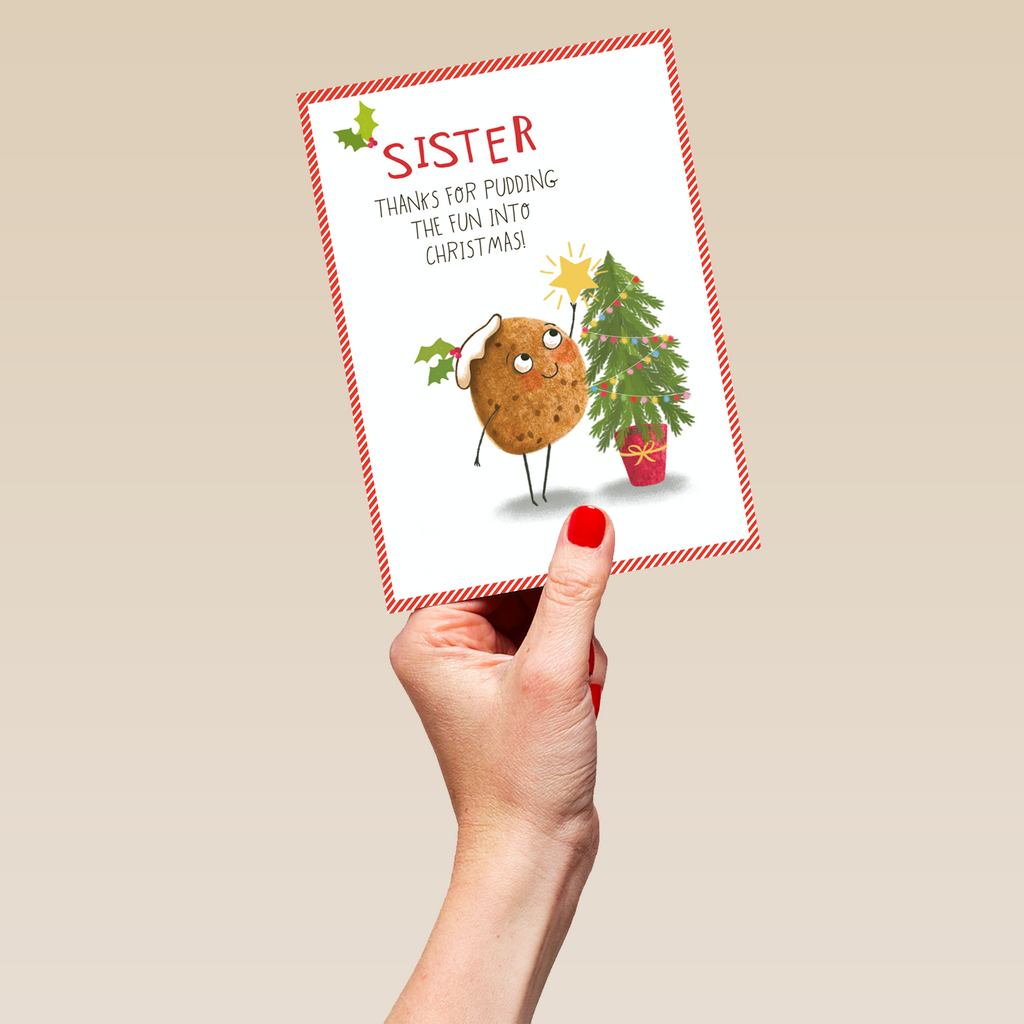 Personalised Sister Funny Pudding Christmas Card