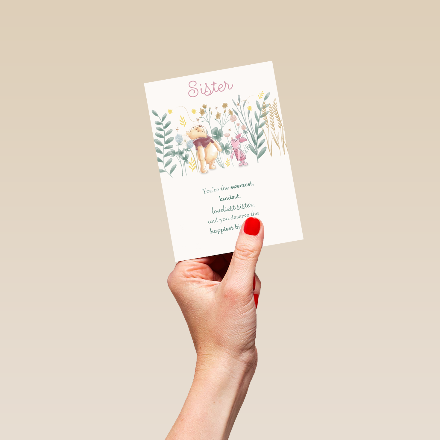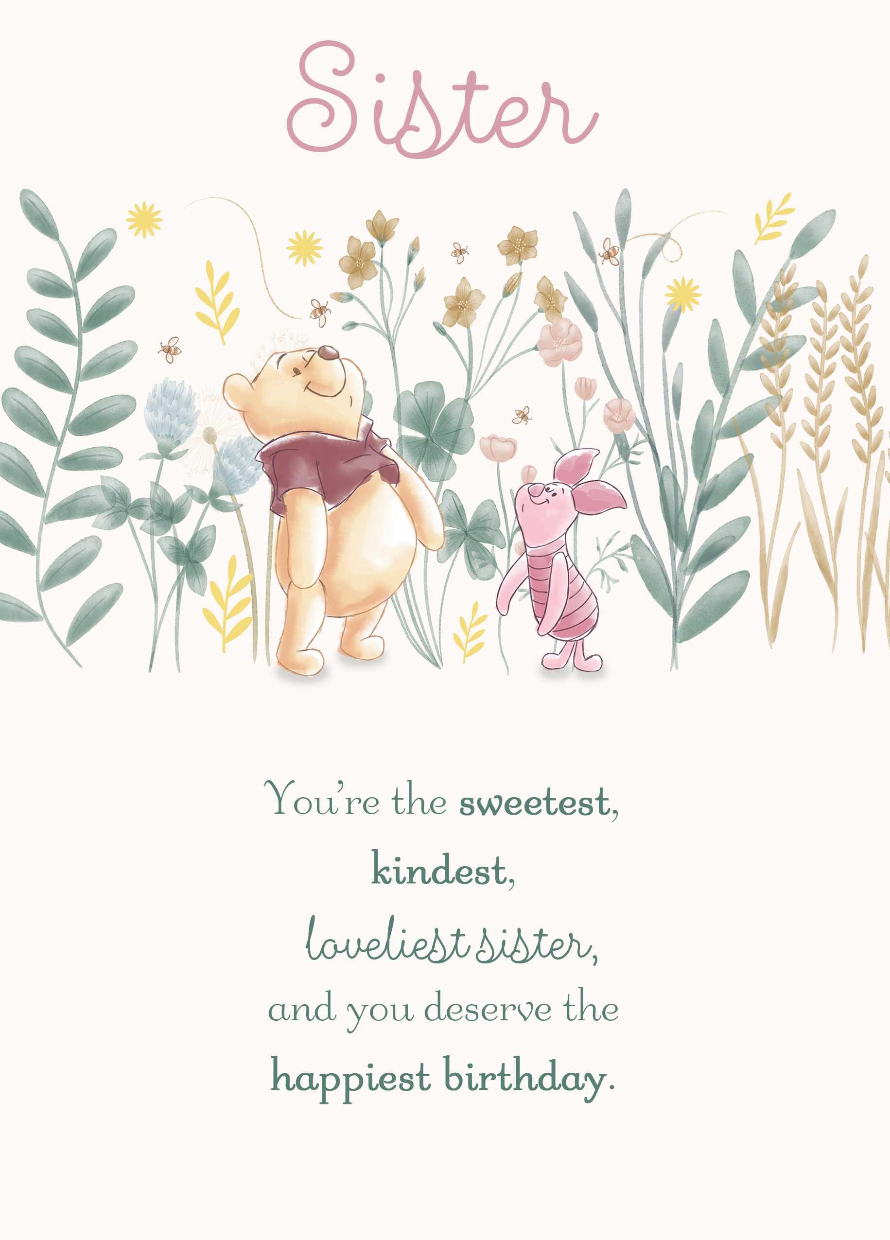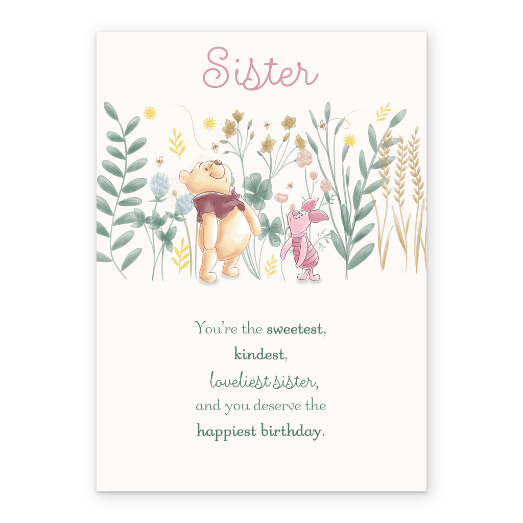 Printed on premium-quality board, this card features a floral design with Winnie the Pooh and Piglet, with the message ‘Sister, you're the sweetest, kindest, loveliest sister, and you deserve the happiest birthday', space to personalise a name, and comes complete with a co-ordinating white envelope.