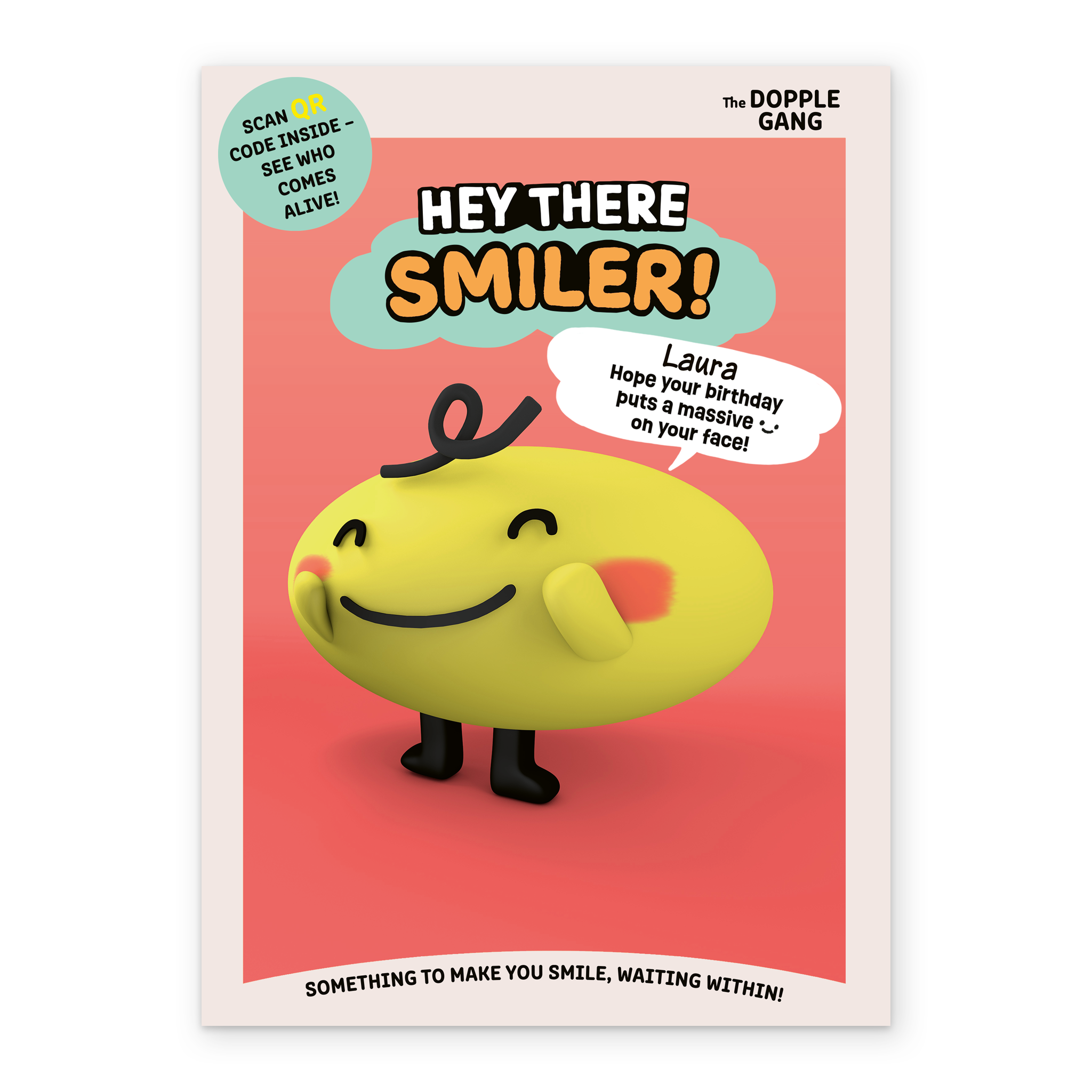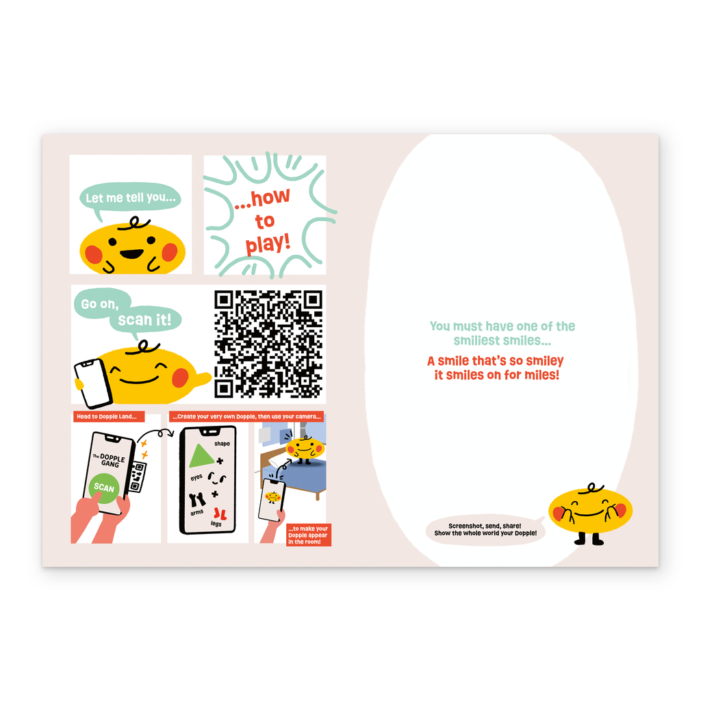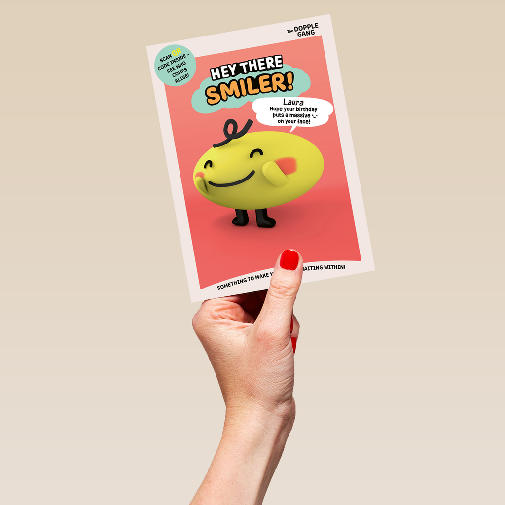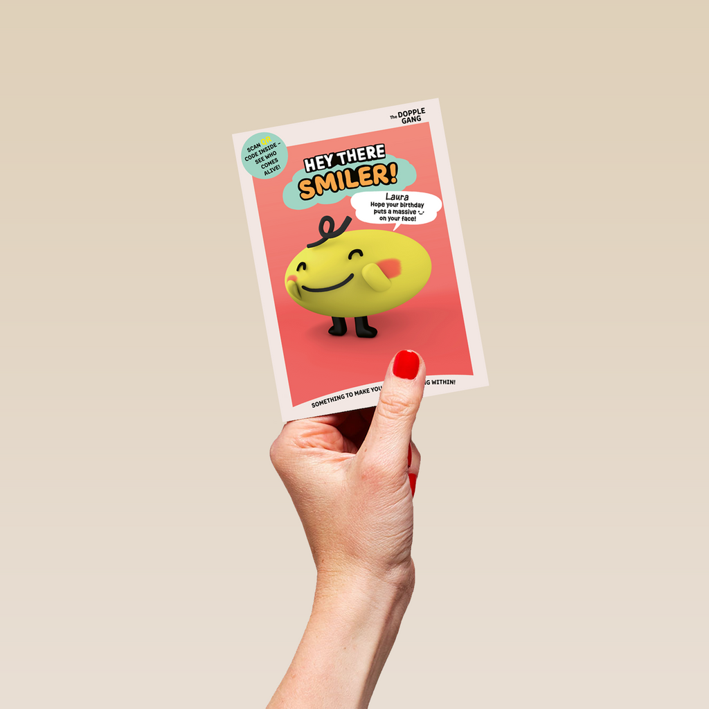 Printed on premium-quality board, this card features The Dopple Gang character Smiler, and includes a QR code you can scan to see the character come to life.