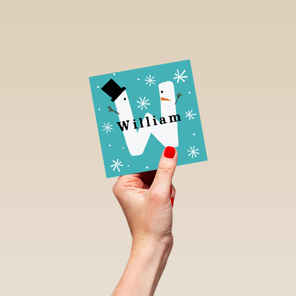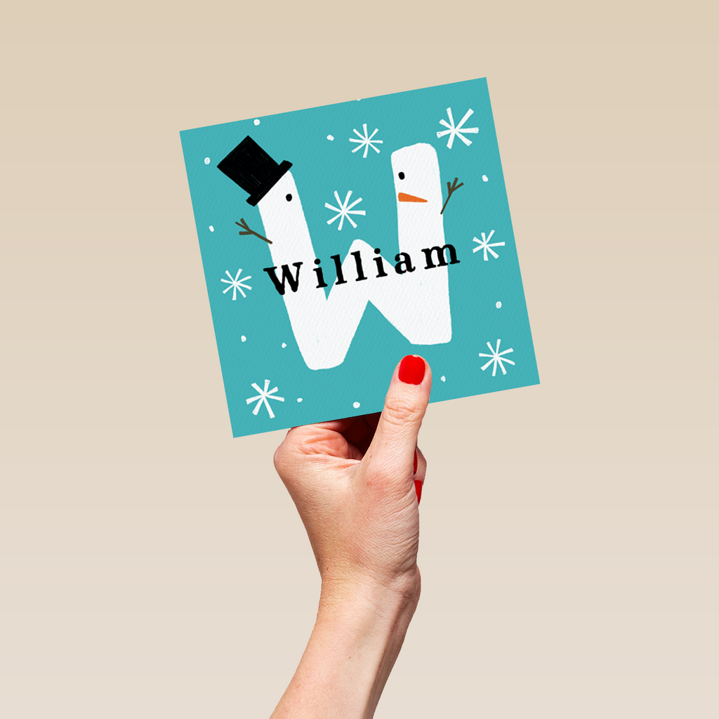Show them you care with a personalised snowman monogram letter W Christmas card from Hallmark. Our greetings cards are printed on premium quality, FSC®-certified card & delivered nationwide. This card is available as standard 12cm by 12cm and large 15cm by 15cm.