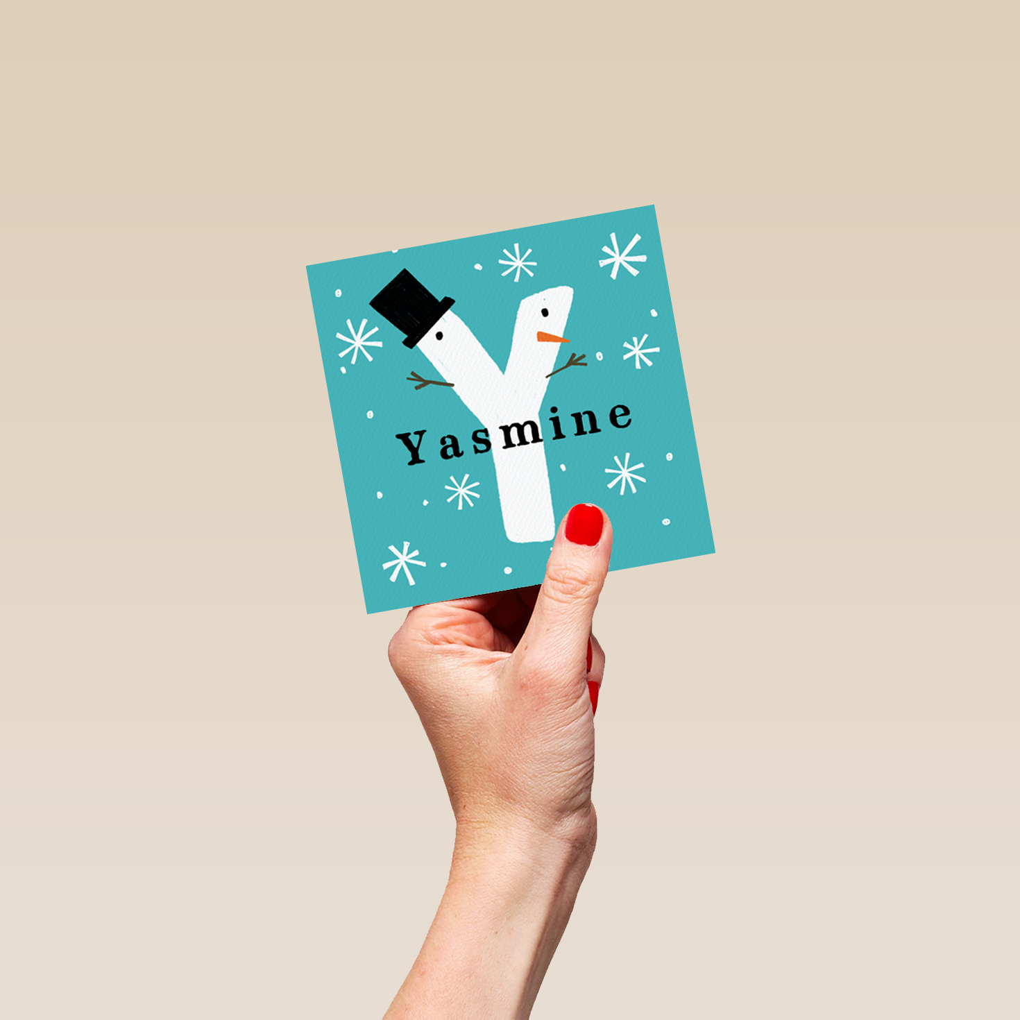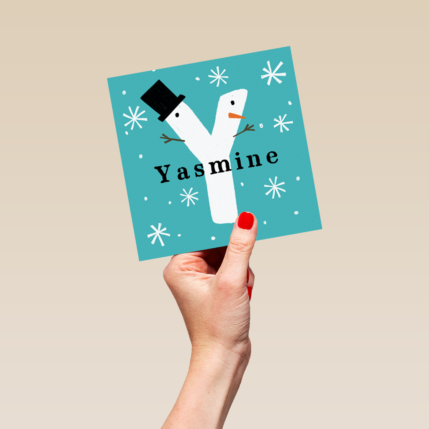 Show them you care with a personalised snowman monogram letter Y Christmas card from Hallmark. Our greetings cards are printed on premium quality, FSC®-certified card & delivered nationwide. This card is available as standard 12cm by 12cm and large 15cm by 15cm.