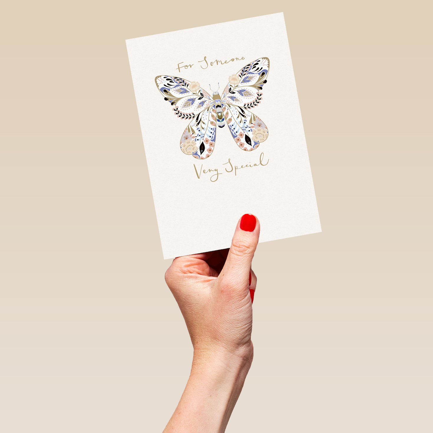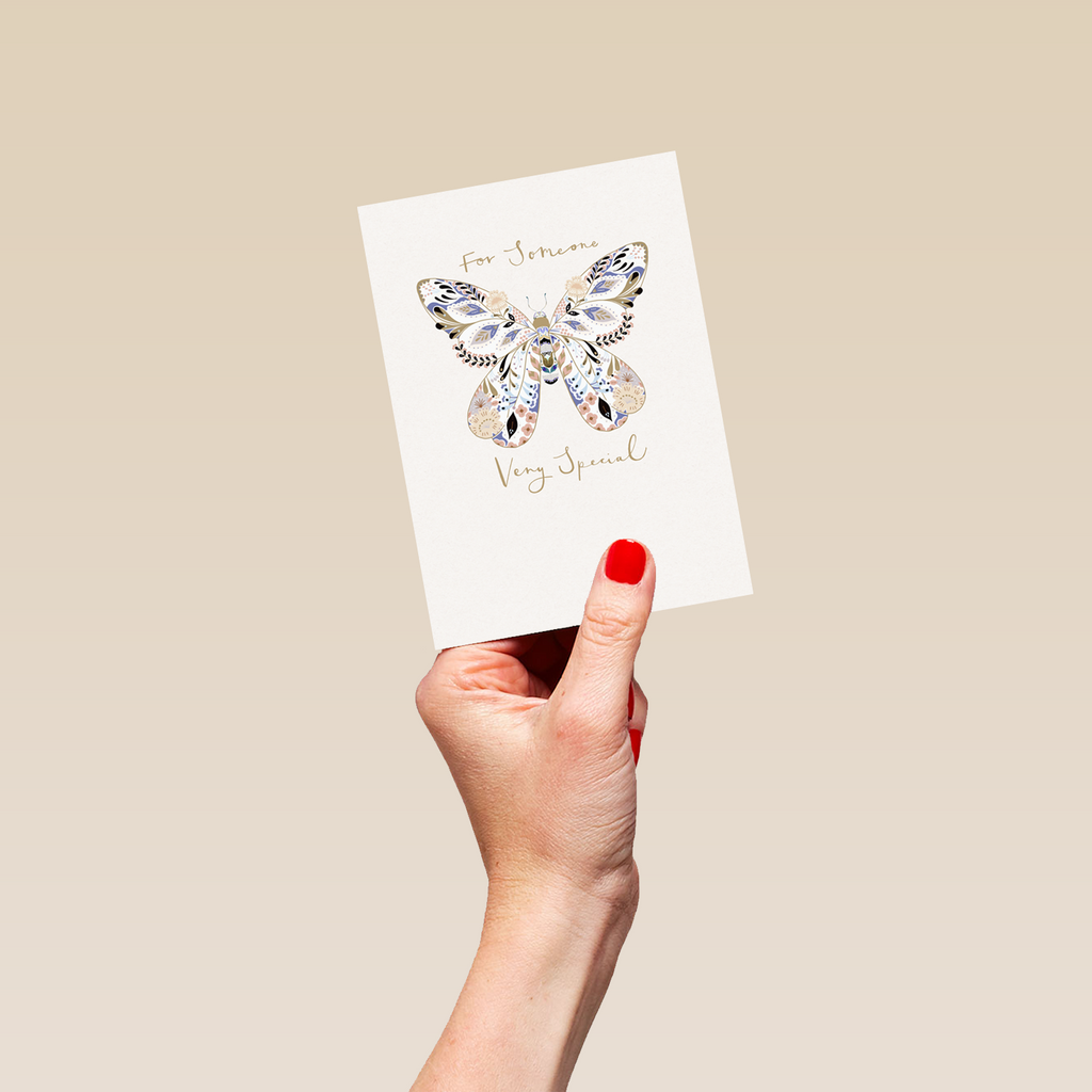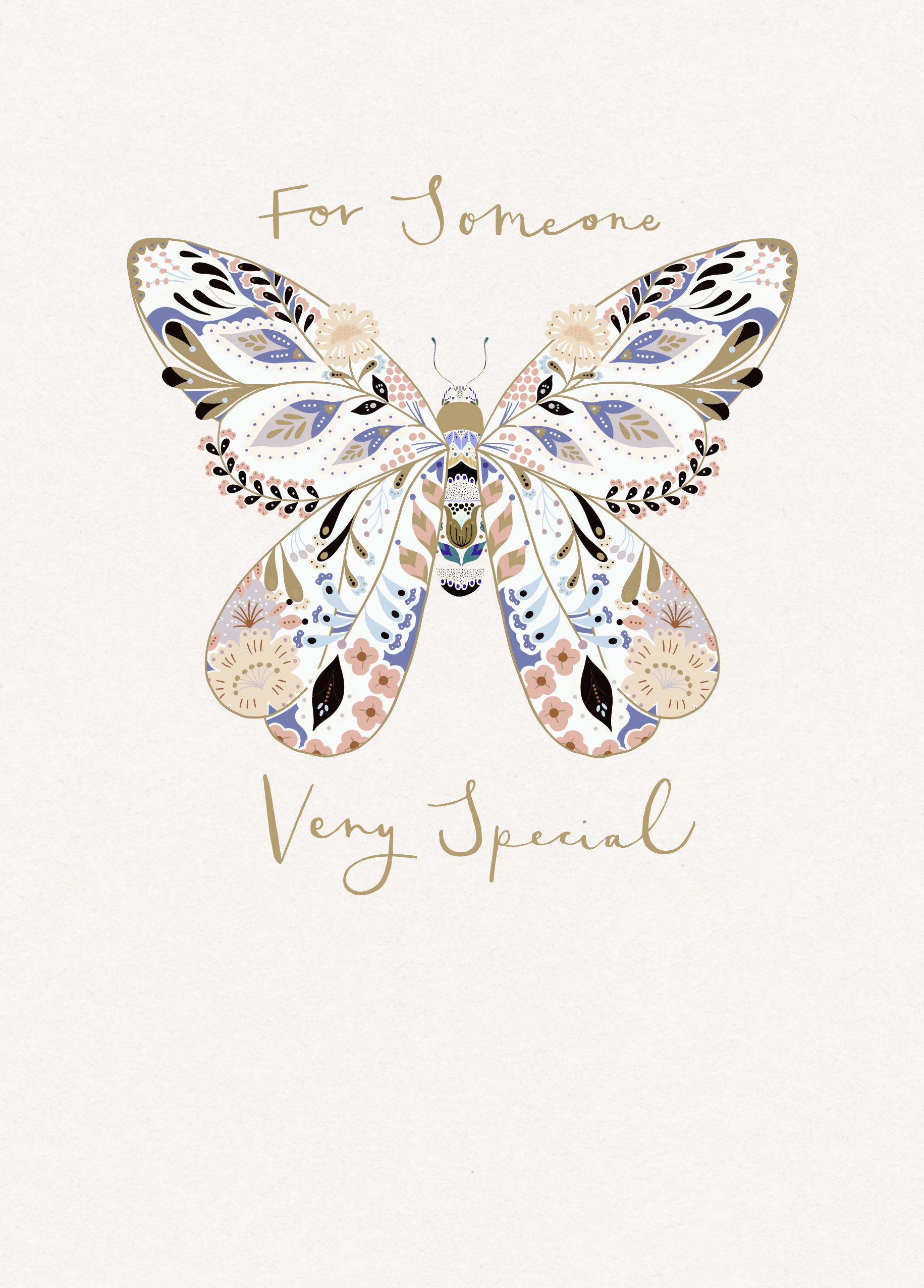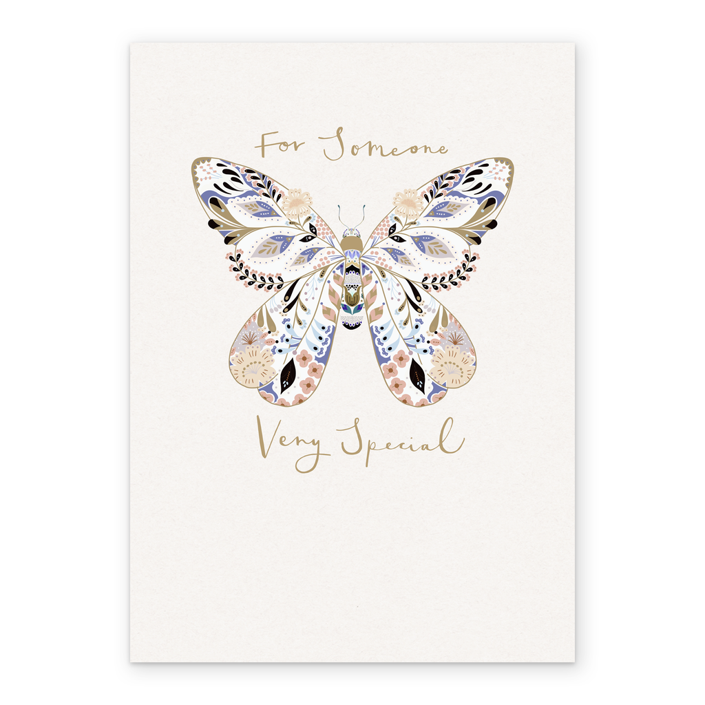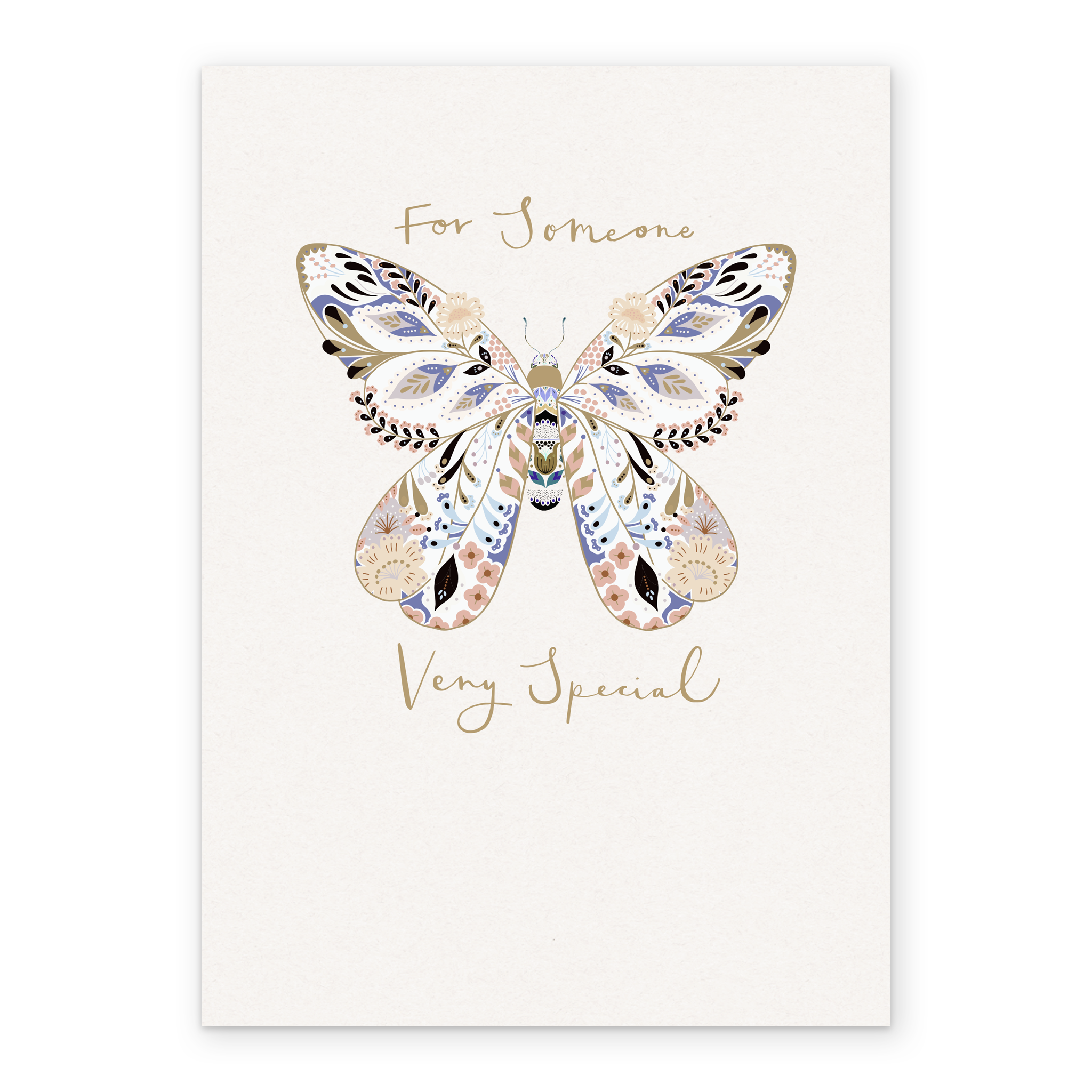 Printed on premium-quality board, this card features an ornate, delicately coloured butterfly on a light cream background, with the message 'For someone very special', and comes complete with a co-ordinating white envelope.