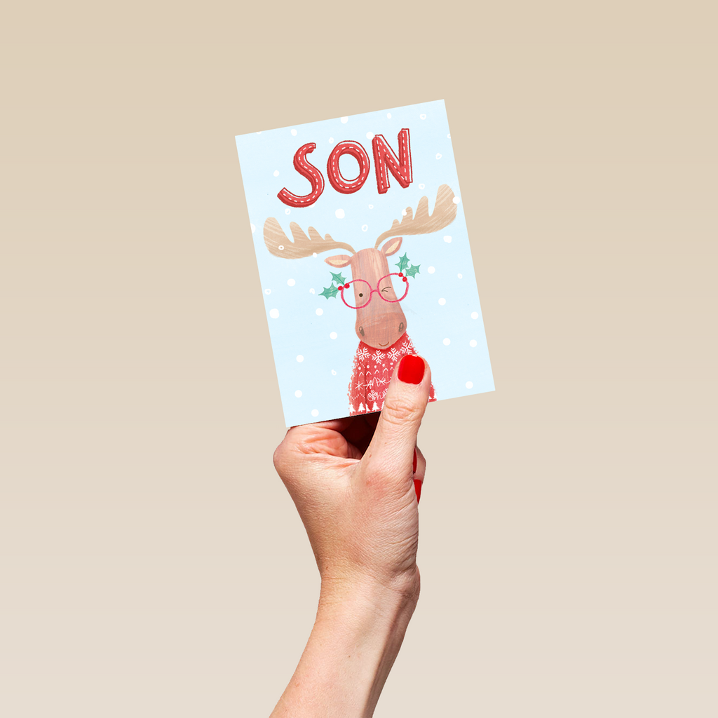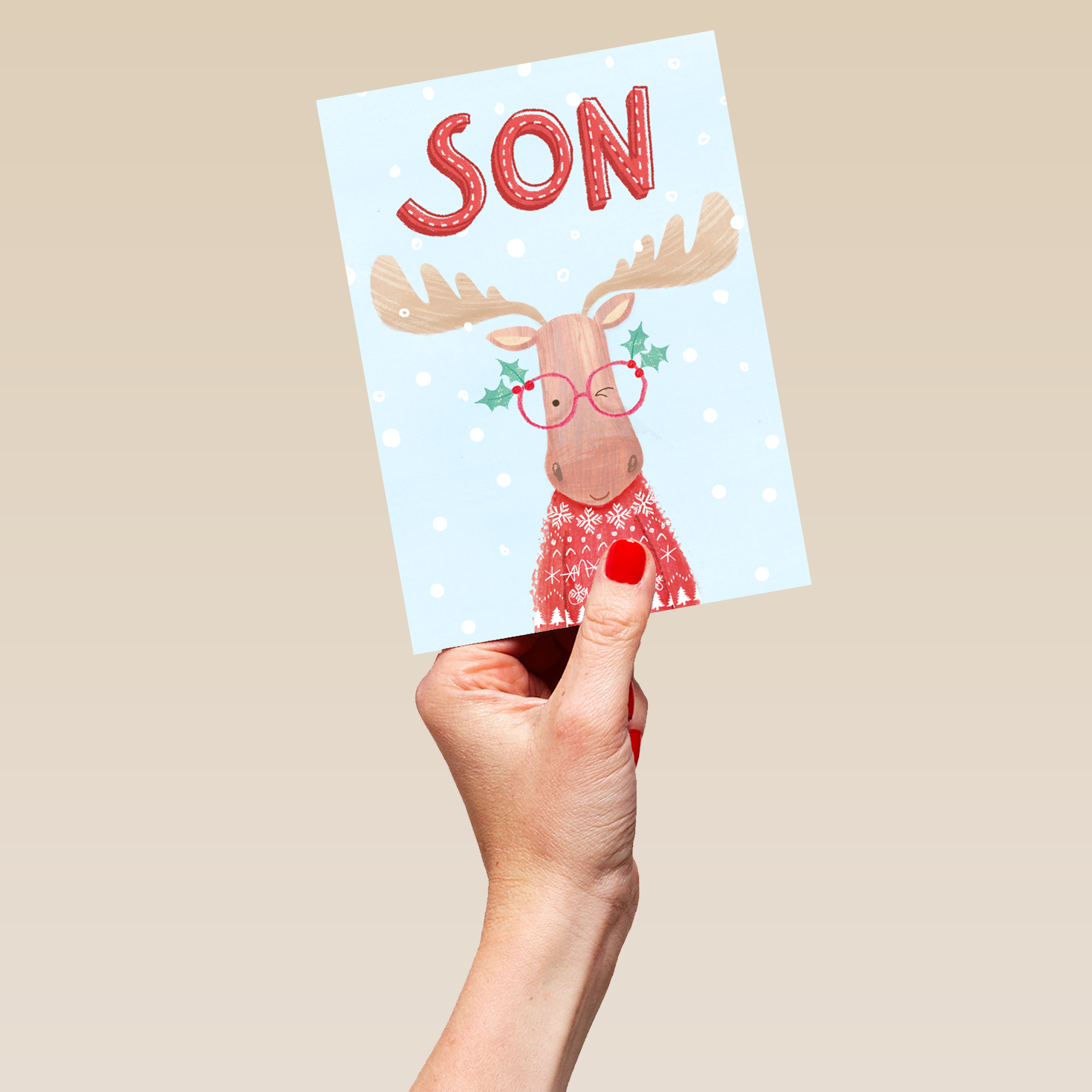 Show them you care with a personalised son cute winking reindeer Christmas card from Hallmark. Our greetings cards are printed on premium quality, FSC®-certified card & delivered nationwide. This card is available as standard 12cm by 16.7cm and large 15.5cm by 21.6cm.