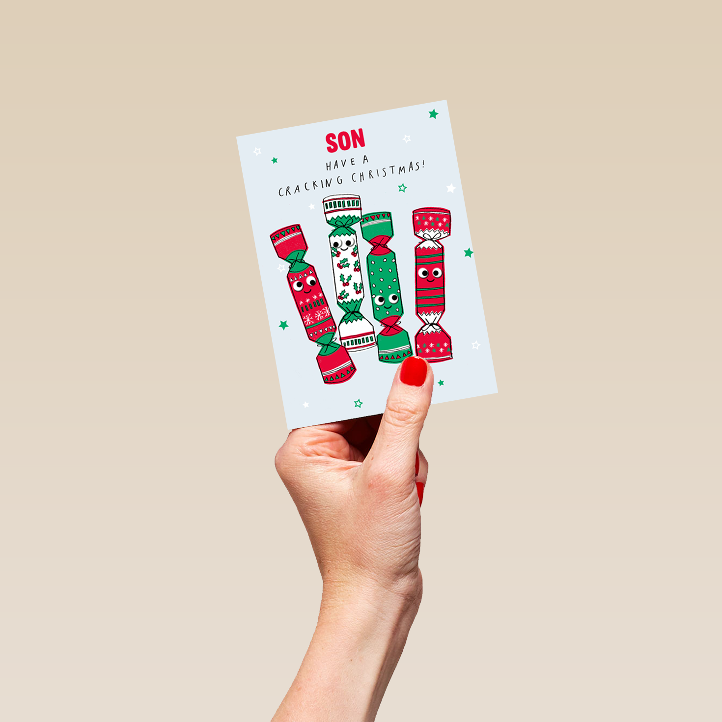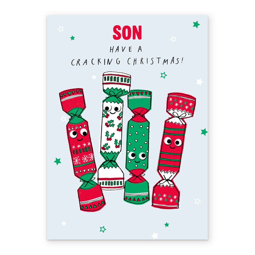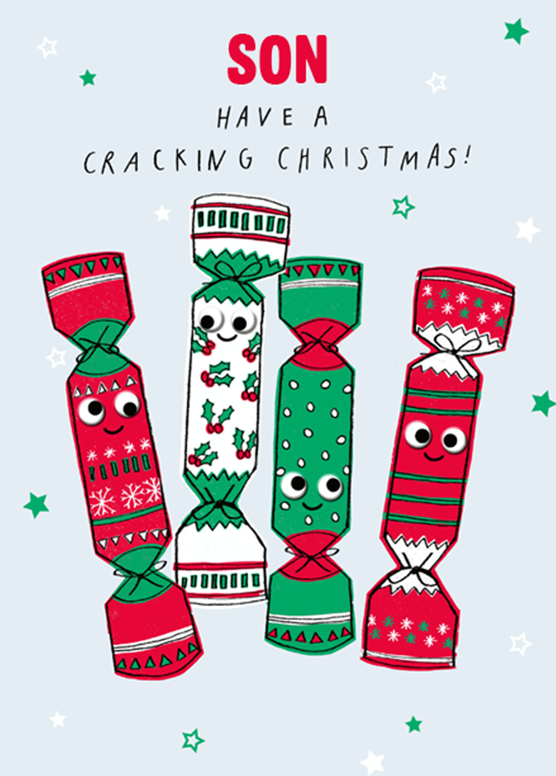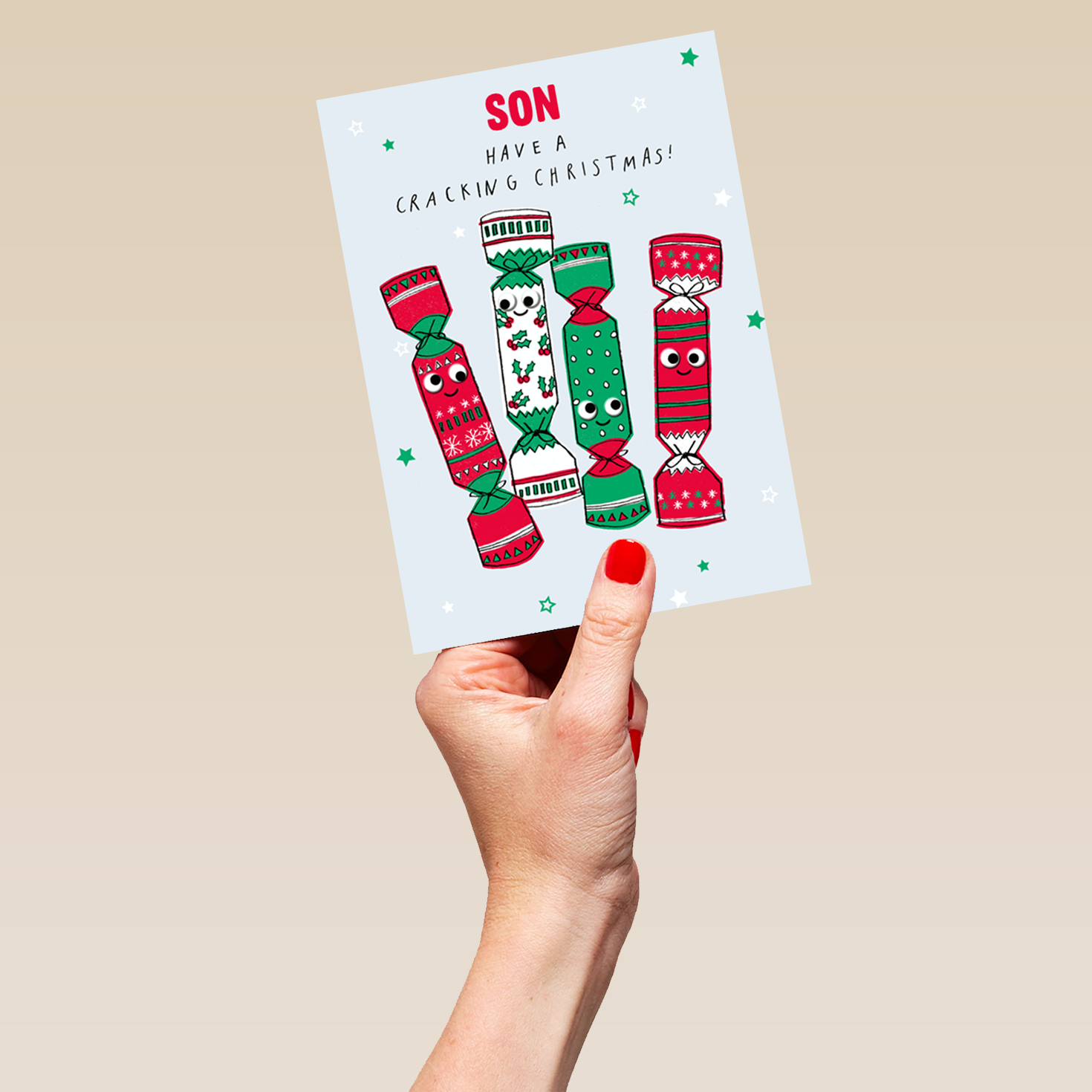 Show them you care with a personalised son festive crackers Christmas card from Hallmark. Our greetings cards are printed on premium quality, FSC®-certified card & delivered nationwide. This card is available as standard 12cm by 16.7cm and large 15.5cm by 21.6cm.