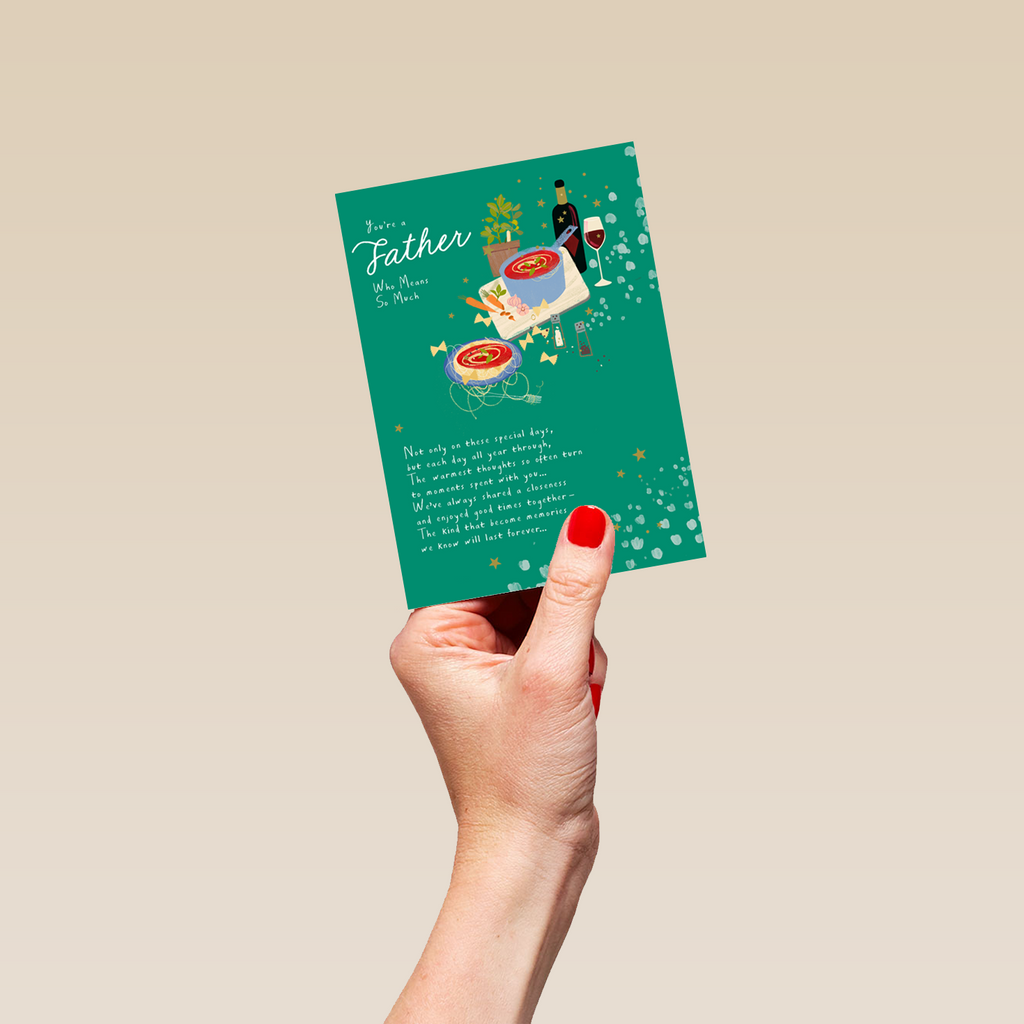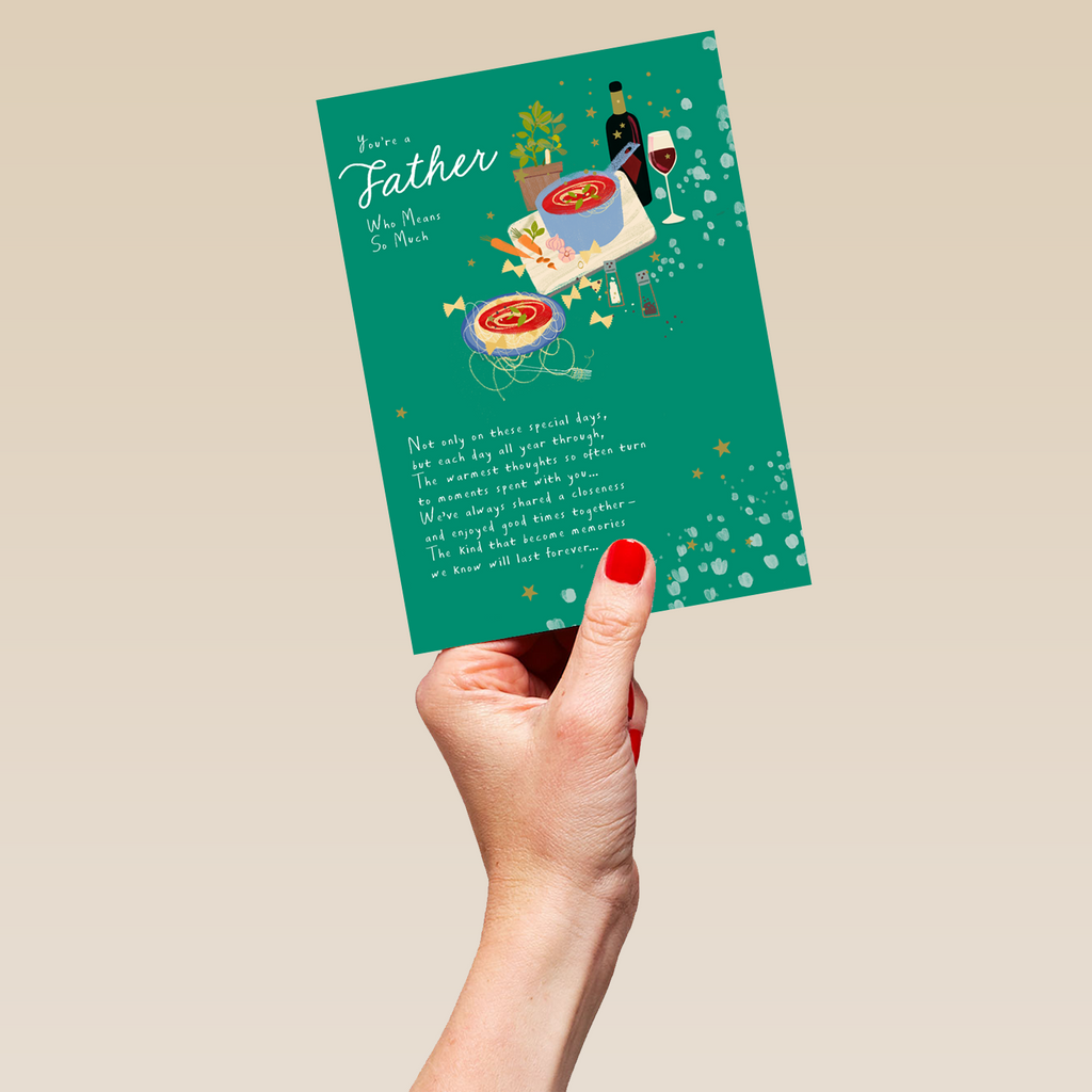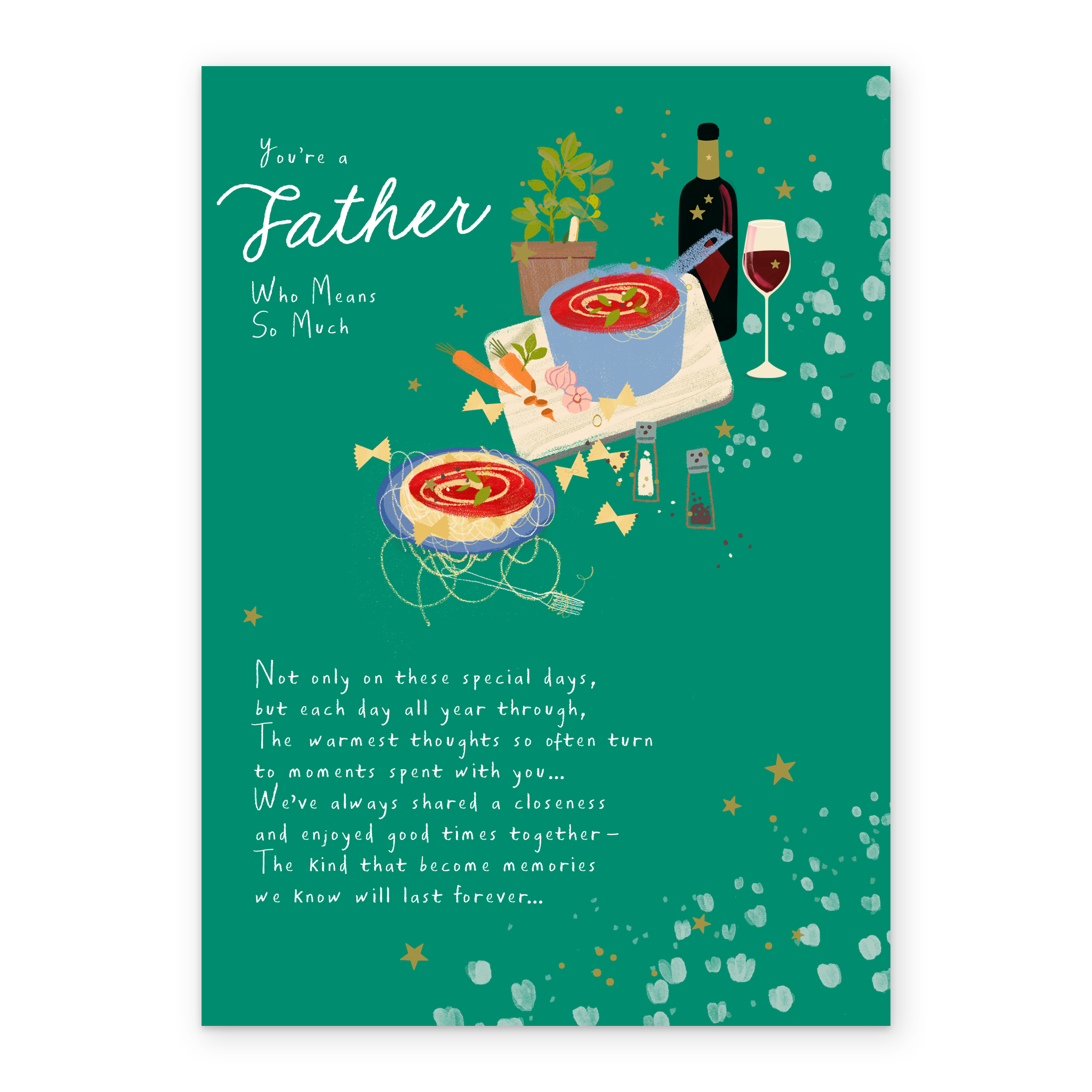 Printed on premium-quality board, this card features a sweet illustration with wine, a meal and herbs, with the message 'You're a Father Who Means So Much. Not only on these special days, but each day all year through, The warmest thoughts so often turn to moments spent with you... We've always shared a closeness and enjoyed good times together - The kind that become memories we know will last forever...', and comes complete with a co-ordinating white envelope.