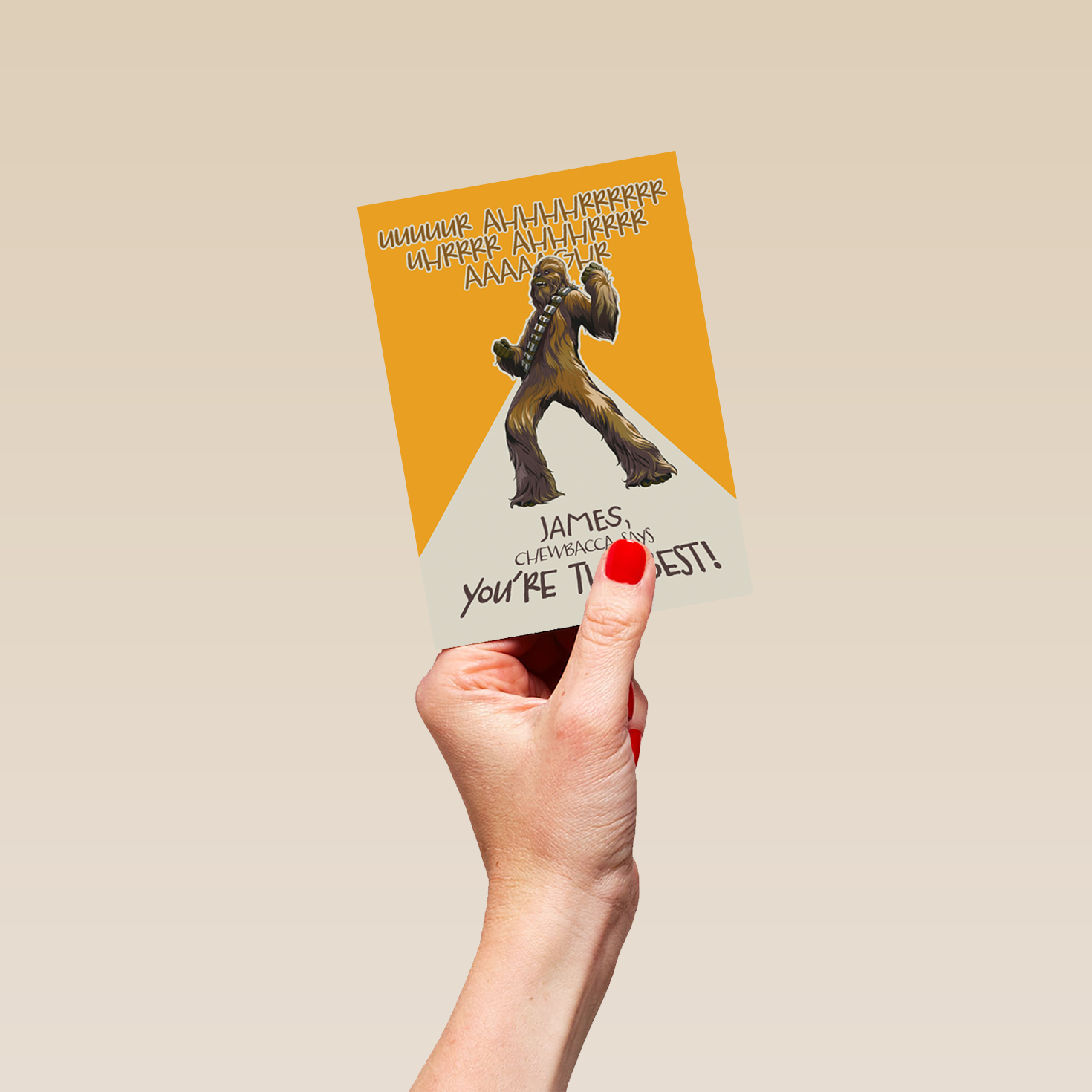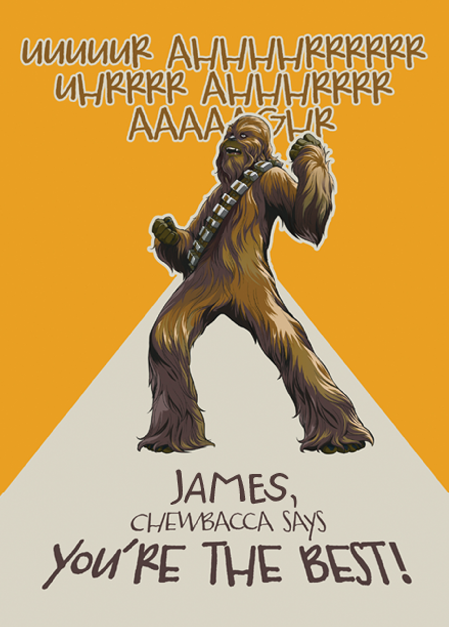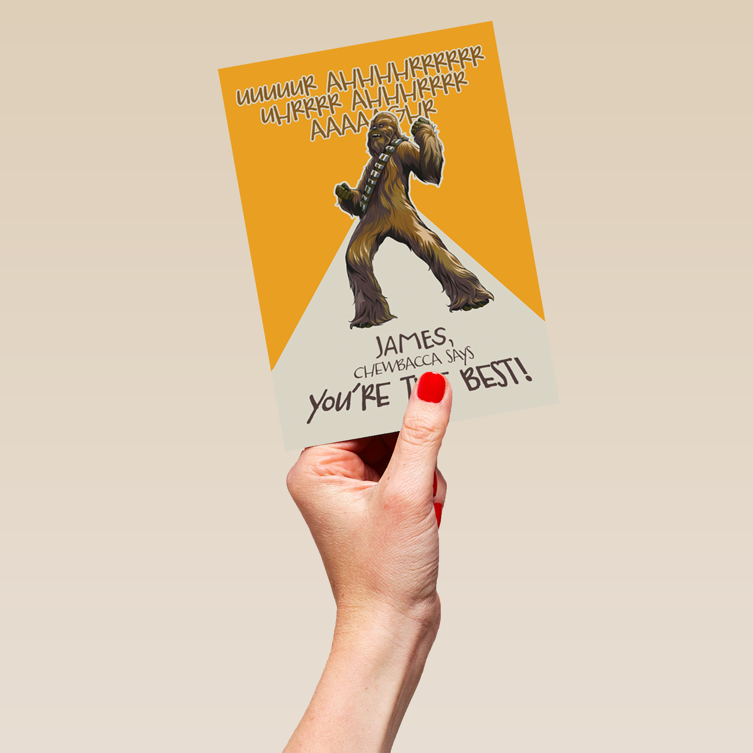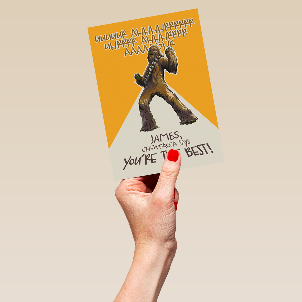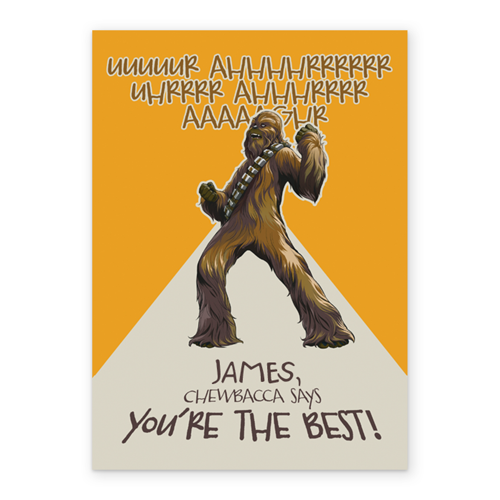 Show them you care with a personalised Disney Star Wars™ Chewbacca birthday card from Hallmark. Our greetings cards are printed on premium quality, FSC®-certified card & delivered nationwide. This card is available as standard 12cm by 16.7cm and large 15.5cm by 21.6cm.