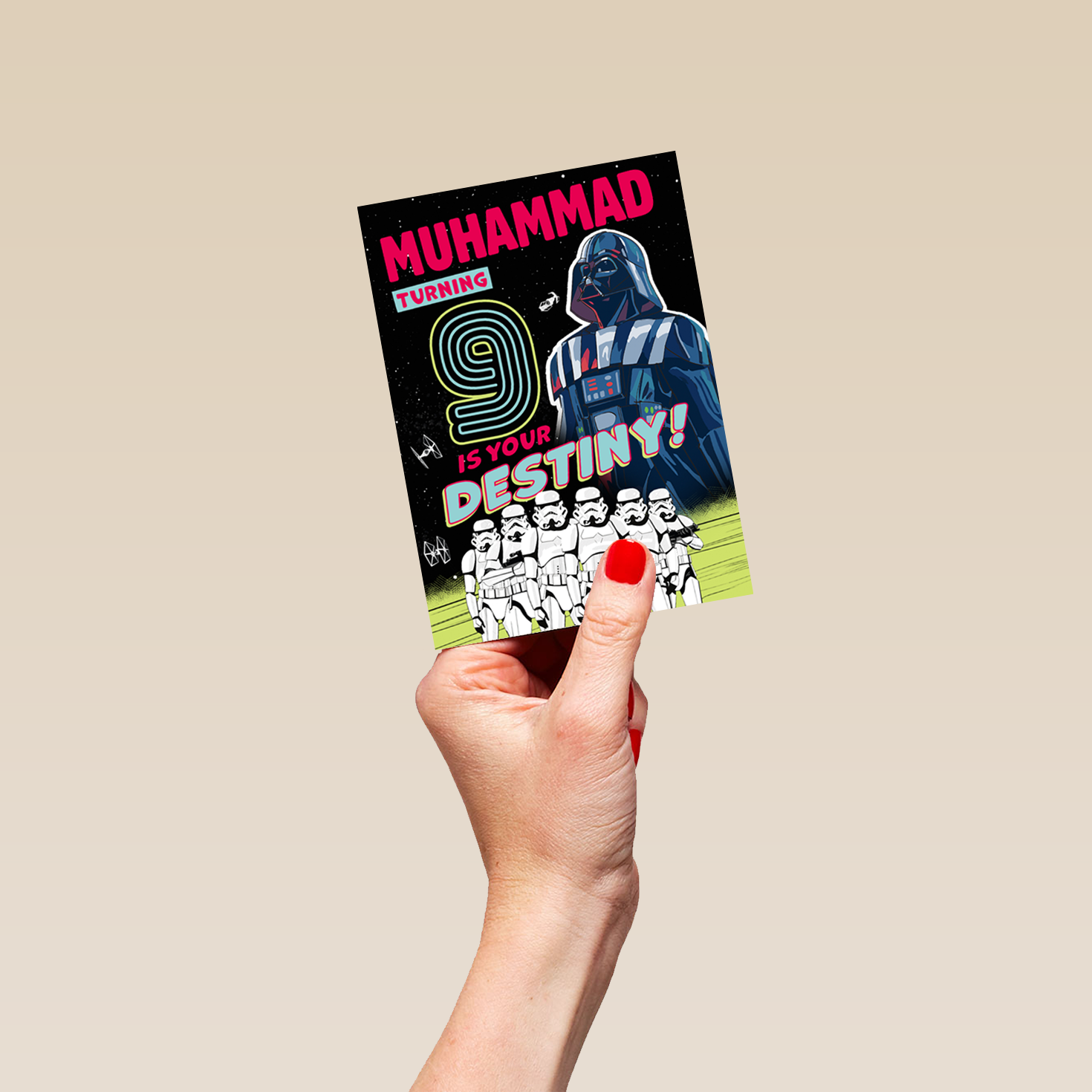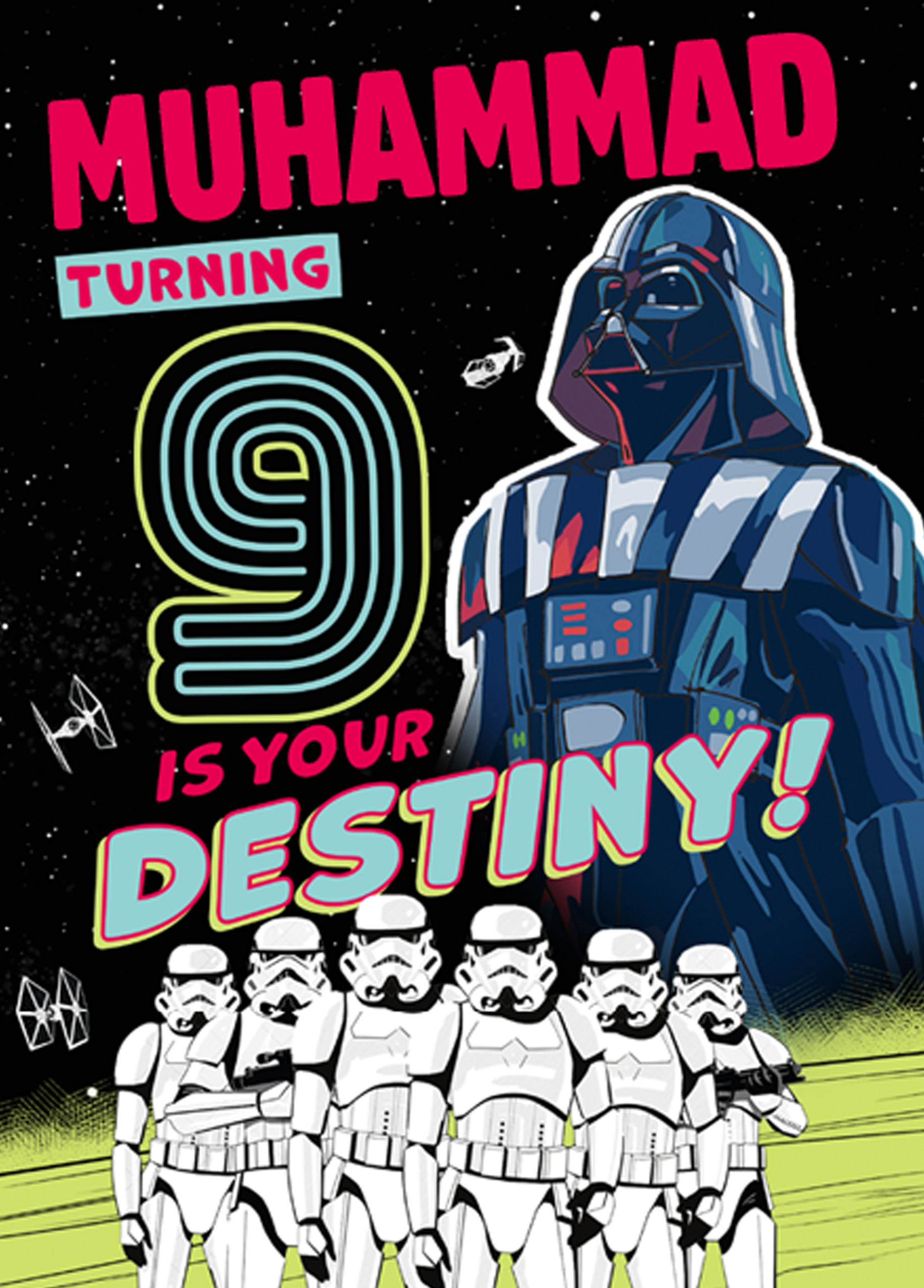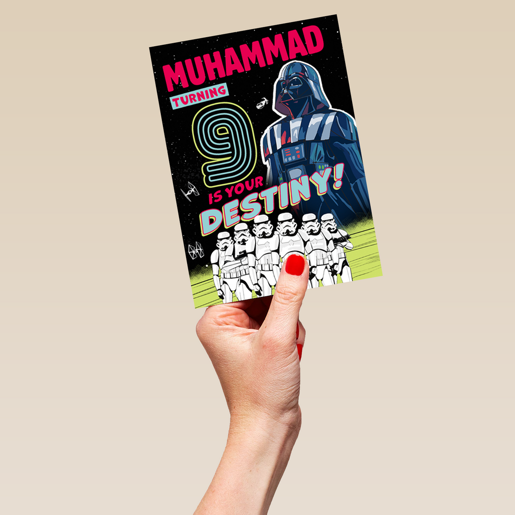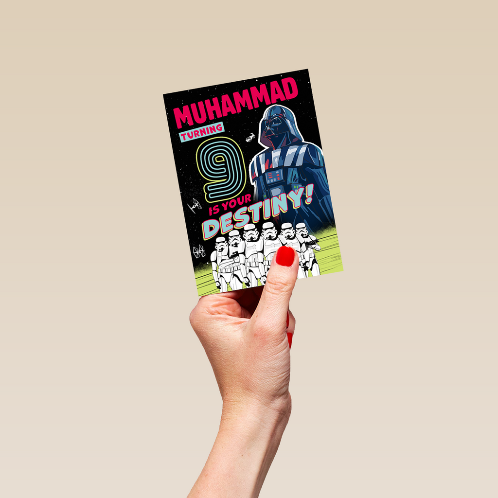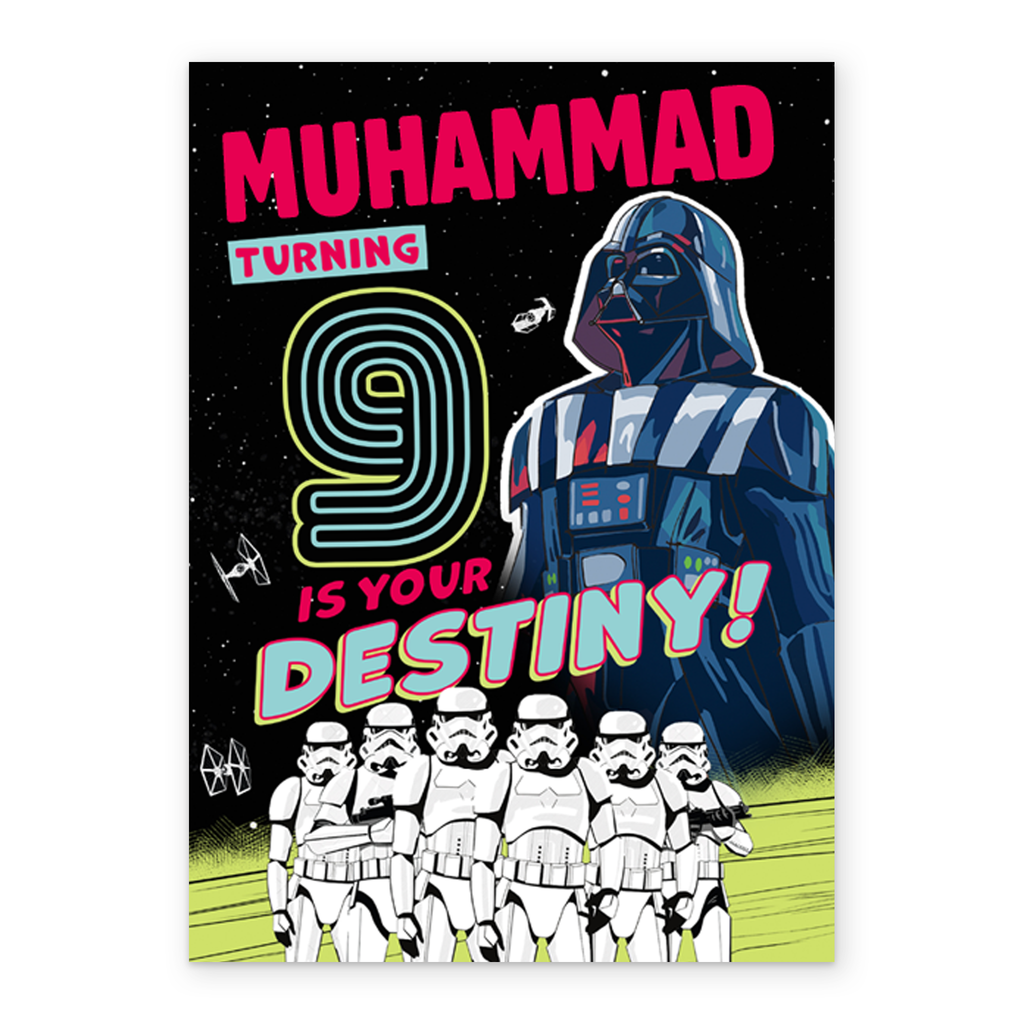 Show them you care with a personalised Disney Star Wars™ empire 9th birthday card from Hallmark. Our greetings cards are printed on premium quality, FSC®-certified card & delivered nationwide. This card is available as standard 12cm by 16.7cm and large 15.5cm by 21.6cm.