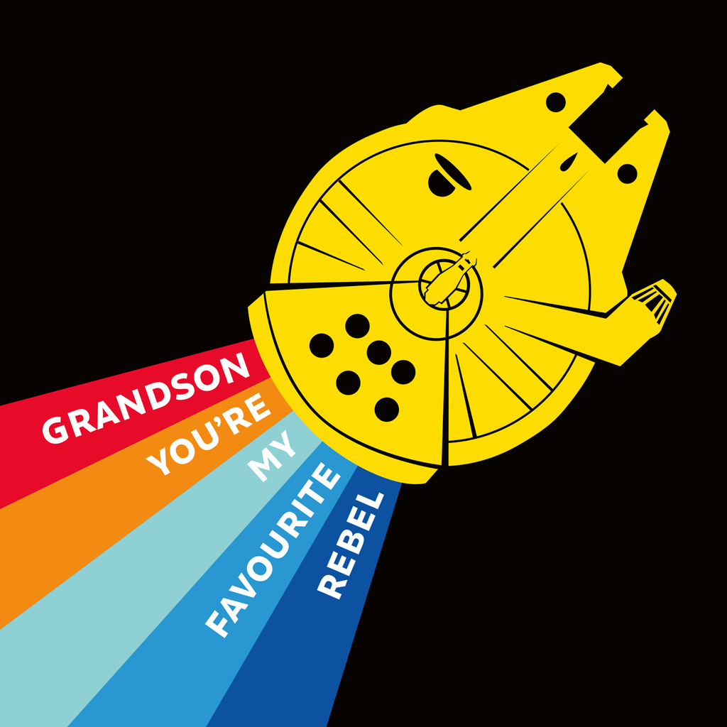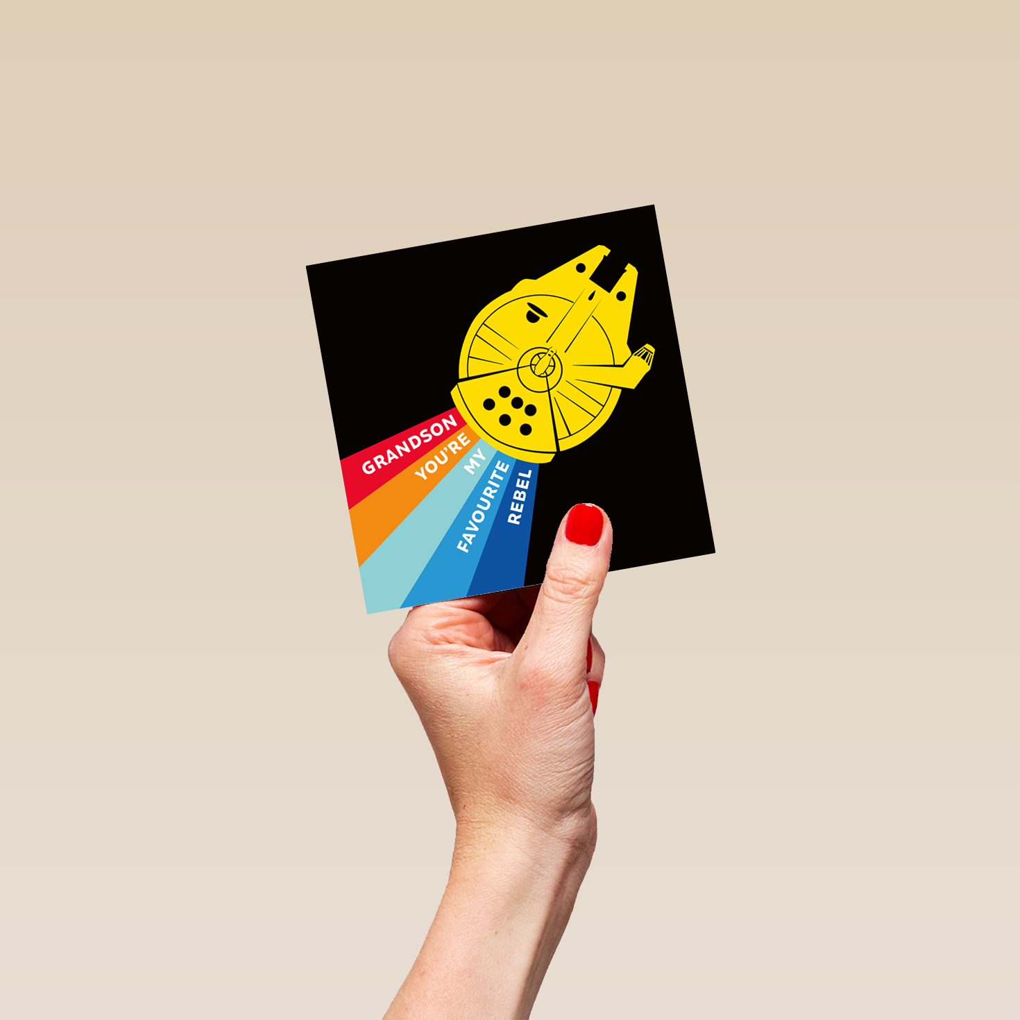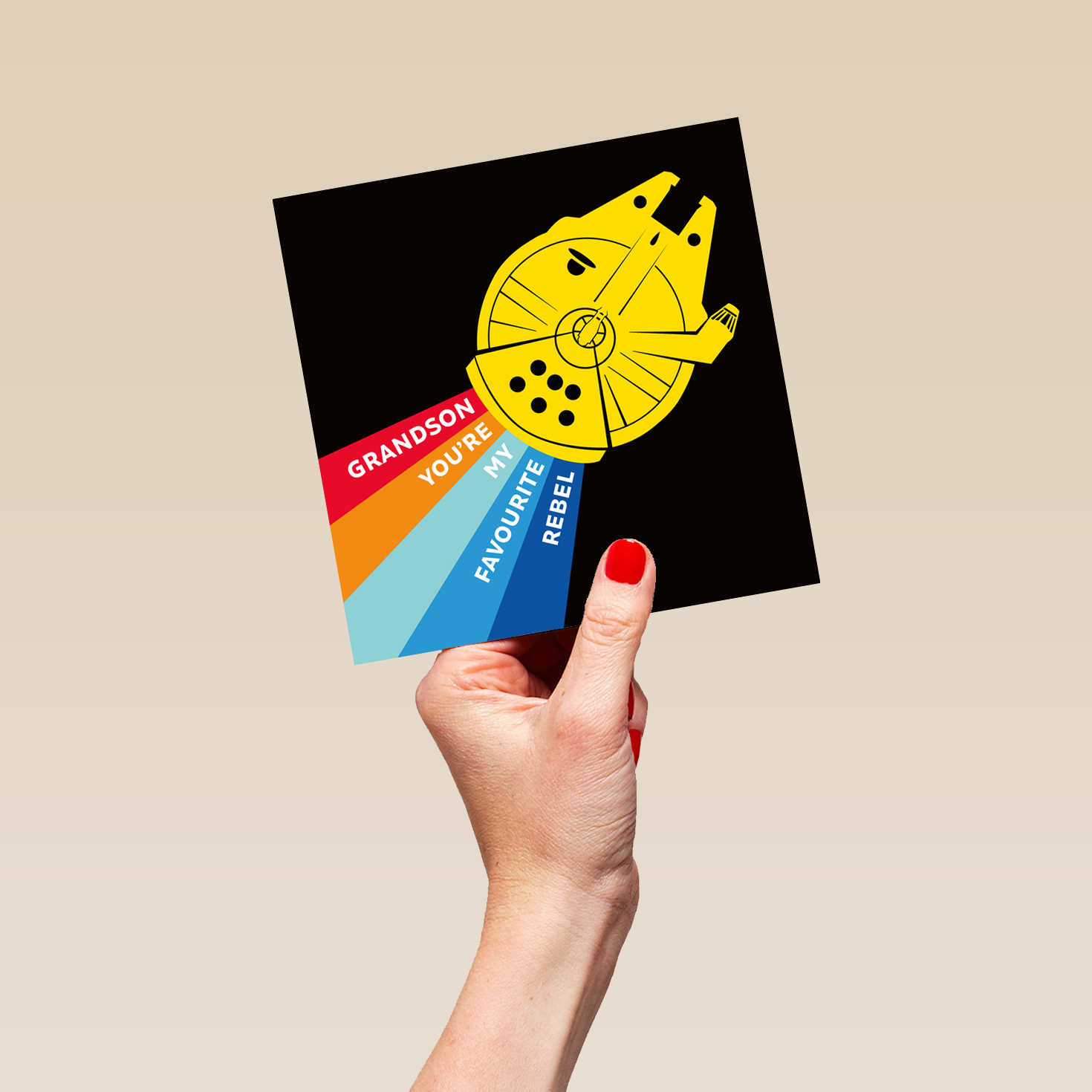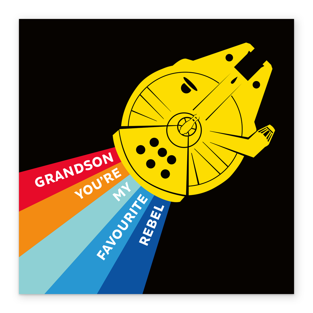 Printed on premium-quality board, this card features a retro-styled Millennium falcon with bright colourful contrail lines, with the message 'Grandson, you're my favourite rebel', space to personalise your message, and comes complete with a co-ordinating white envelope.