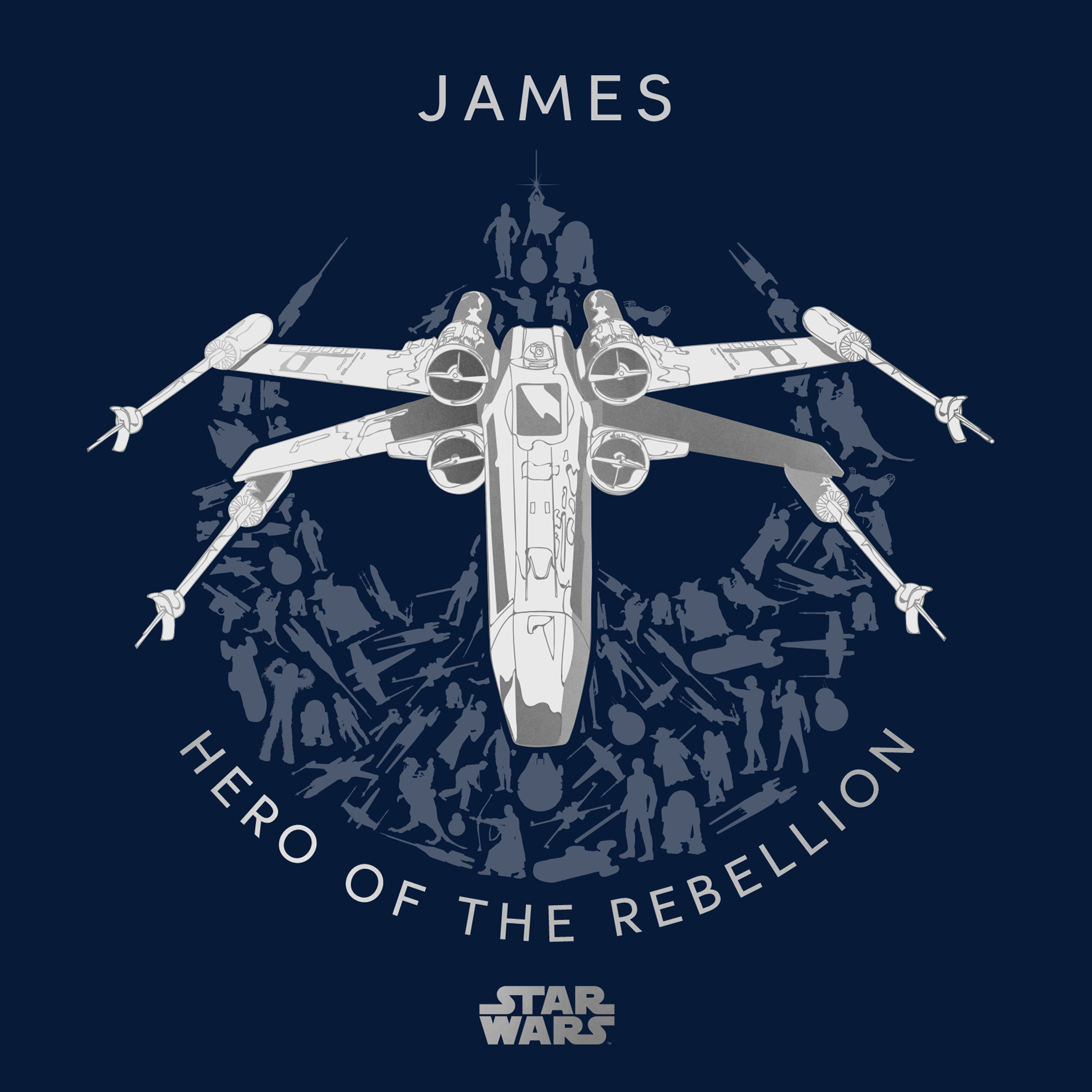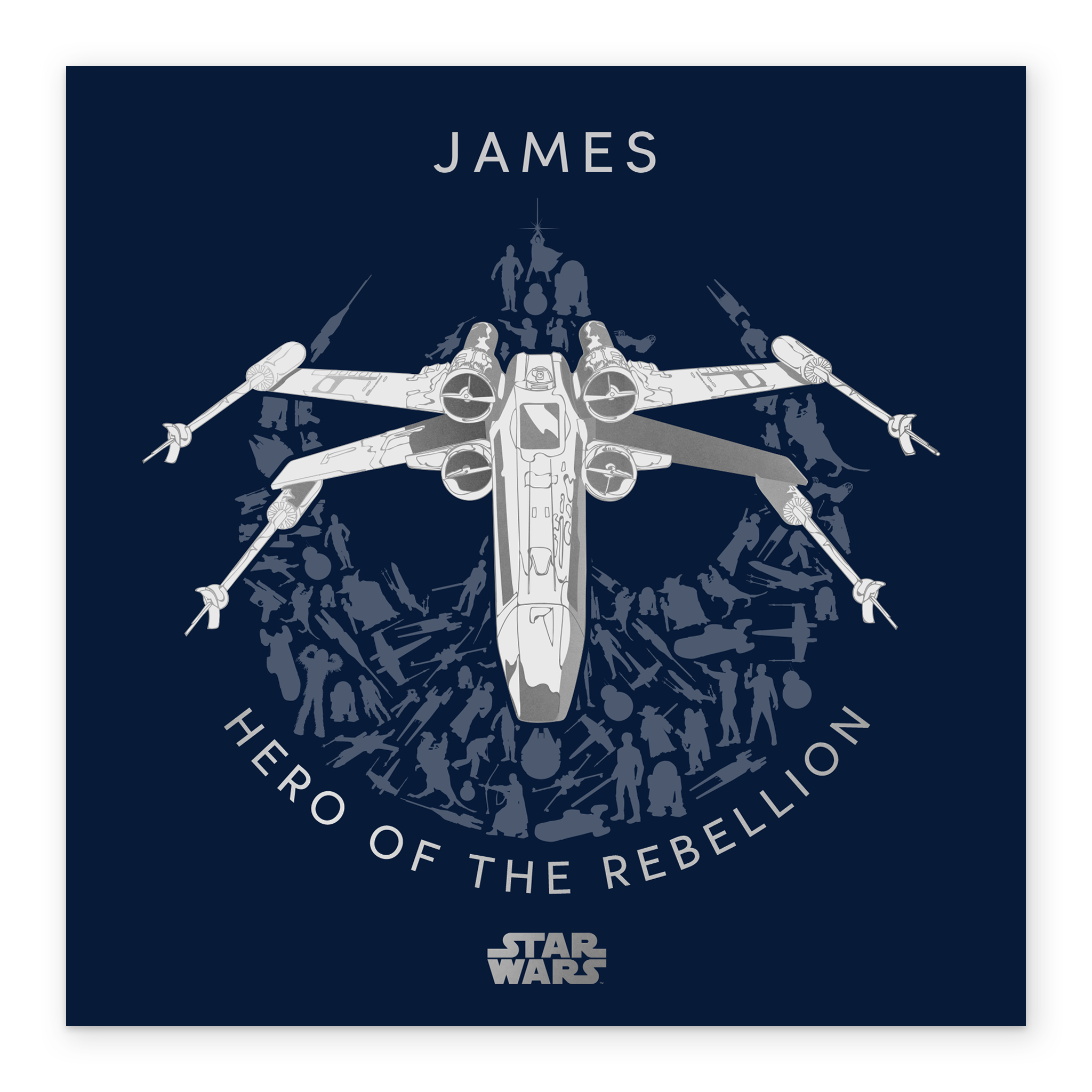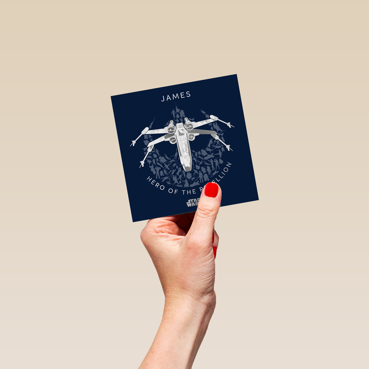Printed on premium-quality board, this card features an epic illustration pf the X-wing ship and Star Wars™ character silhouettes in the shape of the rebel alliance symbol.
