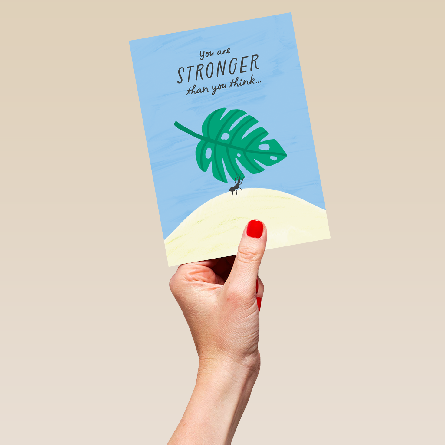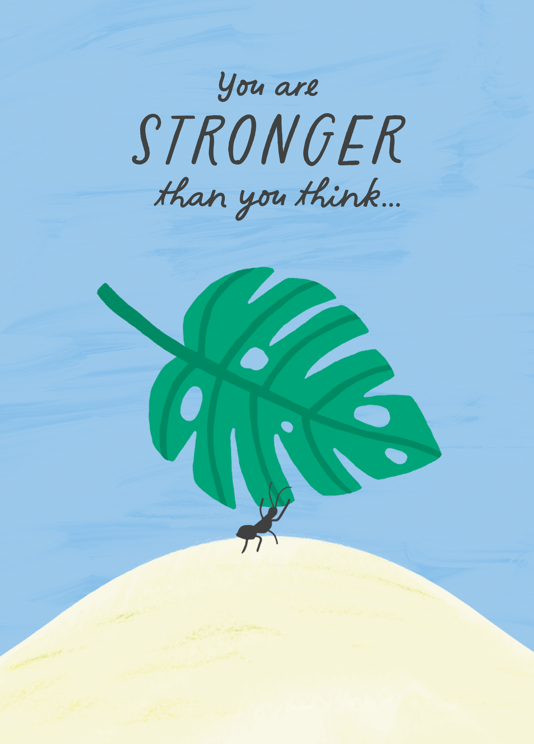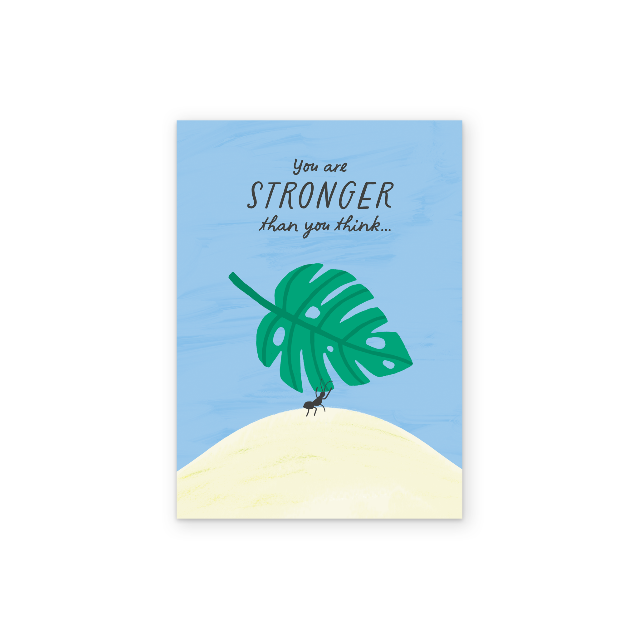 Printed on premium-quality board, this card features an illustrated ant carrying a large monstera leaf to the top of a white hill against a blue background below black lettering, with the message 'You are stronger than you think…', and comes complete with a co-ordinating white envelope.
