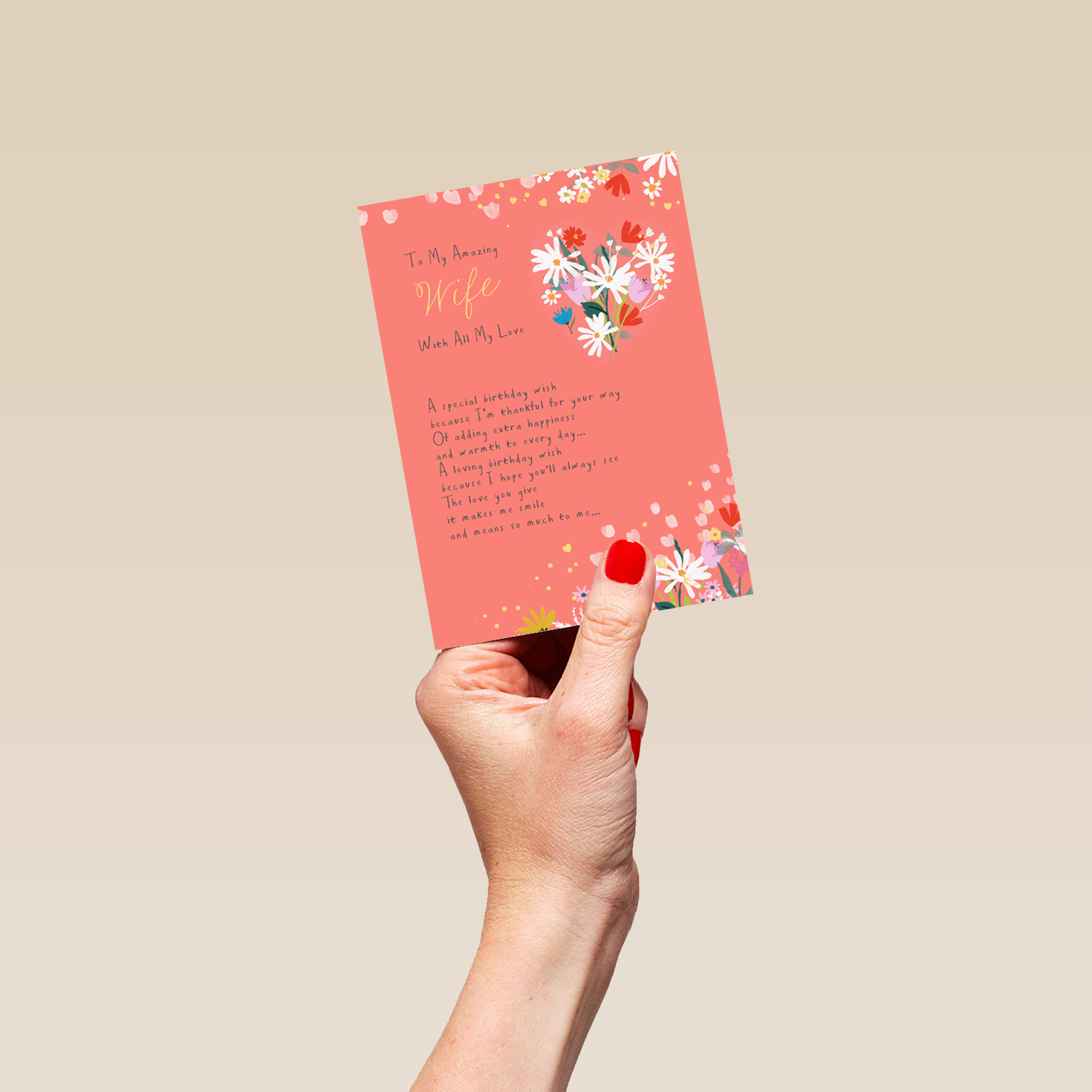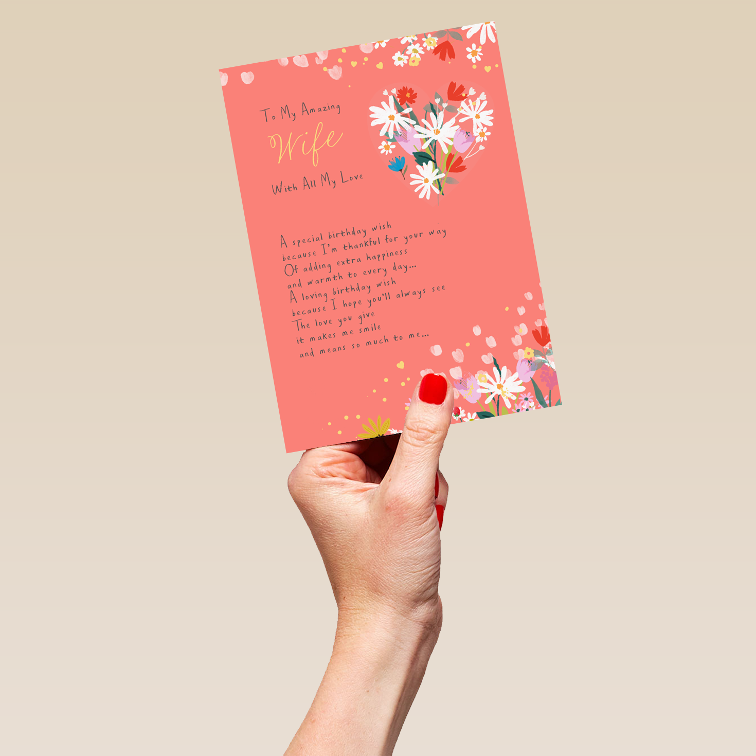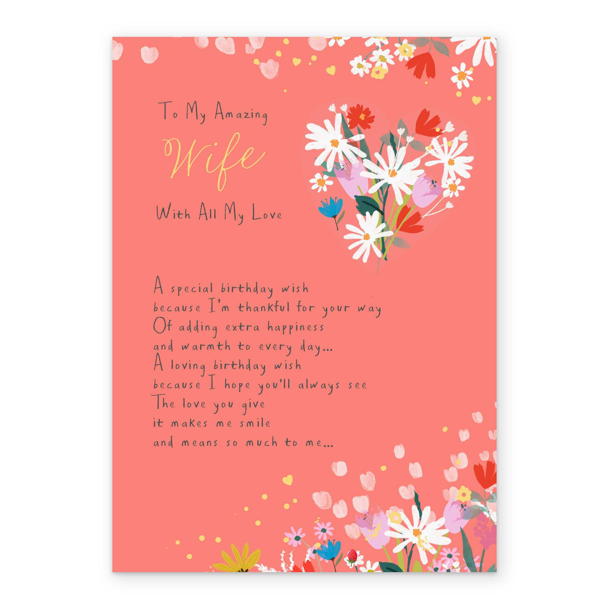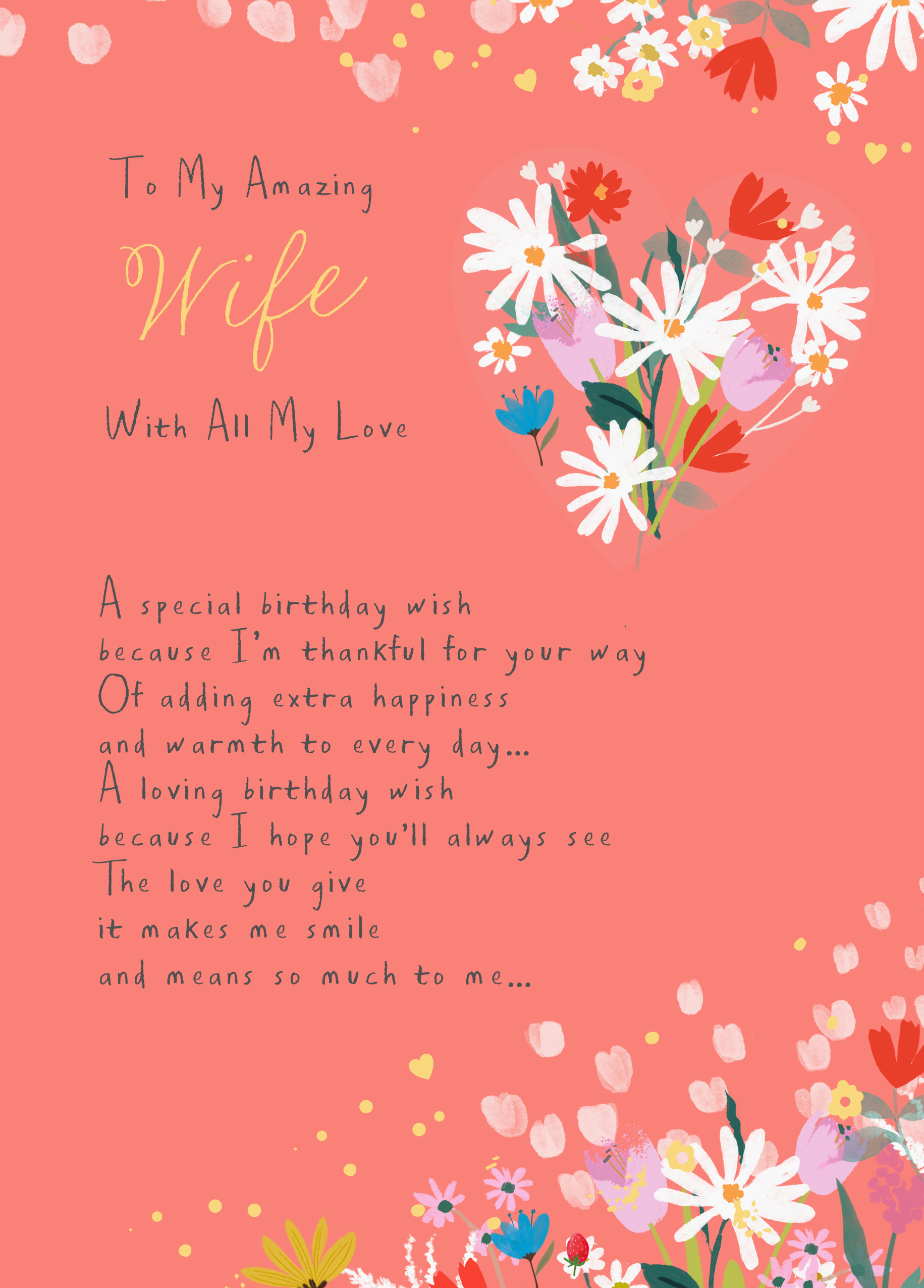 Printed on premium-quality board, this card features a heartfelt poem with an illustration of flowers in a heart shape, with the message 'To my amazing wife with all my love A special birthday wish because I'm thankful for your way Of adding extra happiness and warmth to every day… A loving birthday wish because I hope you'll always see The love you give it makes me smile and means so much to me...', and comes complete with a co-ordinating white envelope.