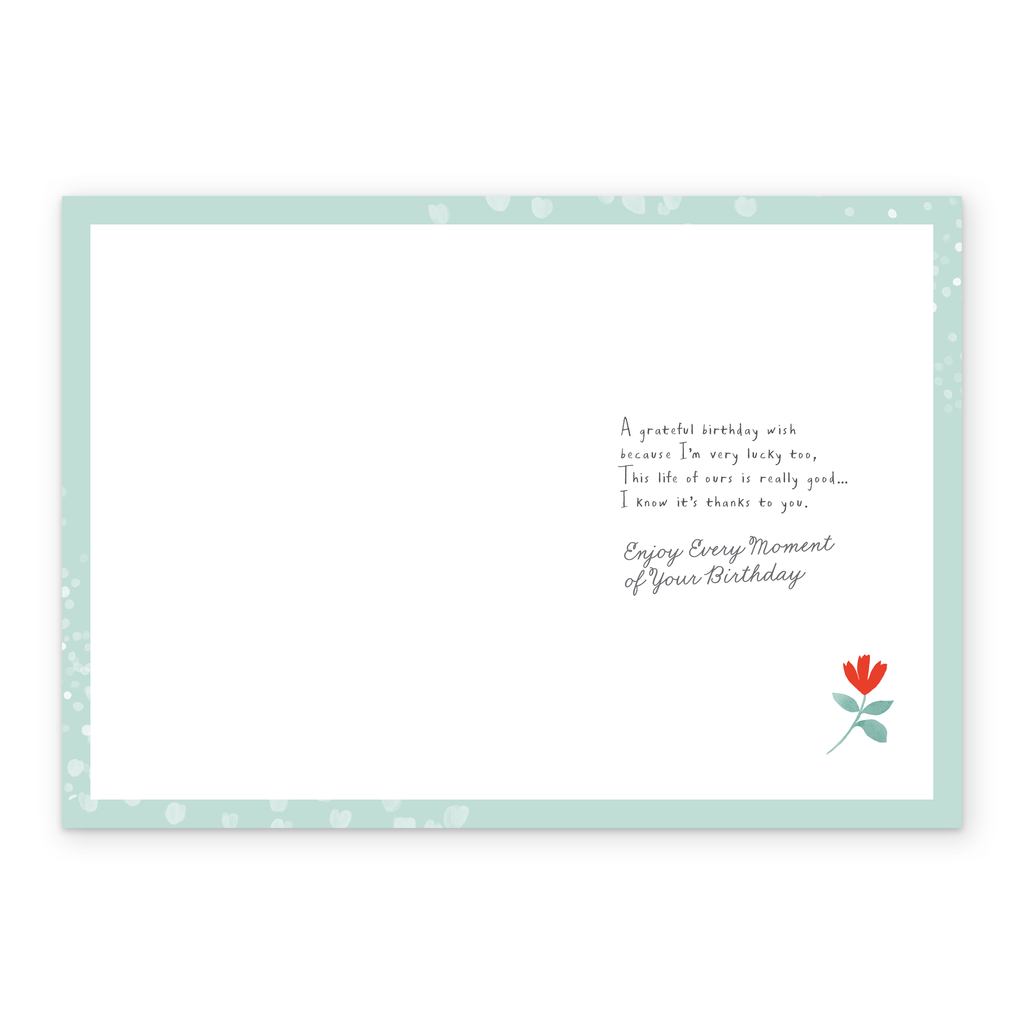 Message inside reads: A grateful birthday wish because I'm very lucky too, this life of ours is really good… I know it's thanks to you. Enjoy every moment of your birthday