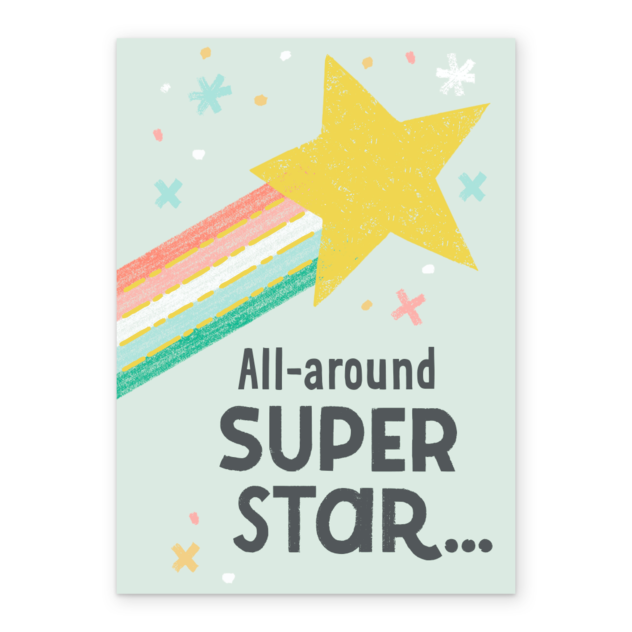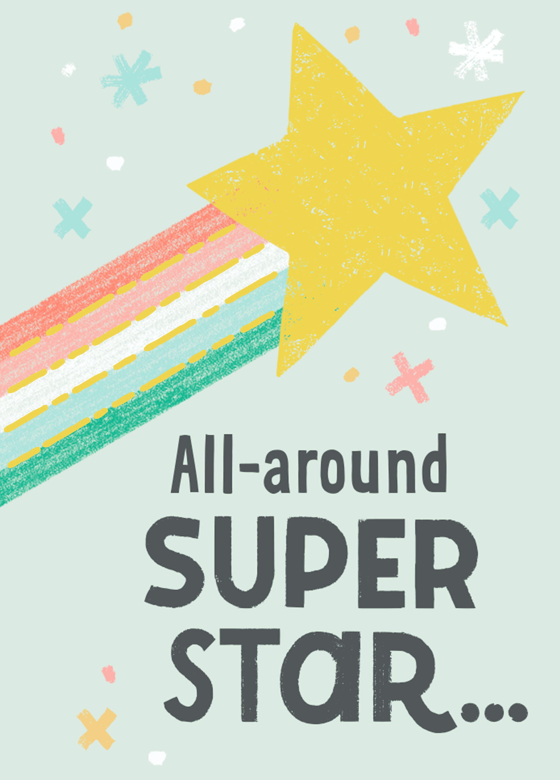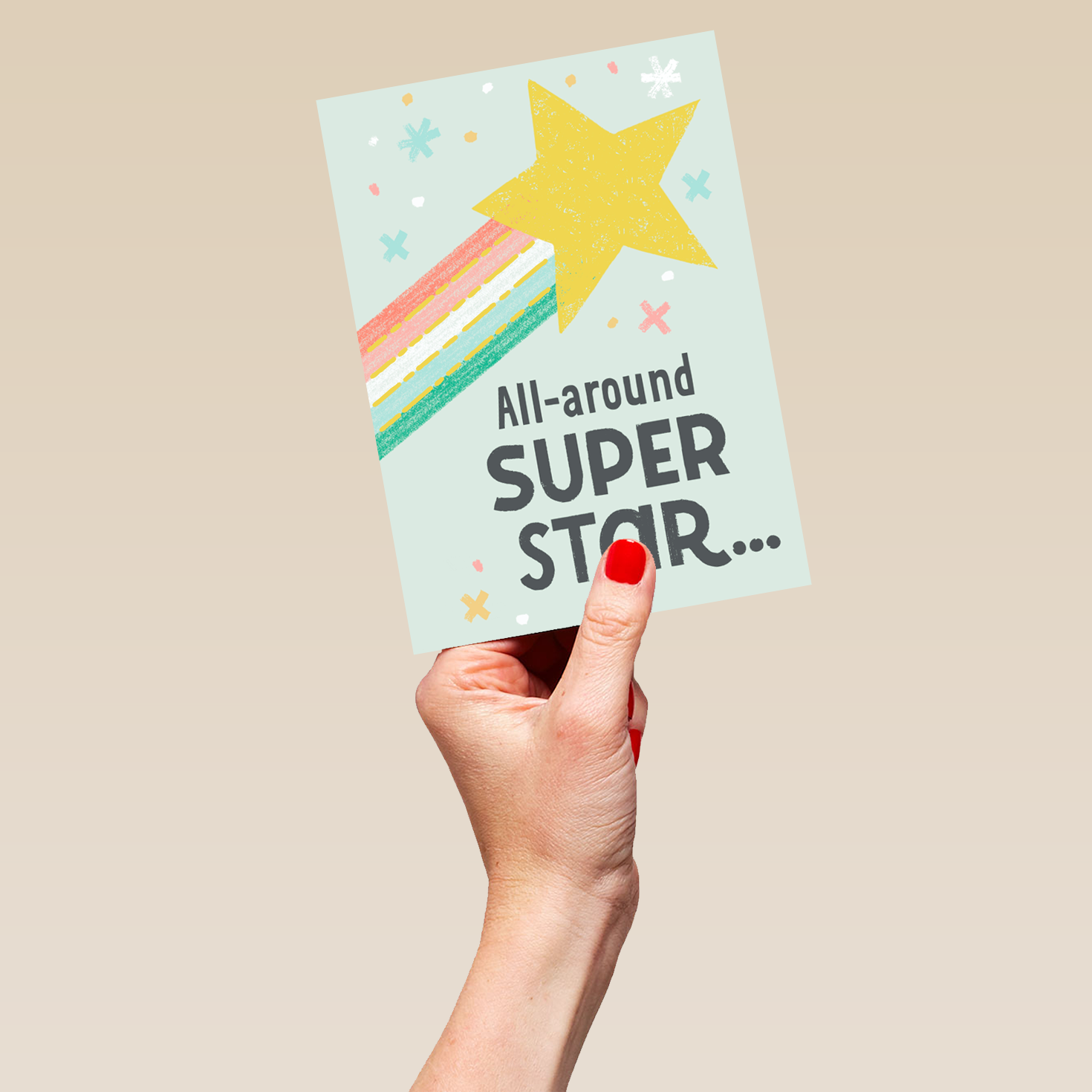 Show them you care with a personalised superstar encouragement card from Hallmark. Our just because cards are printed on premium quality, FSC®-certified card & delivered nationwide. This card is available as standard 12cm by 16.7cm and large 15.5cm by 21.6cm.
