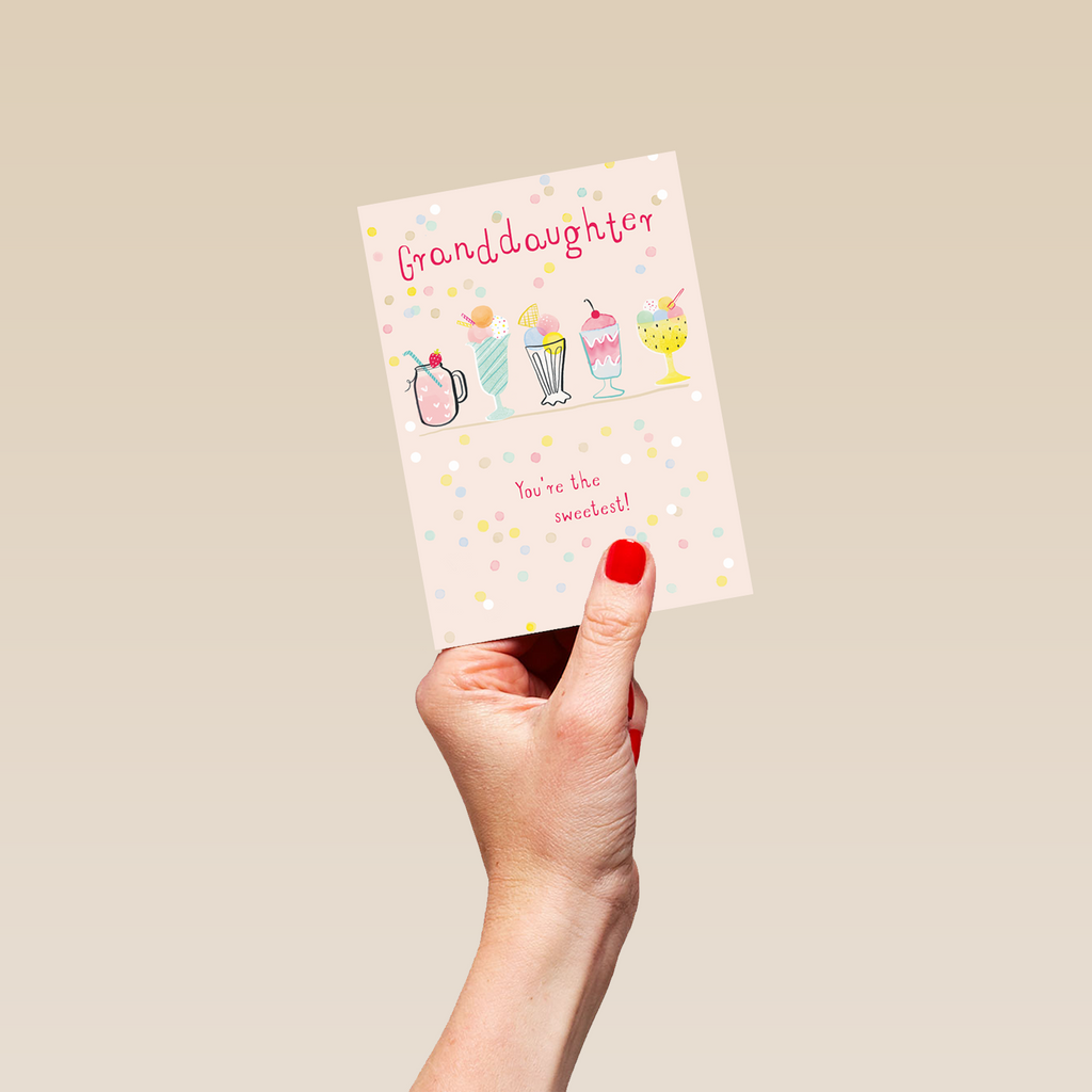 Show them you care with a personalised sweet sundae granddaughter birthday card from Hallmark. Our birthday cards are printed on premium quality, FSC®-certified card & delivered nationwide. This card is available as standard 12cm by 16.7cm and large 15.5cm by 21.6cm.