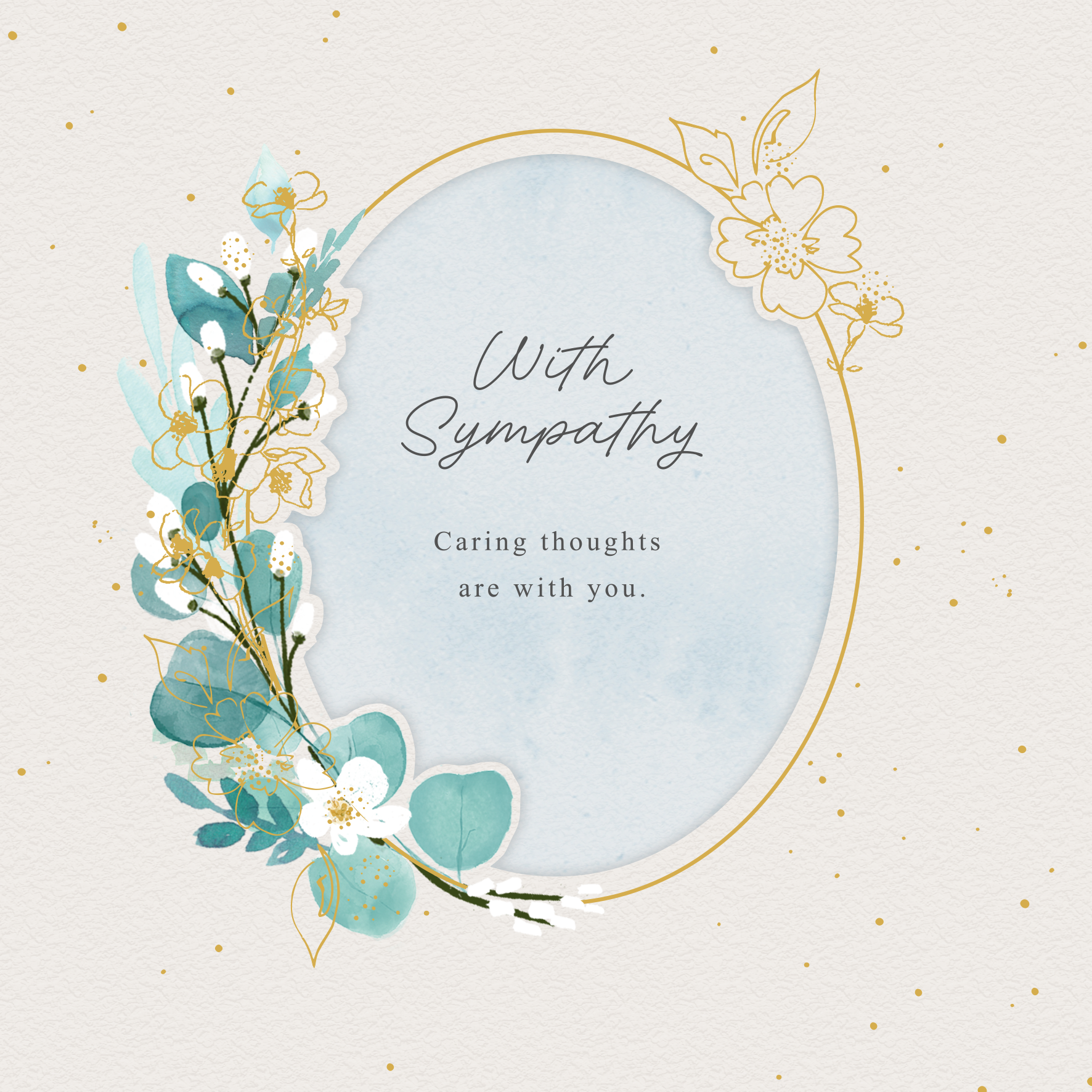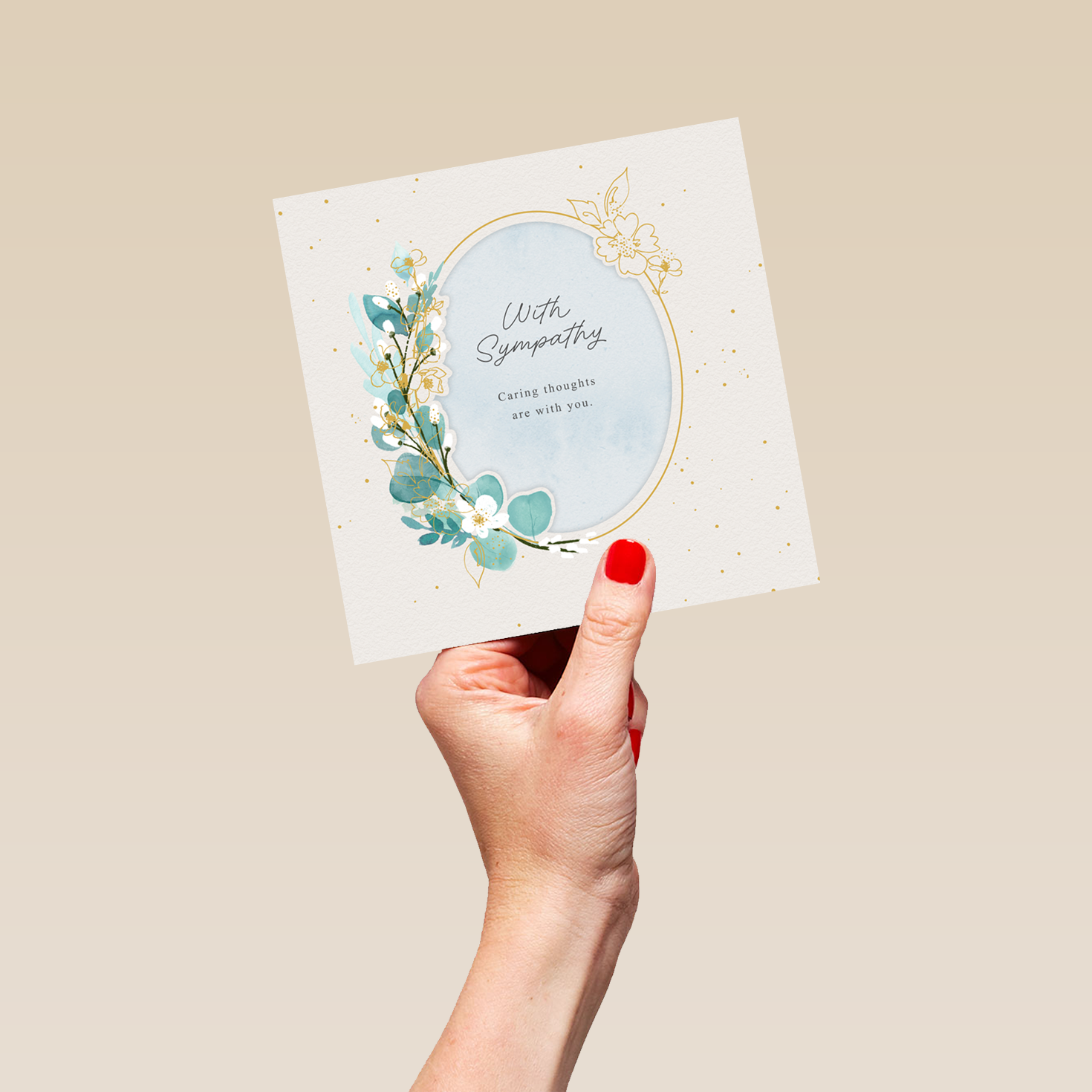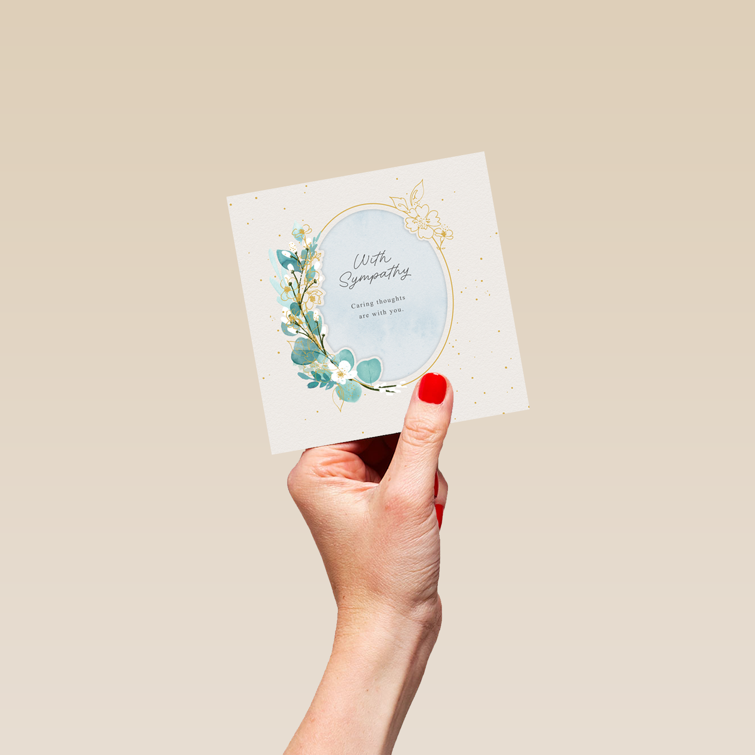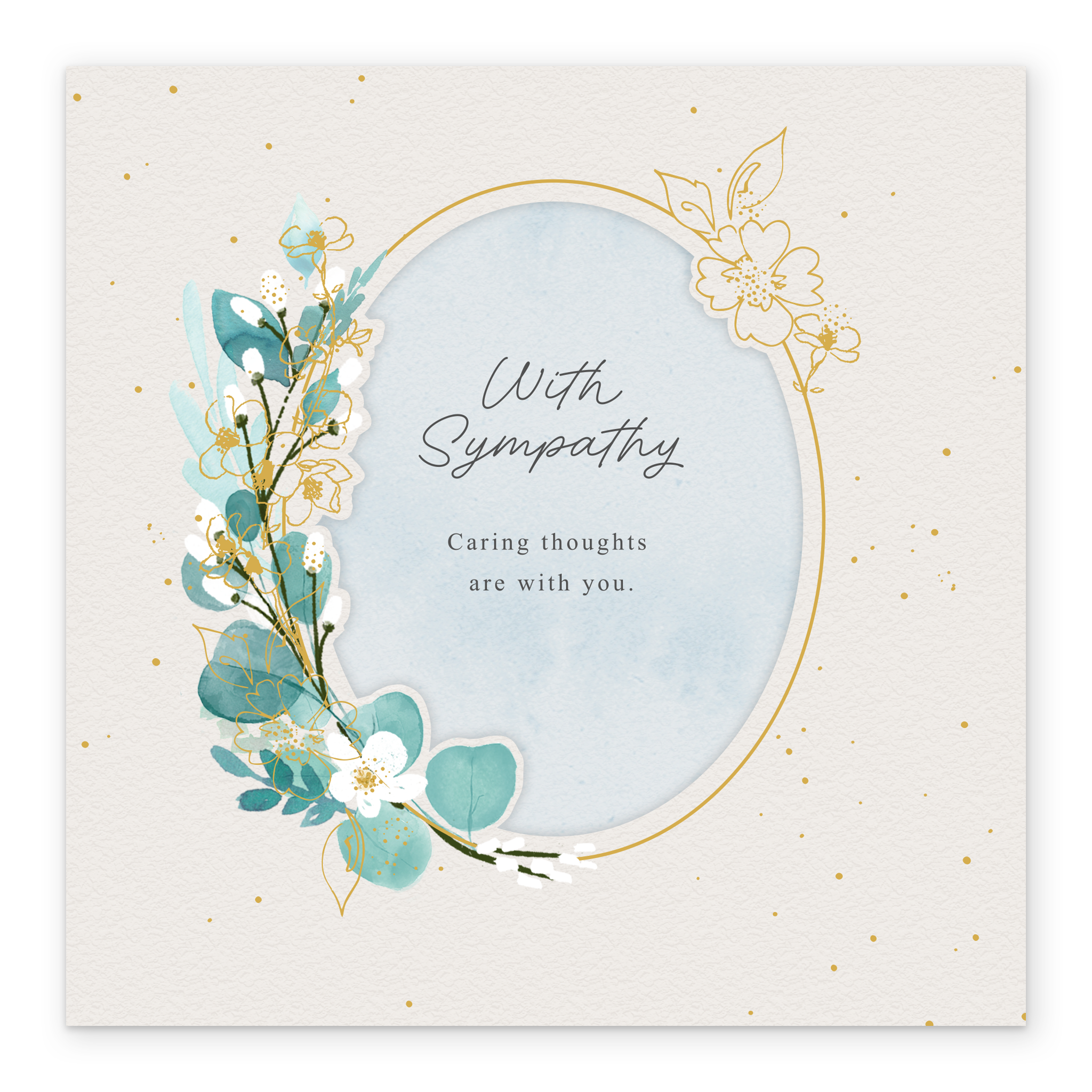 Printed on premium-quality board, this card features a blue watercolour oval framed by a gold outline, set against a gold-flecked white background with white watercolour flowers and green foliage set around the left side of the oval and black lettering in the centre, with the message 'With Sympathy. Caring thoughts are with you.', and comes complete with a co-ordinating white envelope.