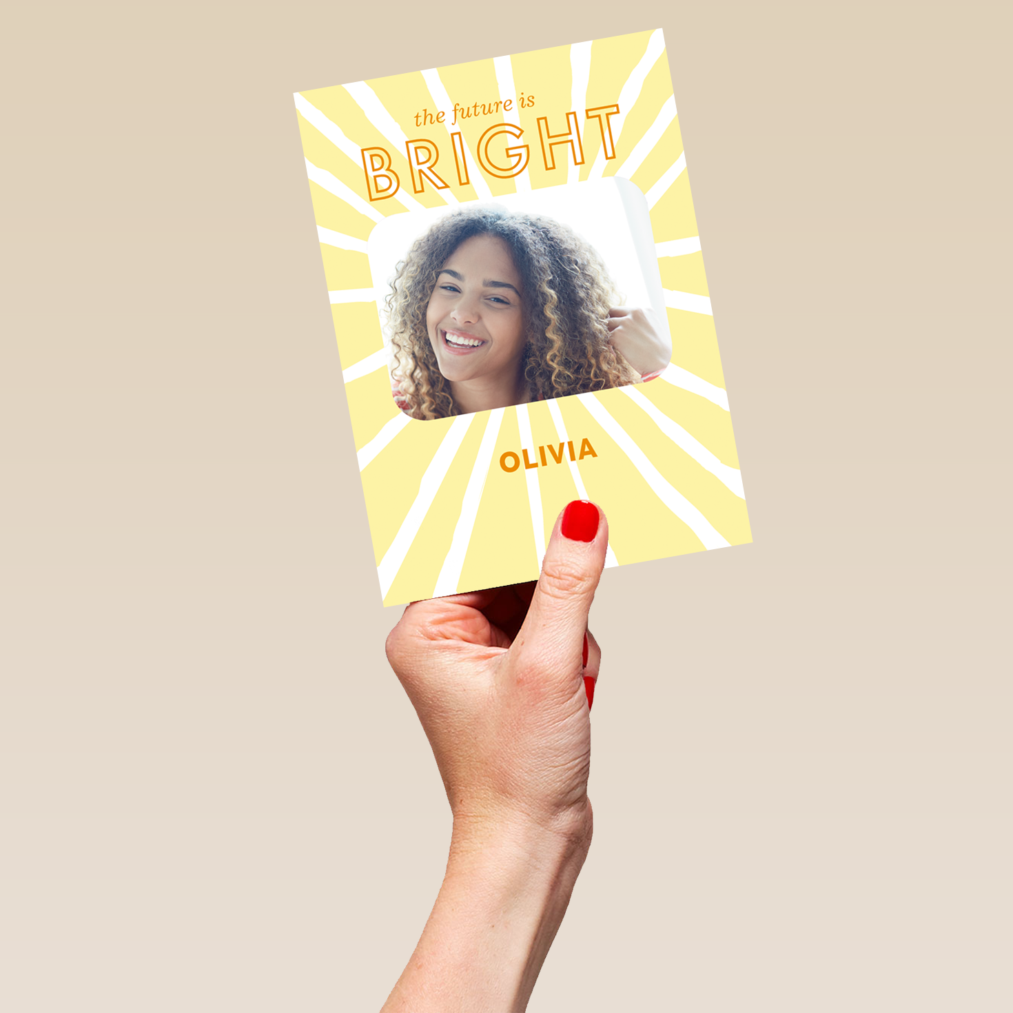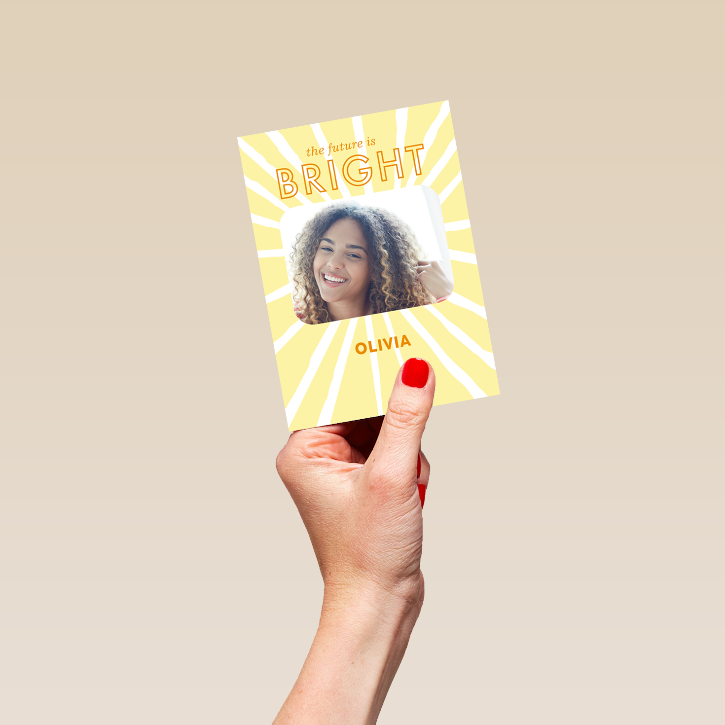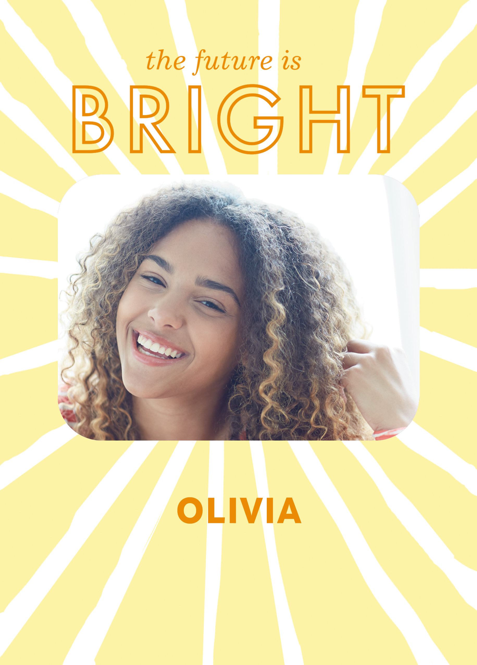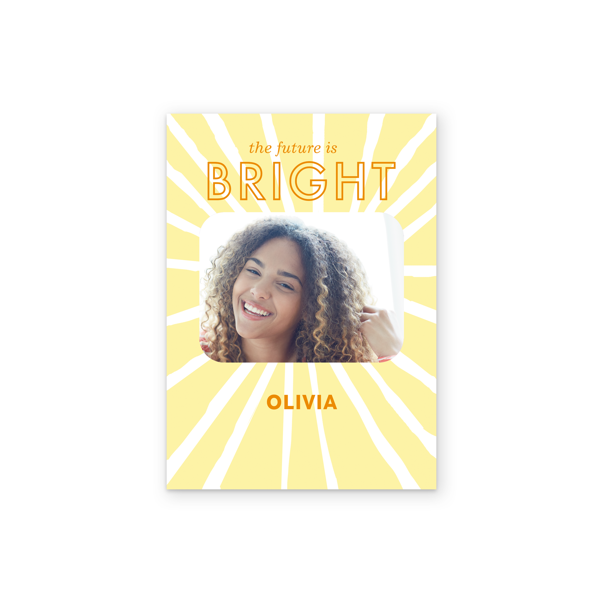 Printed on premium-quality board, this card features a central photo upload aperture surrounded by a white and yellow 'starburst' pattern and orange lettering, with the message 'The future is bright [NAME]', space to upload a photo and personalise a name, and comes complete with a co-ordinating white envelope.