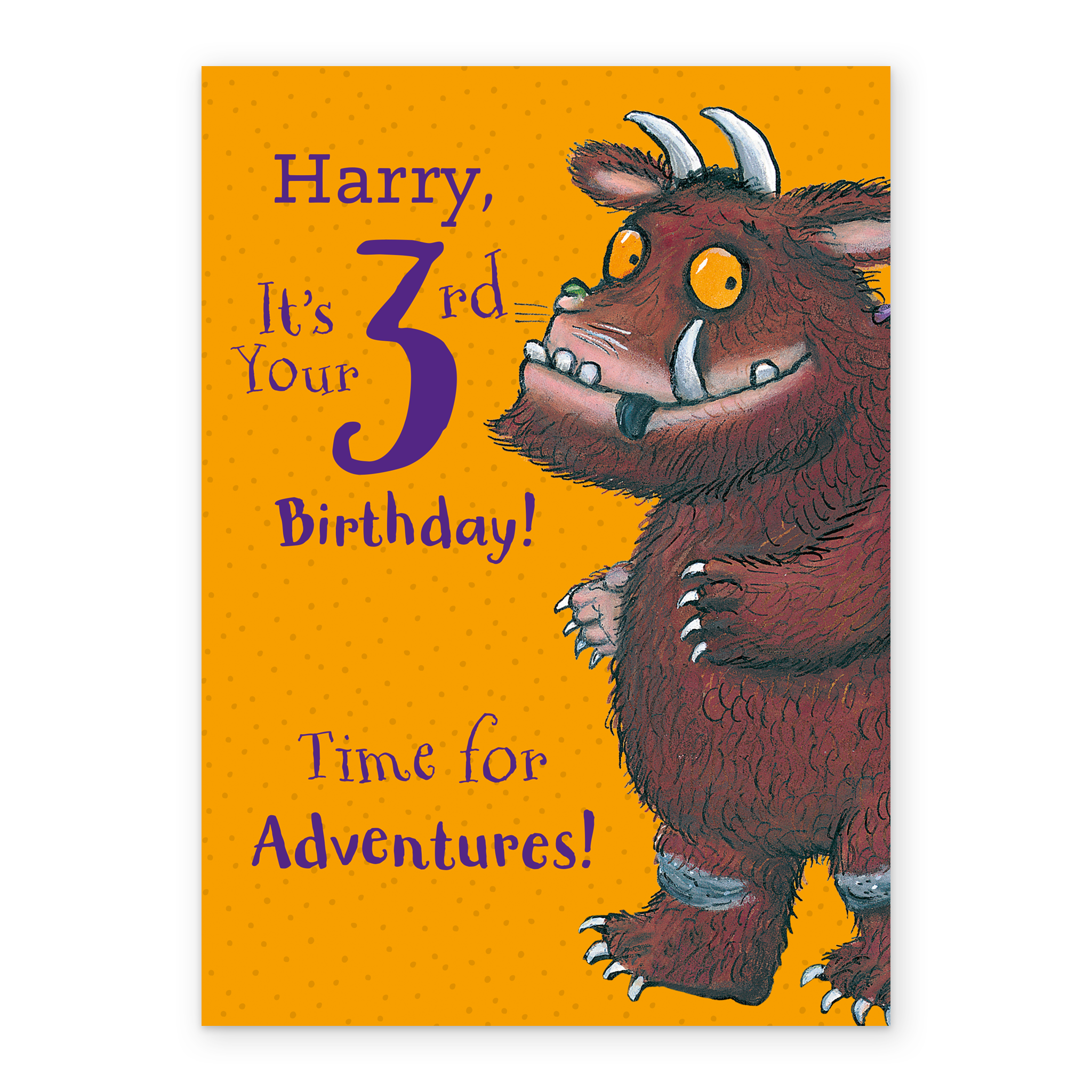 Printed on premium-quality board, this card features a classic Axel Schaeffler illustration of Julia Donaldson's The Gruffalo set against a bright orange background alongside purple lettering, with the message '[NAME], It's Your 3rd Birthday! Time For Adventures!', space to personalise a name, and comes complete with a co-ordinating white envelope.
