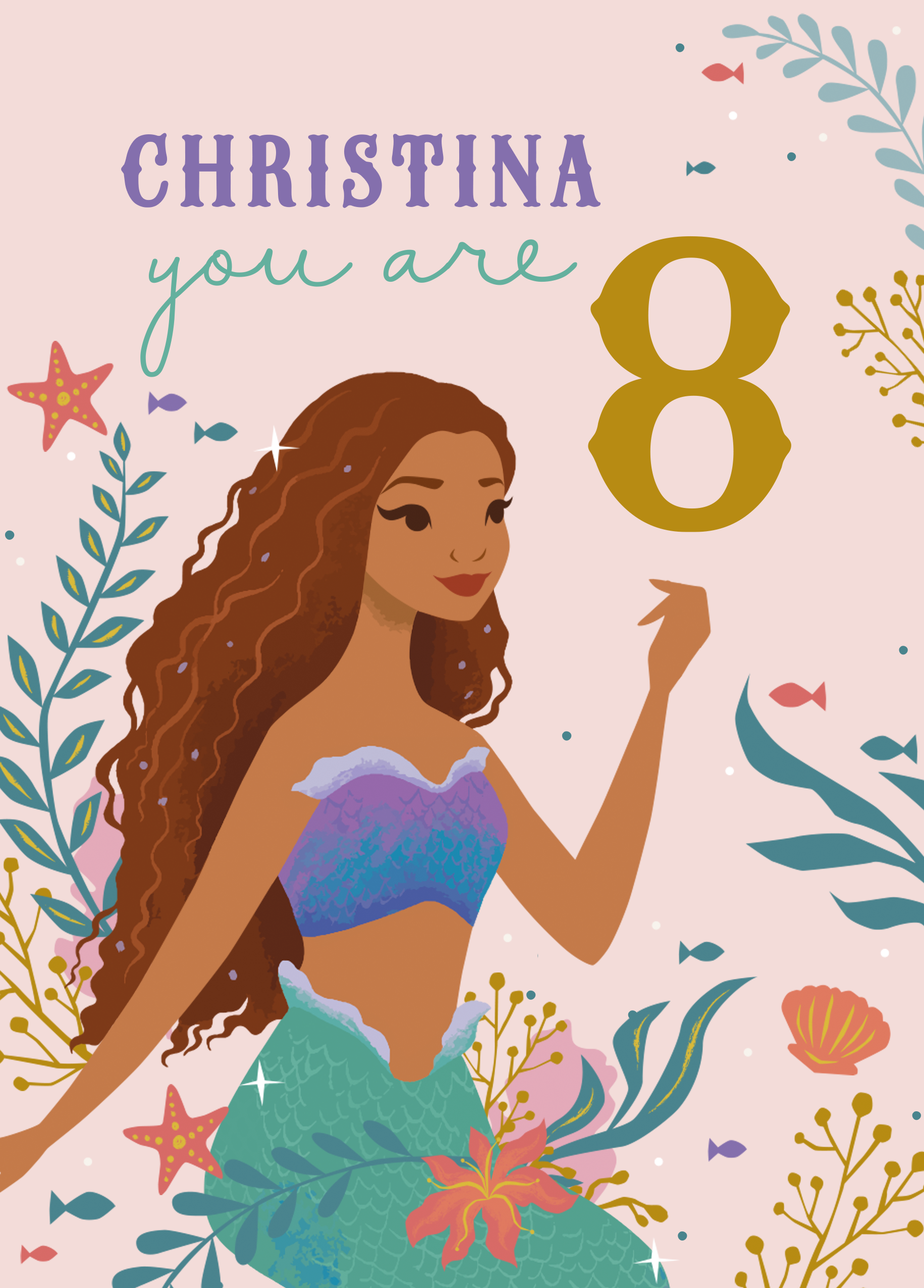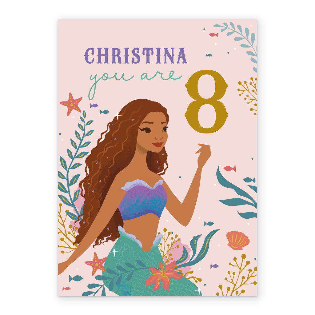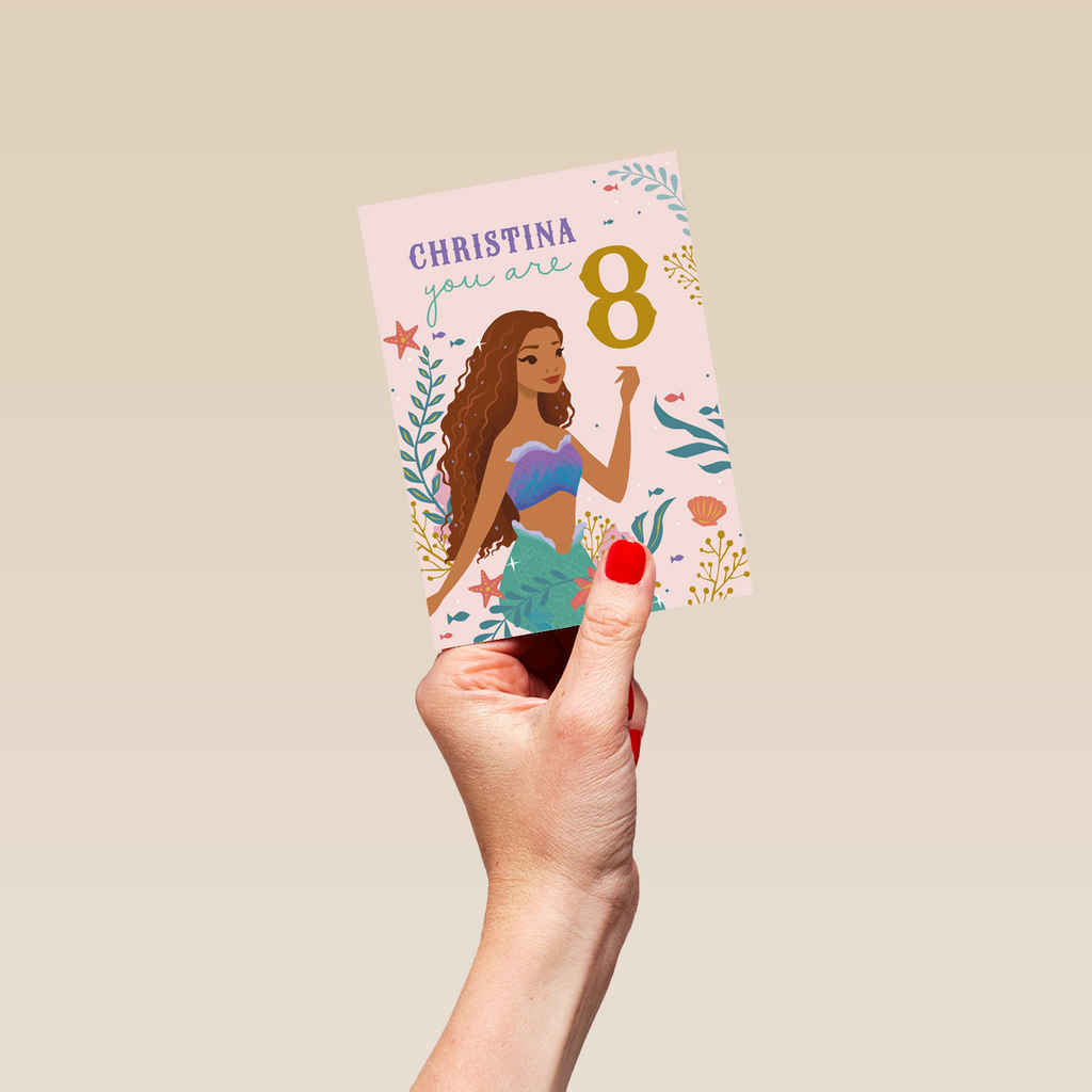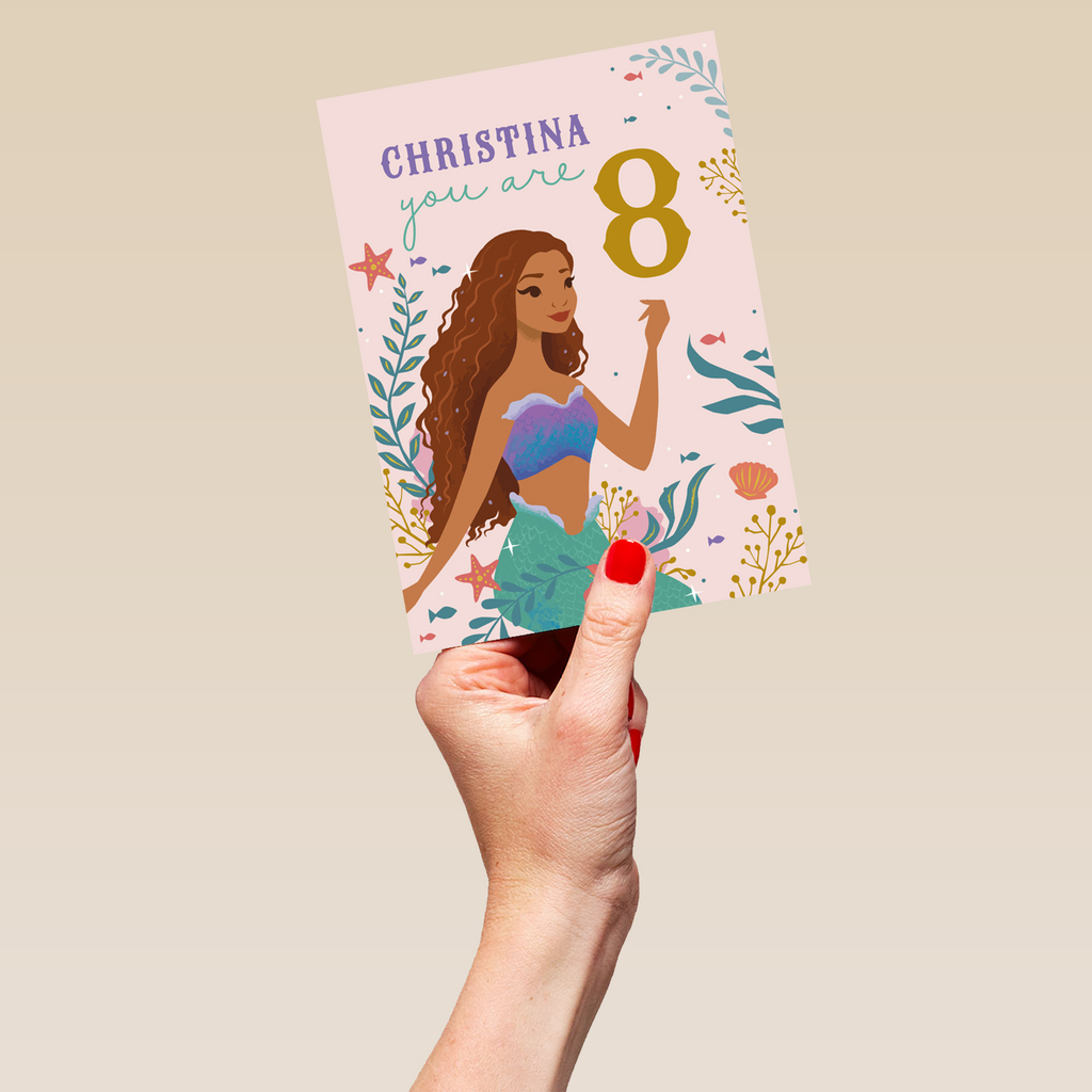 Show them you care with a personalised and editable sweet The Little Mermaid birthday card from Hallmark. This card features a beautiful illustration of the Disney Princess Ariel from The Little Mermaid. Our birthday cards are printed on premium quality, FSC®-certified card & delivered nationwide. This card is available as standard 12cm by 16.7cm and large 15.5cm by 21.6cm.