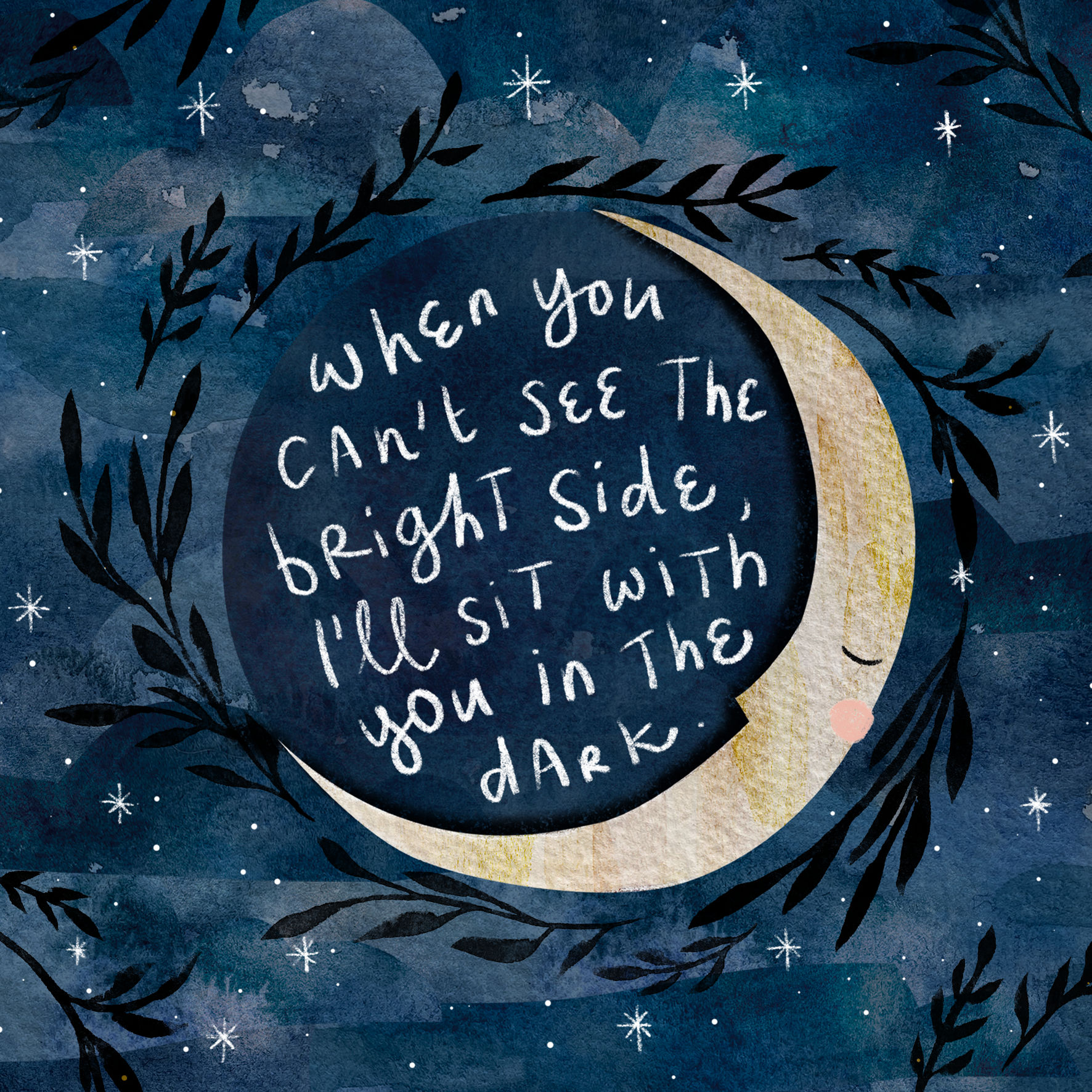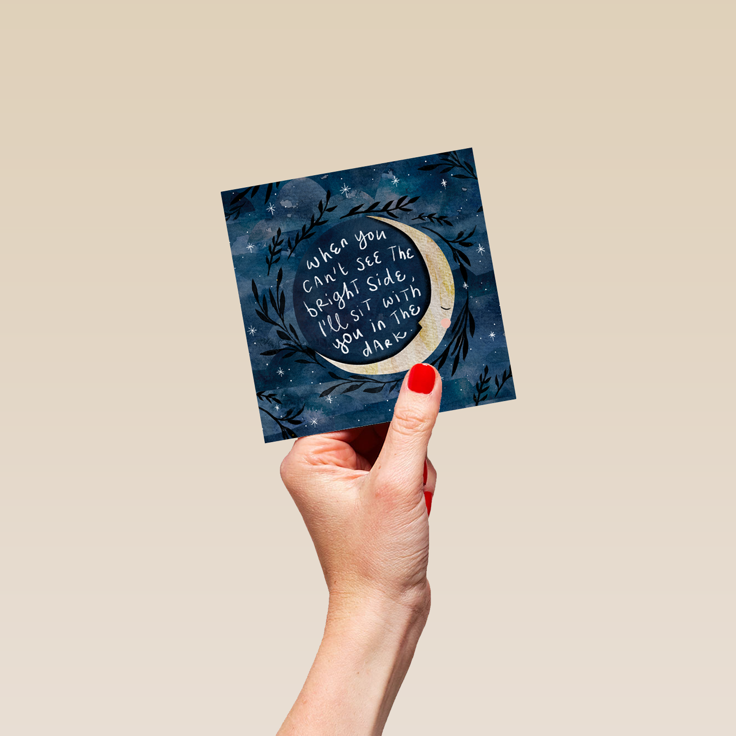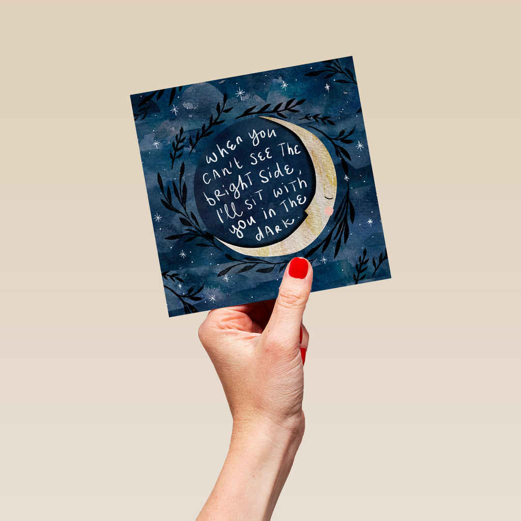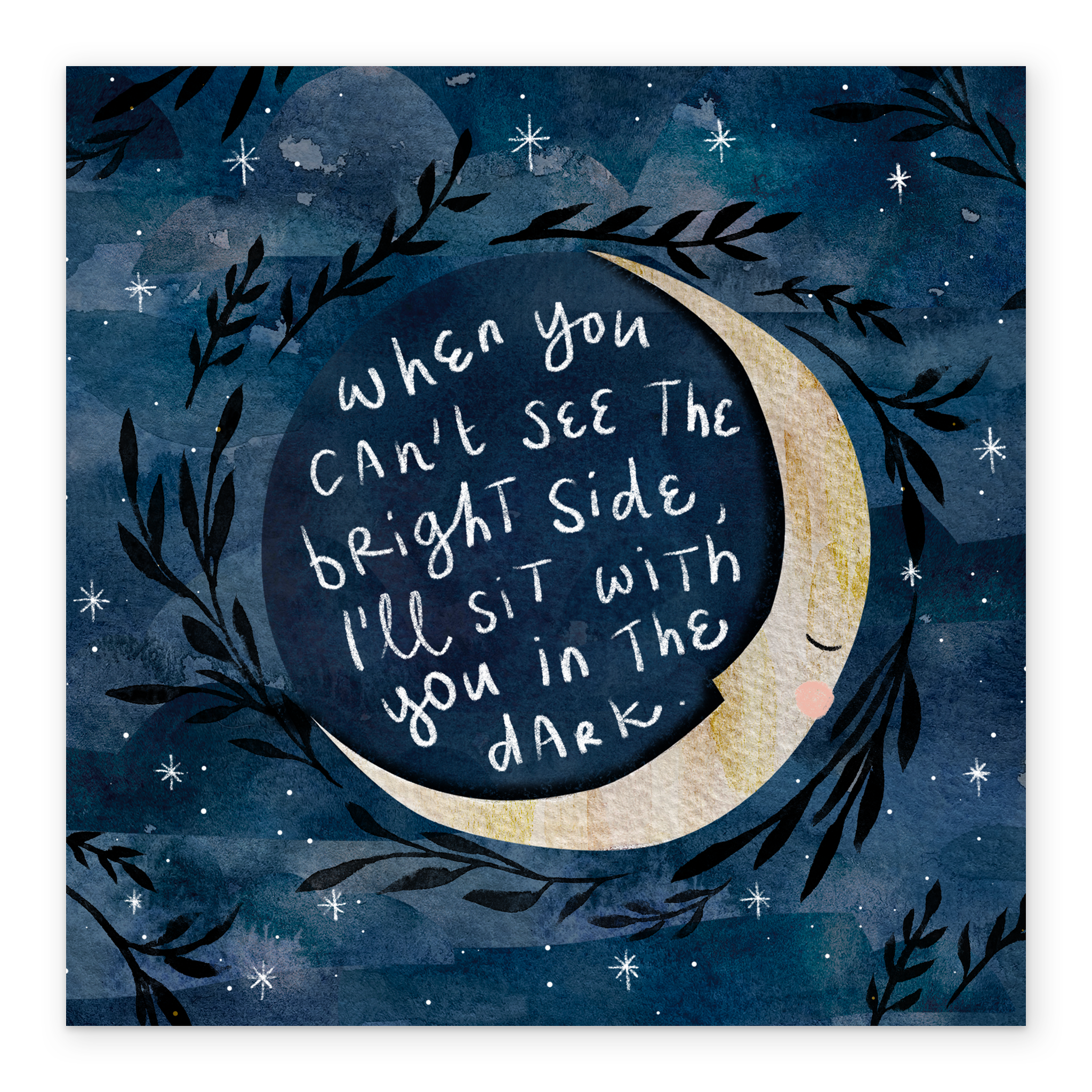 Printed on premium-quality board, this card features a crescent moon design with a moody, cloudy background and stars, the message 'When you can't see the bright side, I'll sit with you in the dark' on the front, and comes complete with a co-ordinating white envelope.