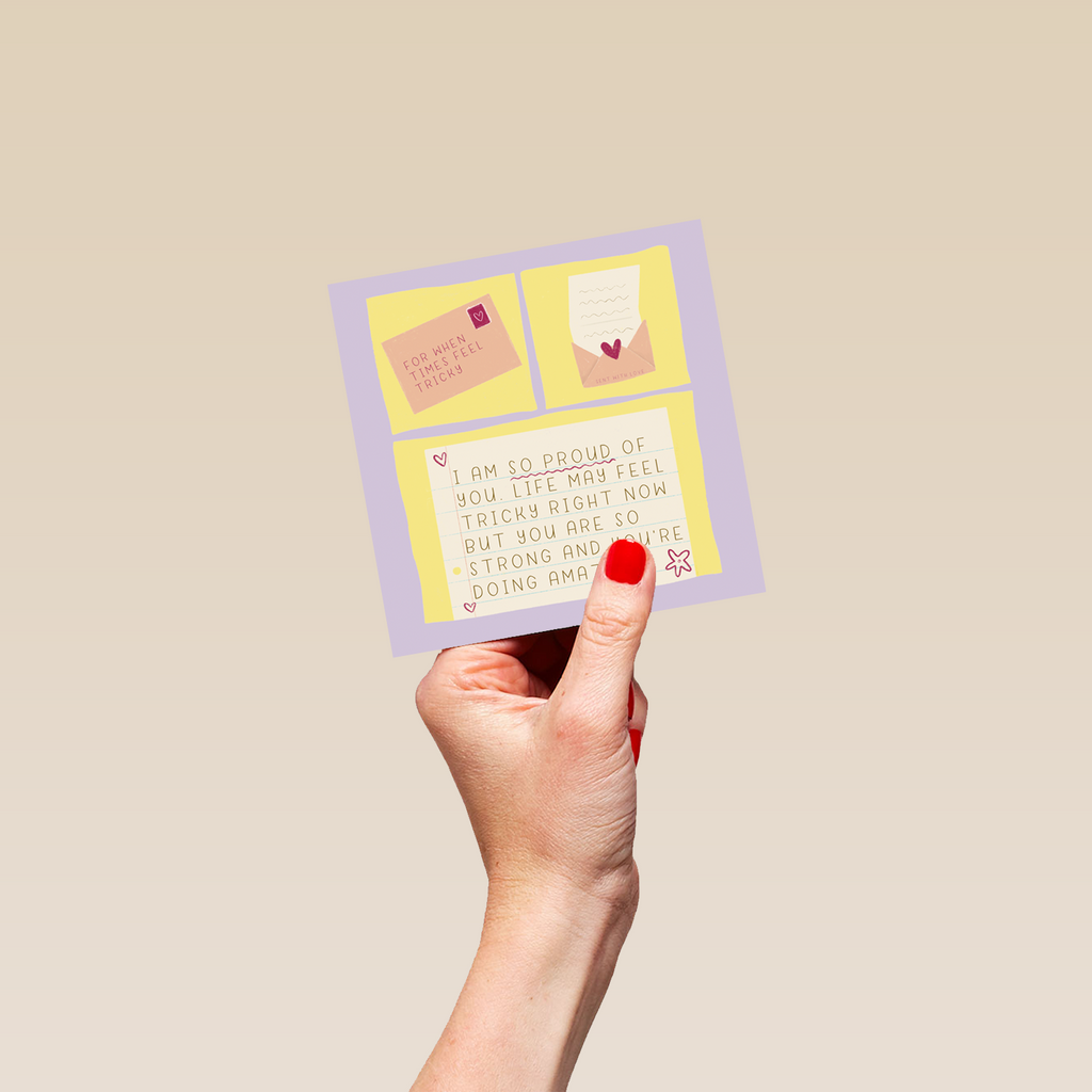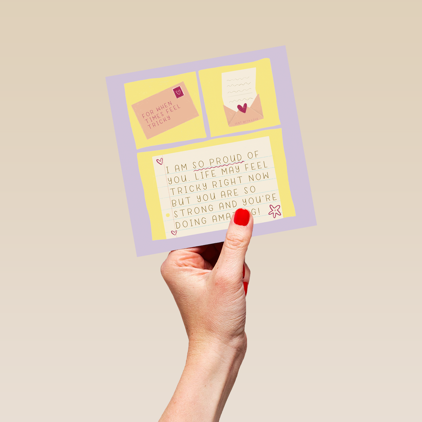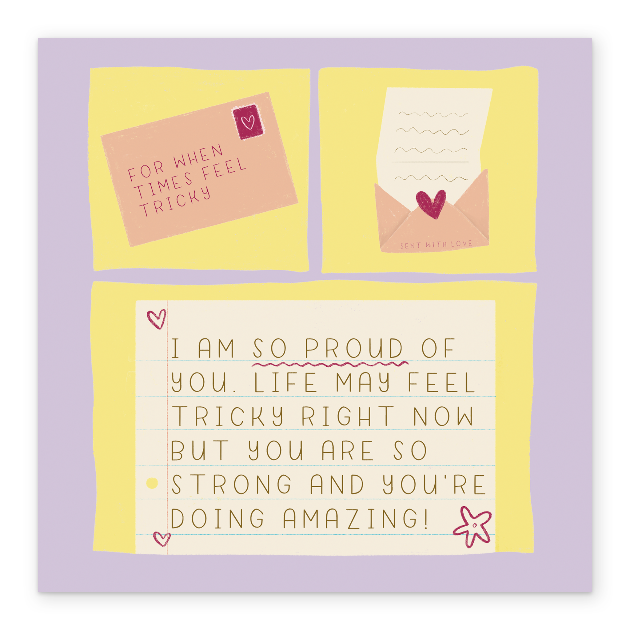 Printed on premium-quality board, this card features a simple comic book styled illustration following the story of opening supportive letter, with the message 'For when times feel tricky. I am so proud of you. Life may feel tricky right now but you are so strong and you're doing amazing!' on the front, and comes complete with a co-ordinating white envelope.