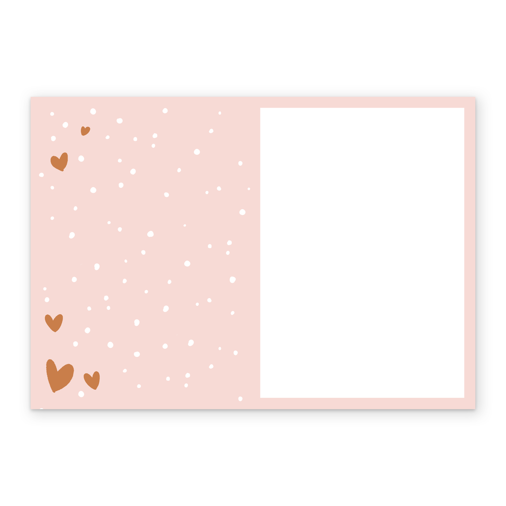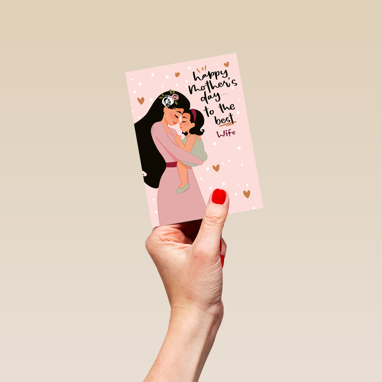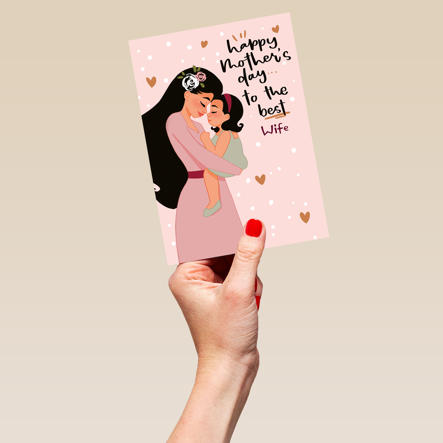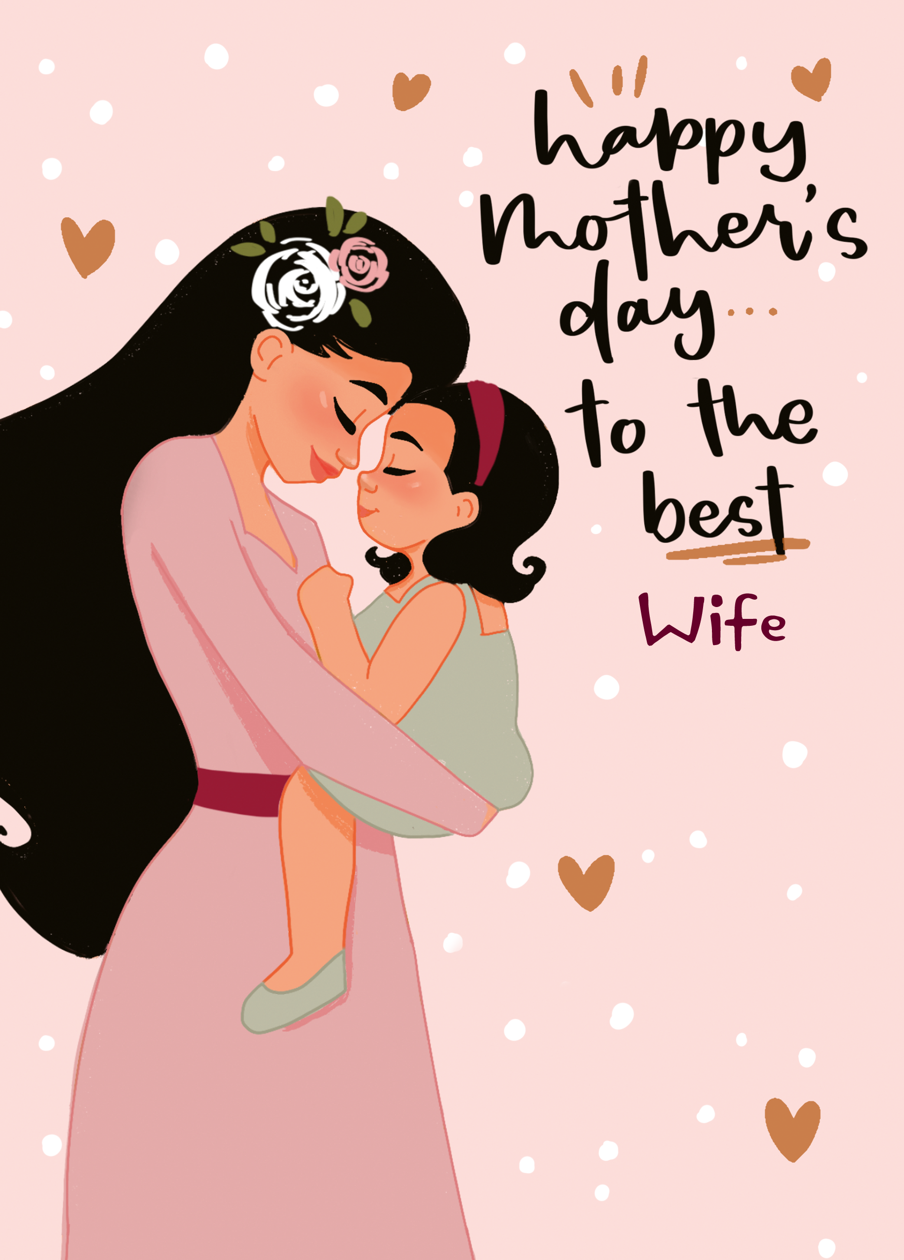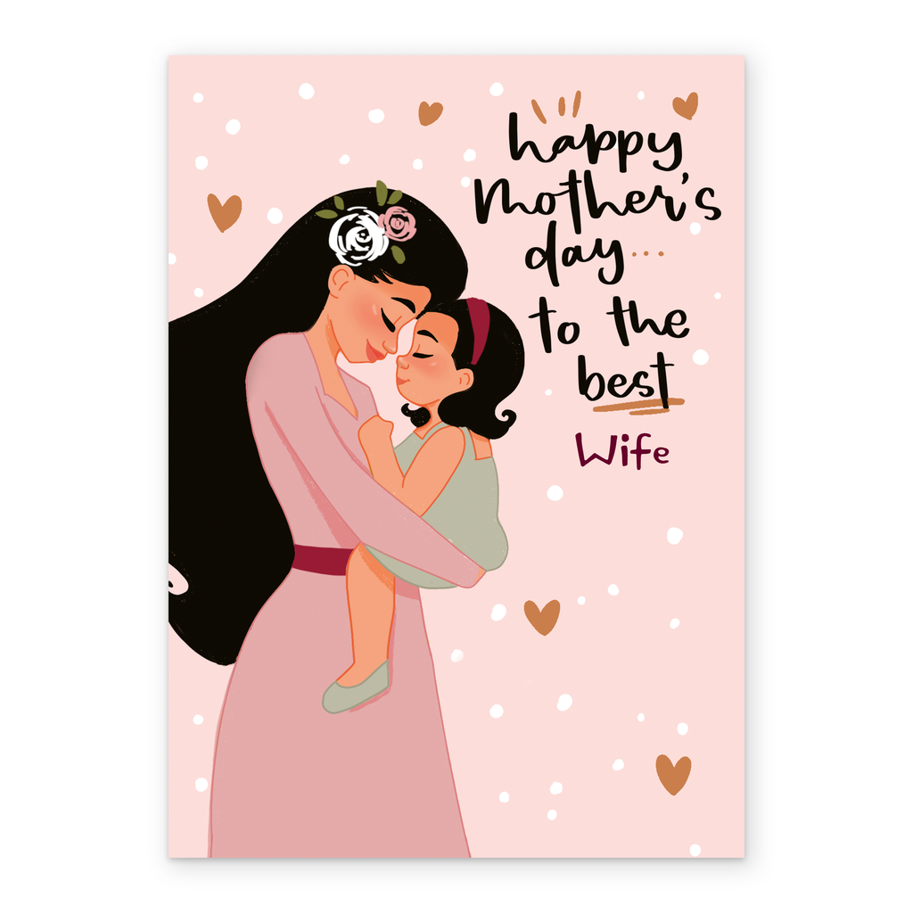 Printed on premium-quality board, this card features a cute contemporary illustrated mum holding her daughter close, on a light pink background with gold hearts and white dots, with the message 'Happy Mother's Day…to the best wife', space to personalise a name, and comes complete with a co-ordinating white envelope.