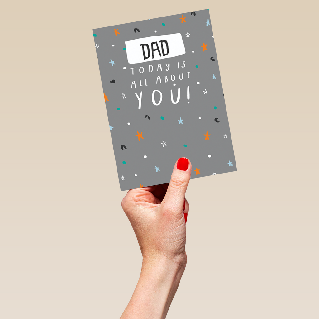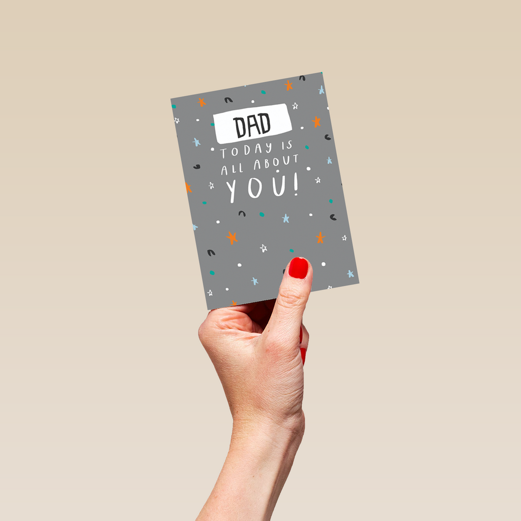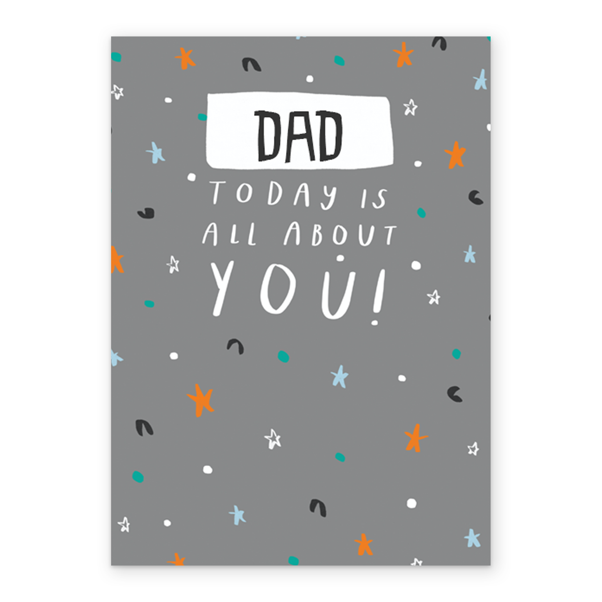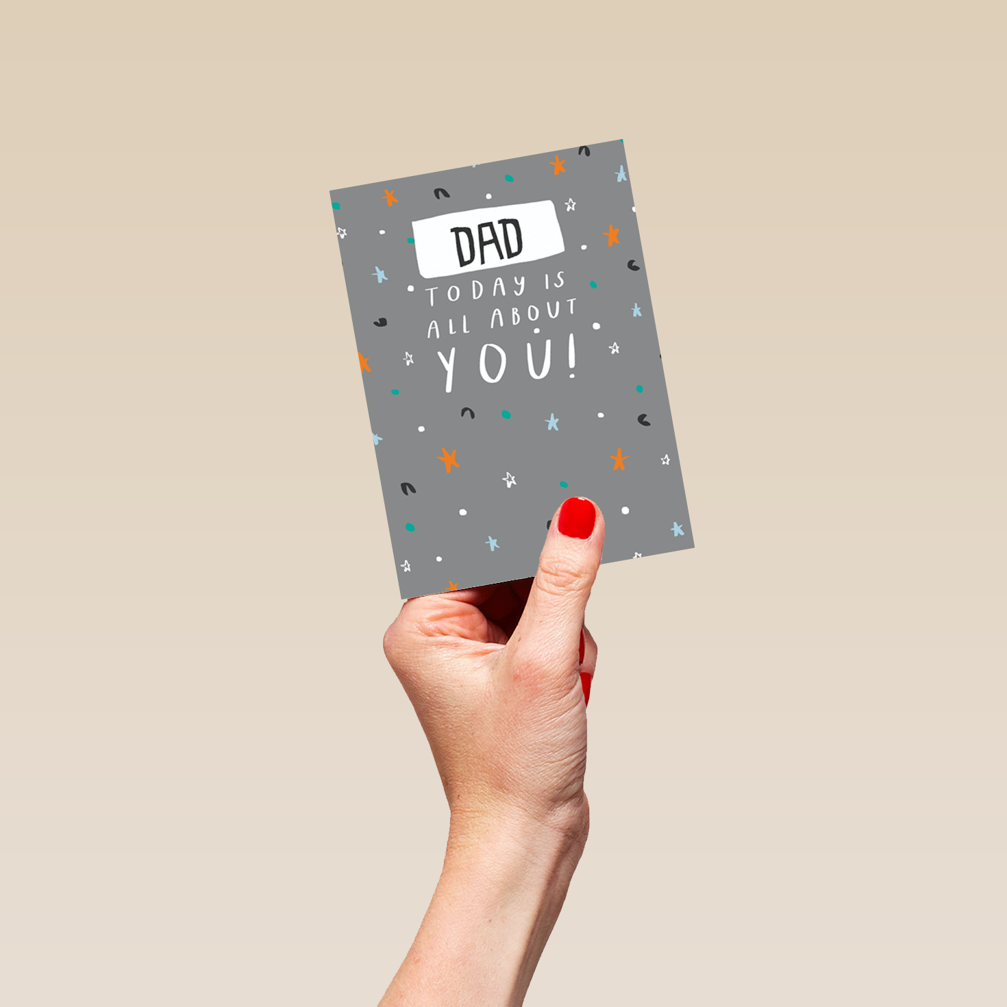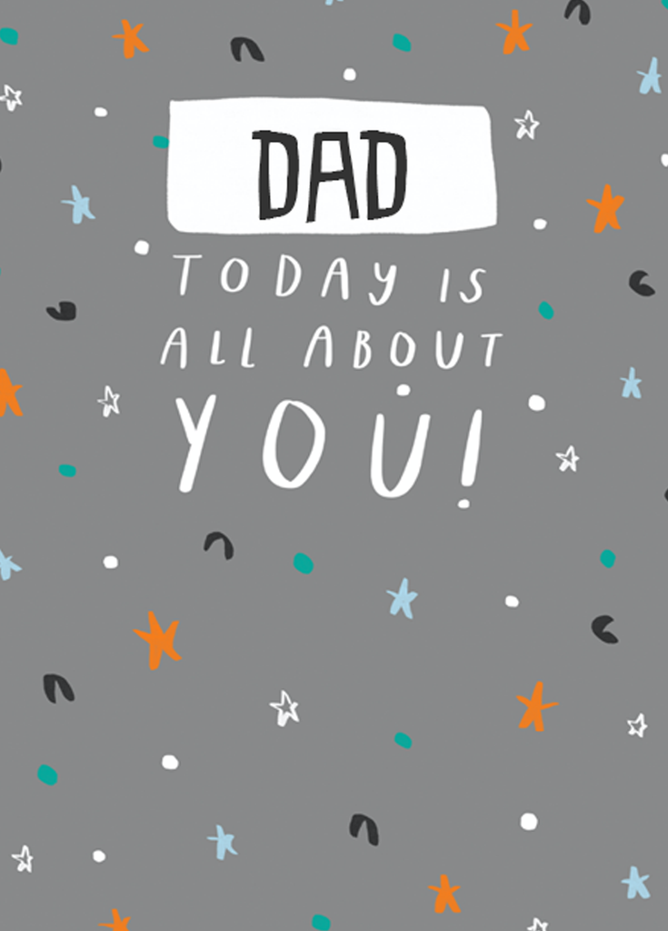 Show them you care with a personalised today is all about you dad card from Hallmark. Our birthday cards are printed on premium quality, FSC®-certified card & delivered nationwide. This card is available as standard 12cm by 16.7cm and large 15.5cm by 21.6cm.