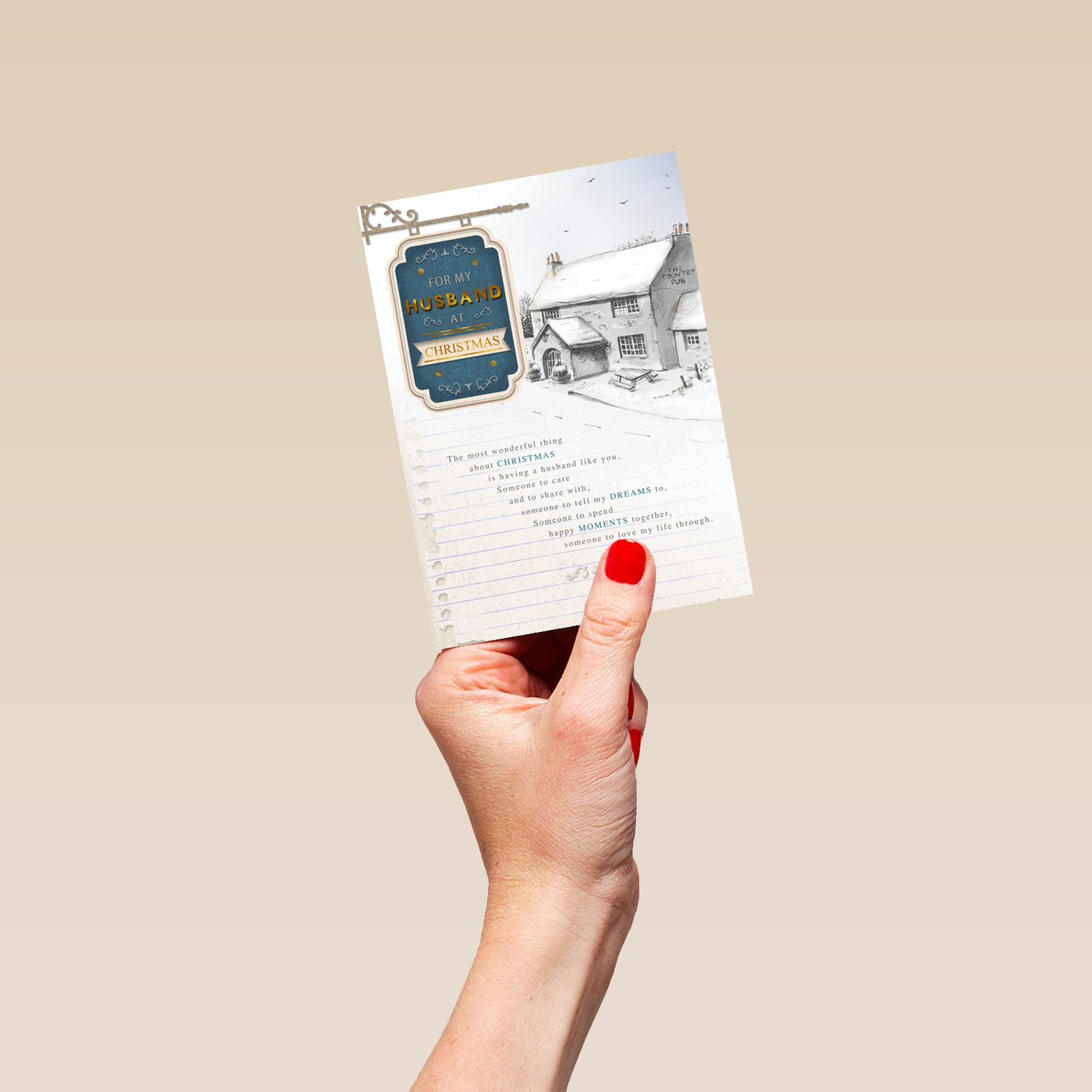 Show them you care with a personalised traditional husband card from Hallmark. Our Christmas cards are printed on premium quality, FSC®-certified card & delivered nationwide. This card is available as standard 12cm by 16.7cm and large 15.5cm by 21.6cm.