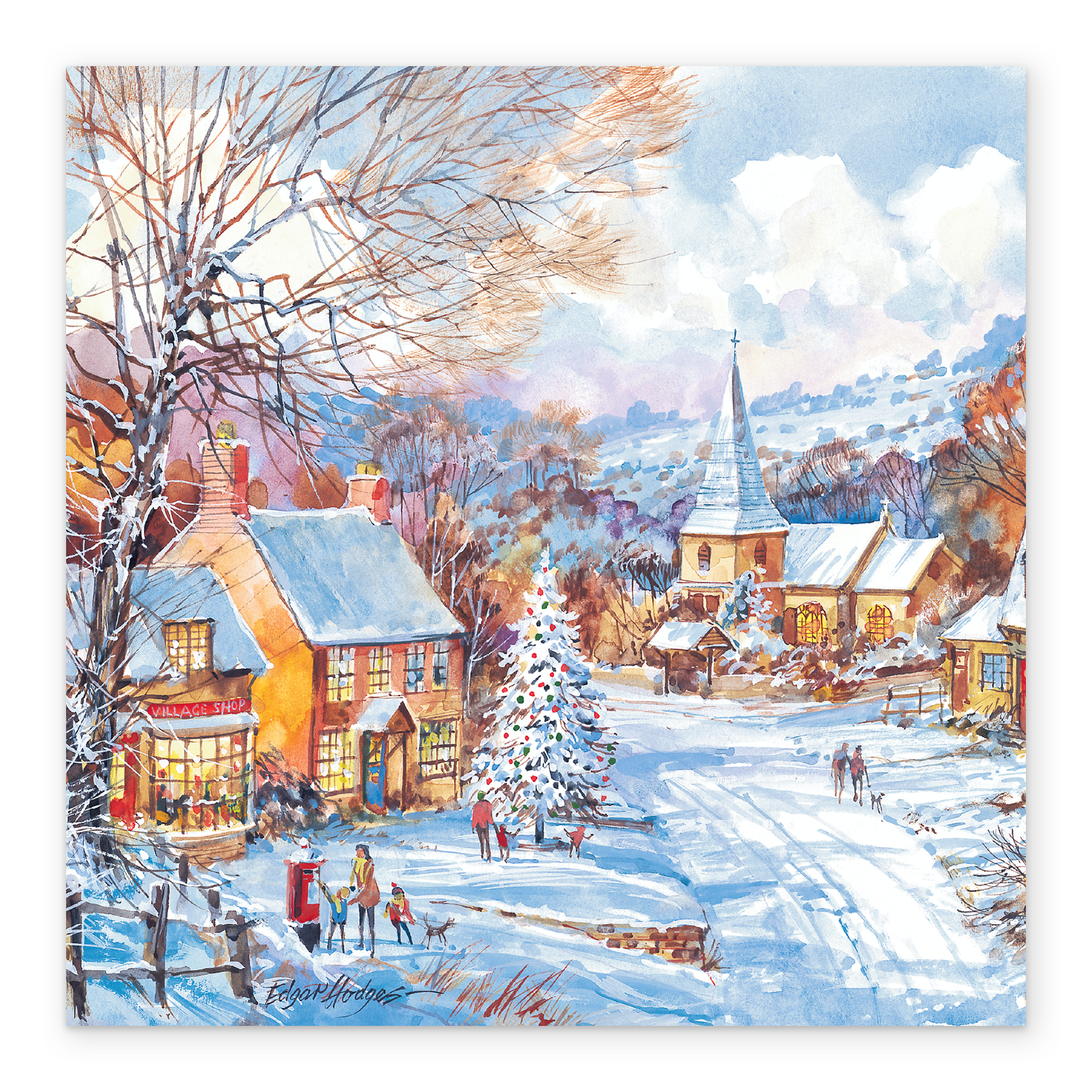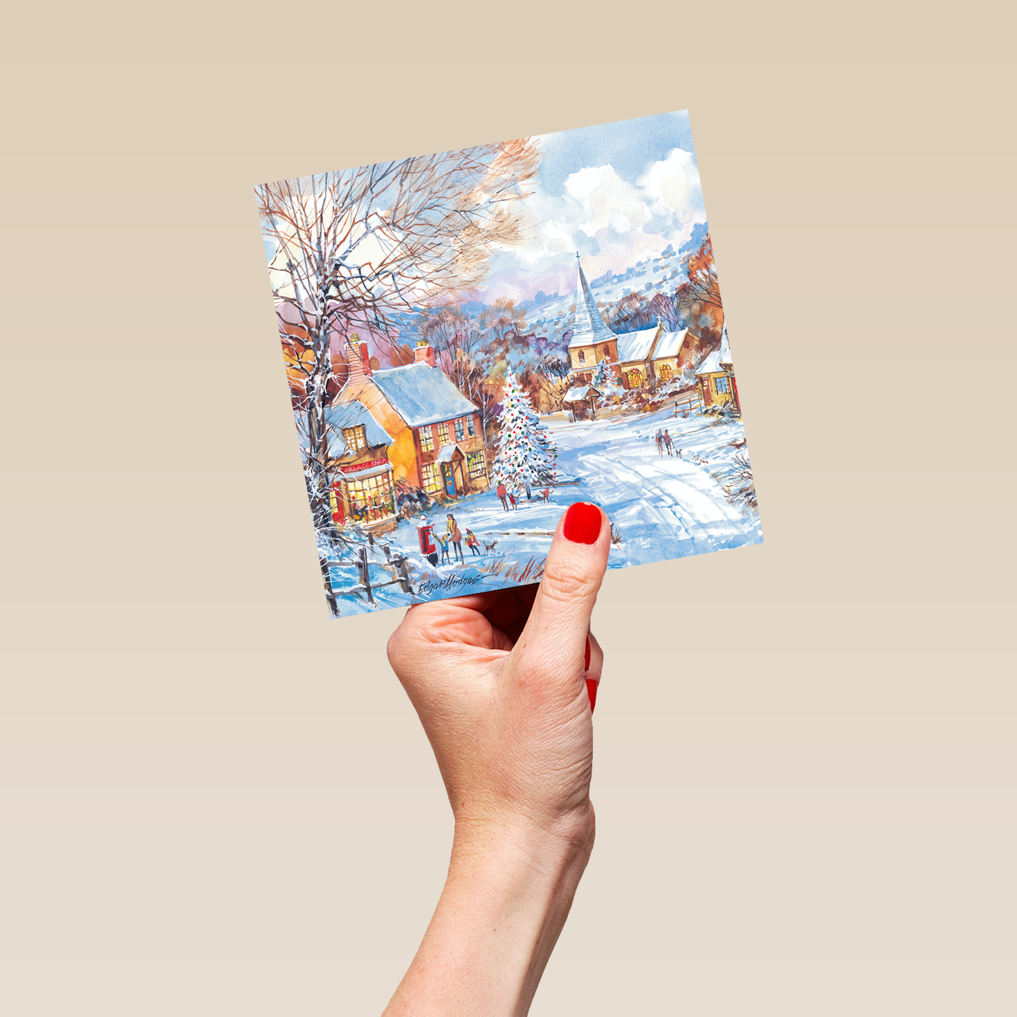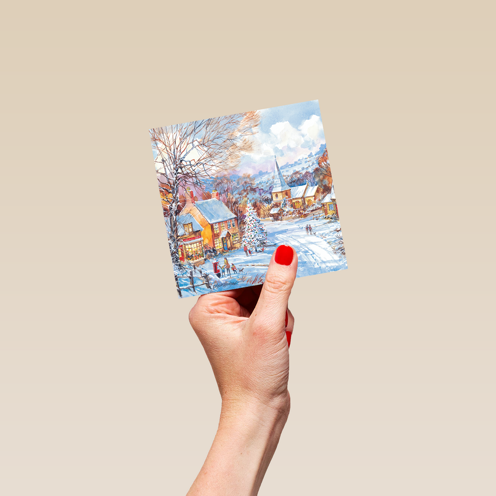 Show them you care with a personalised traditional Christmas snowy village scene card from Hallmark. Our greetings cards are printed on premium quality, FSC®-certified card & delivered nationwide. This card is available as standard 12cm by 12cm and large 15cm by 15cm.