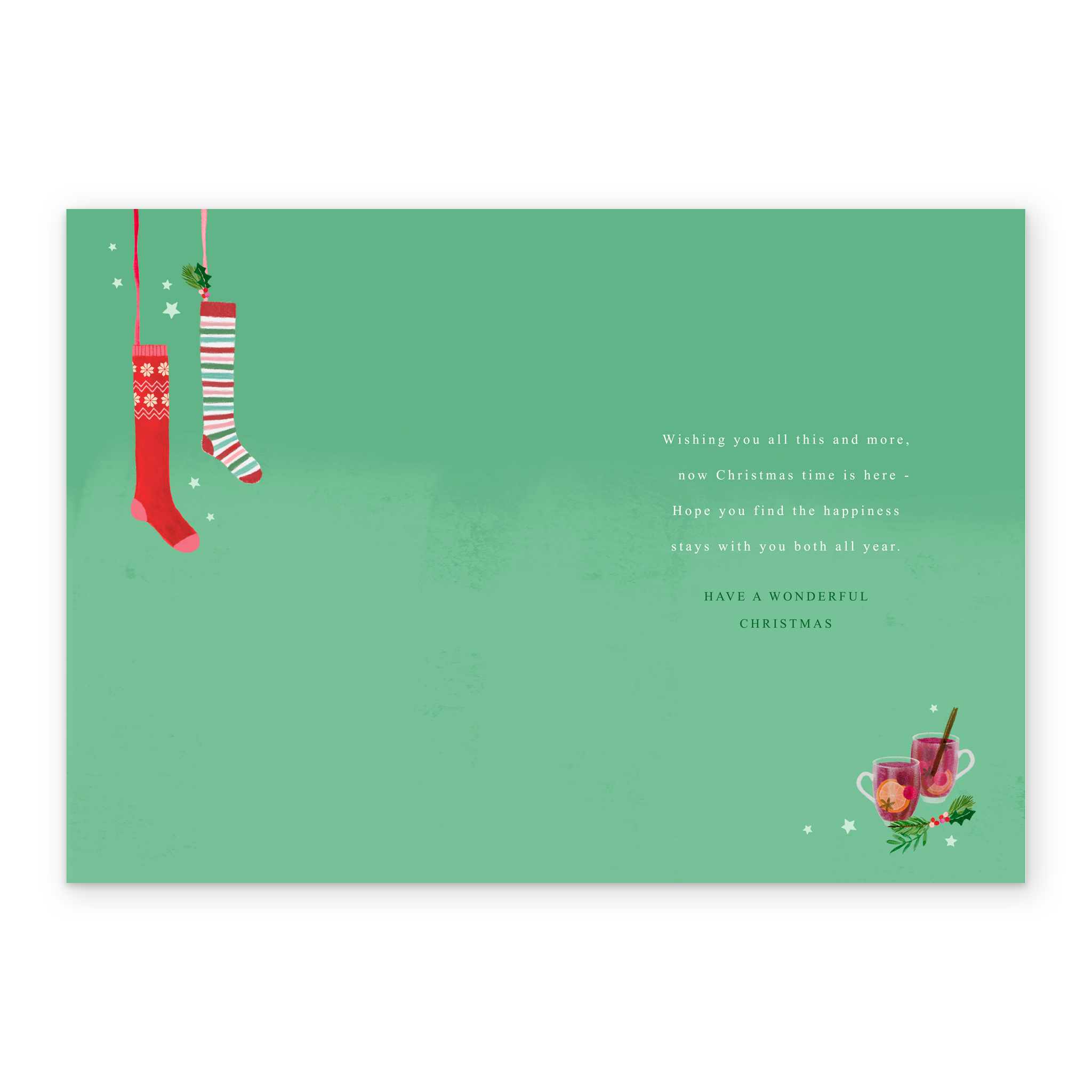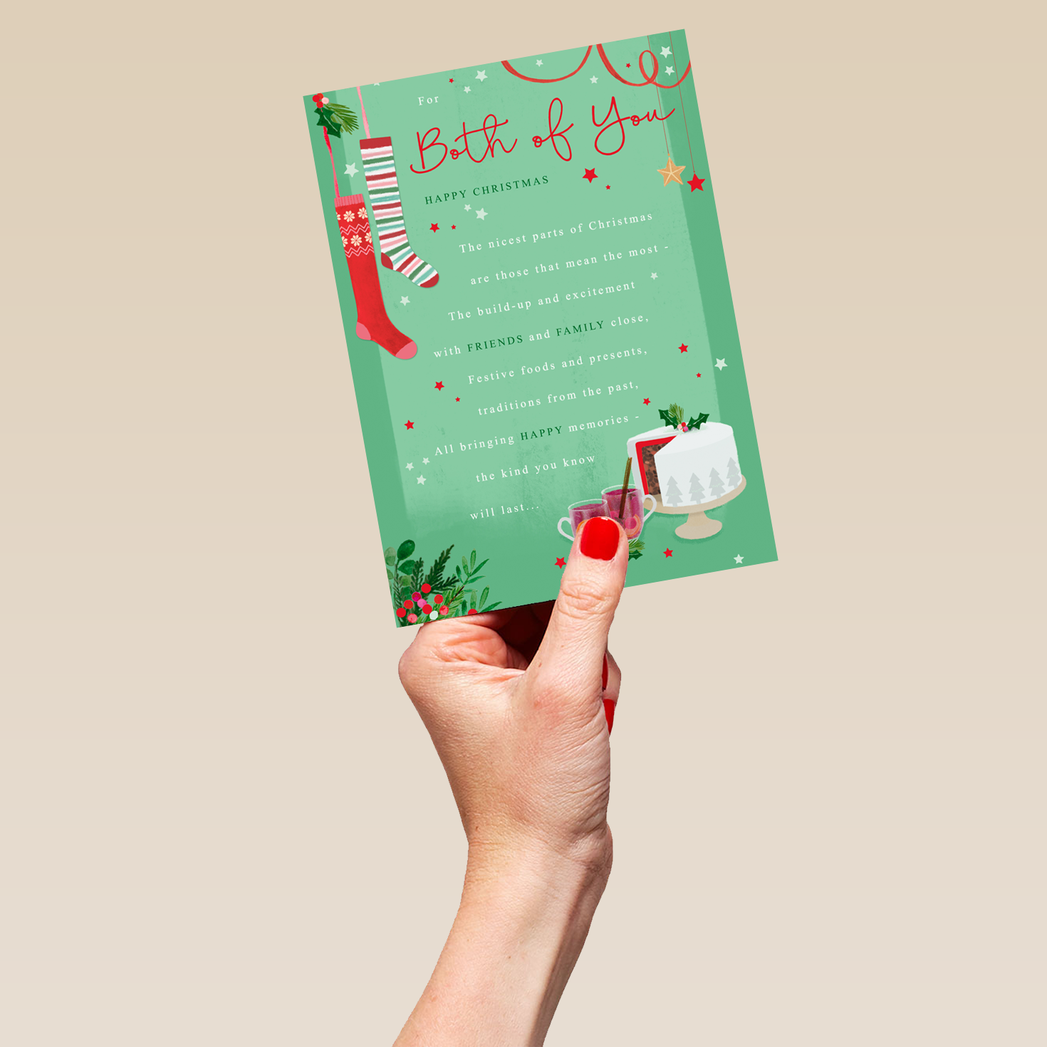 Show them you care with a personalised traditional Christmas to both cake & stockings verse card from Hallmark. Our greetings cards are printed on premium quality, FSC®-certified card & delivered nationwide. This card is available as standard 12cm by 16.7cm and large 15.5cm by 21.6cm.