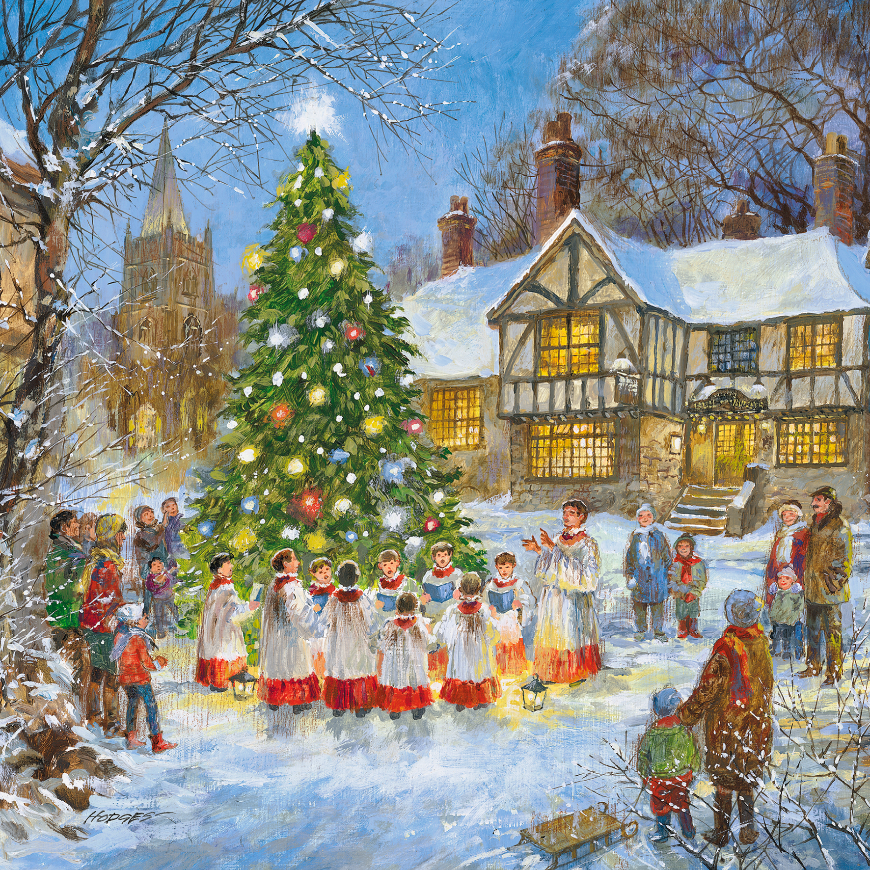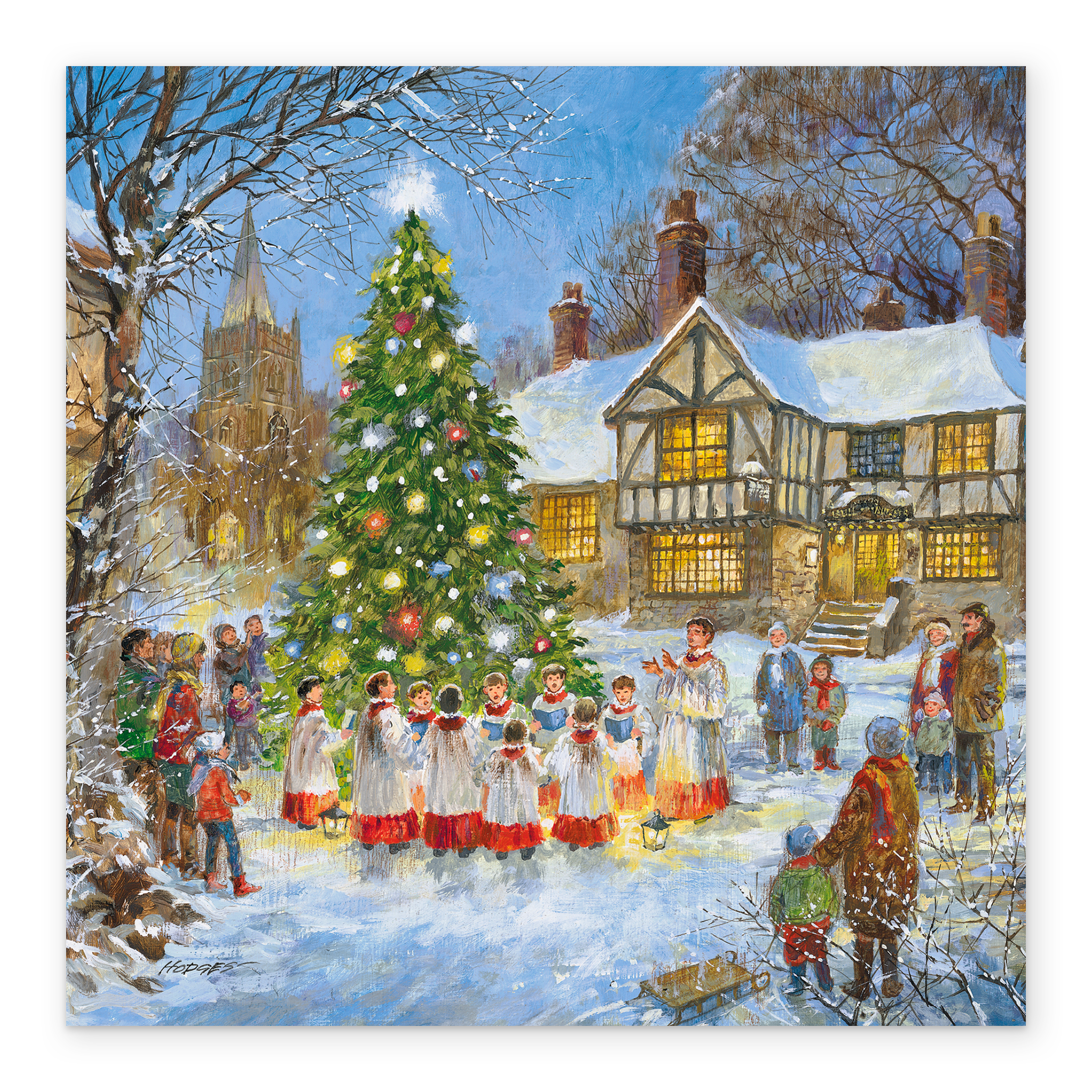 Show them you care with a personalised traditional Christmas town square tree lights card from Hallmark. Our greetings cards are printed on premium quality, FSC®-certified card & delivered nationwide. This card is available as standard 12cm by 12cm and large 15cm by 15cm.