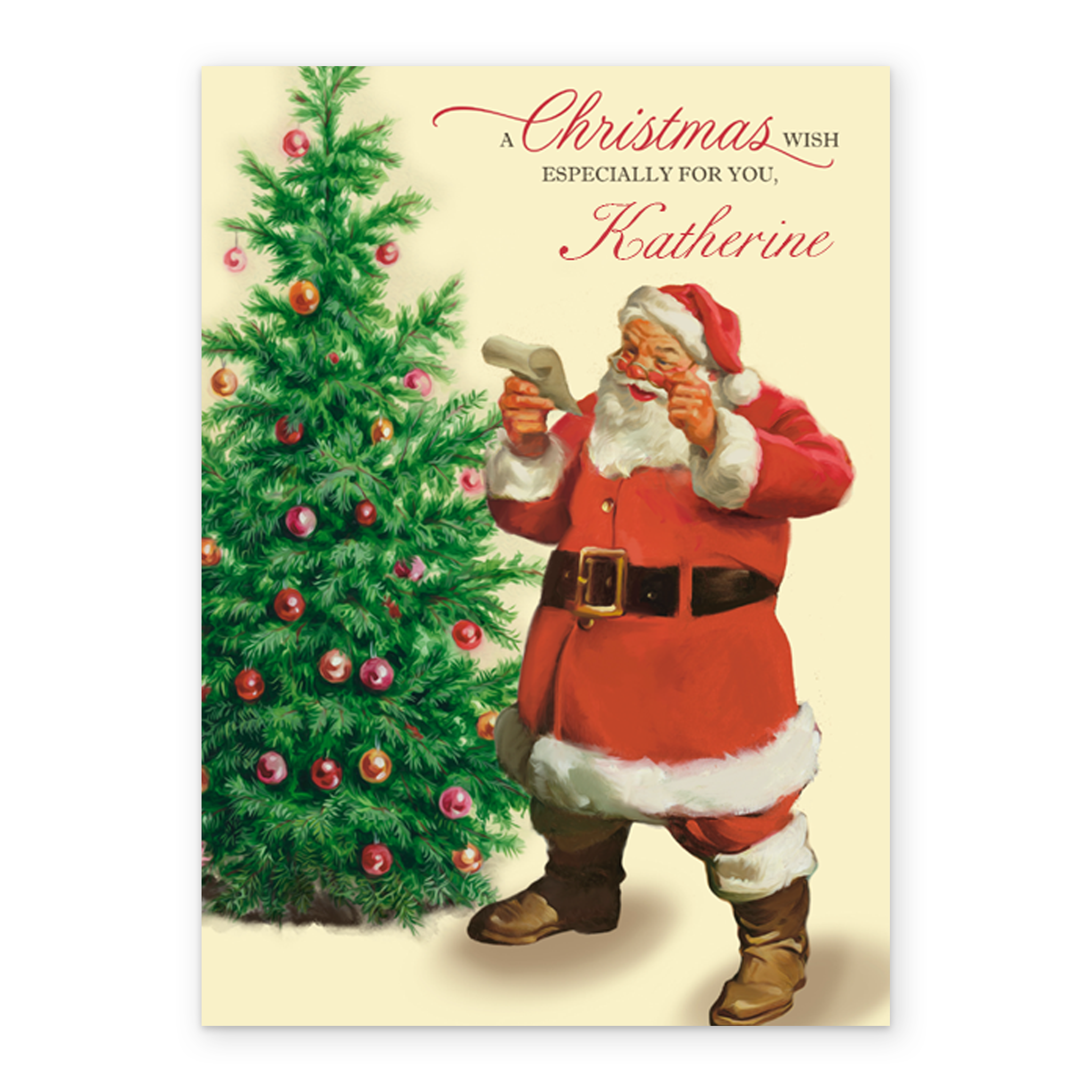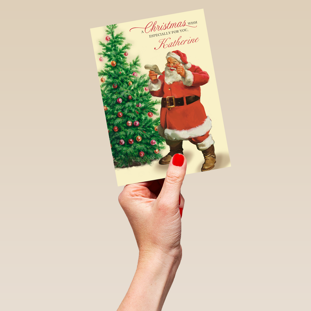 Printed on premium-quality board, this card features Santa checking his list next to a Christmas tree, and space to personalise a name.