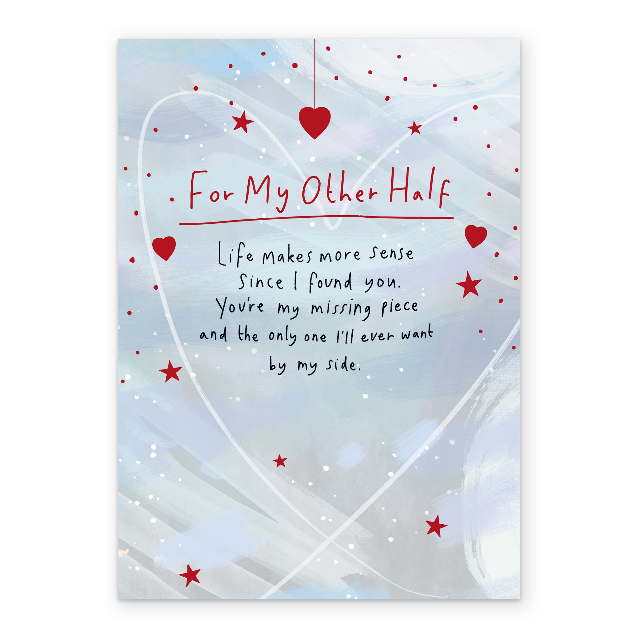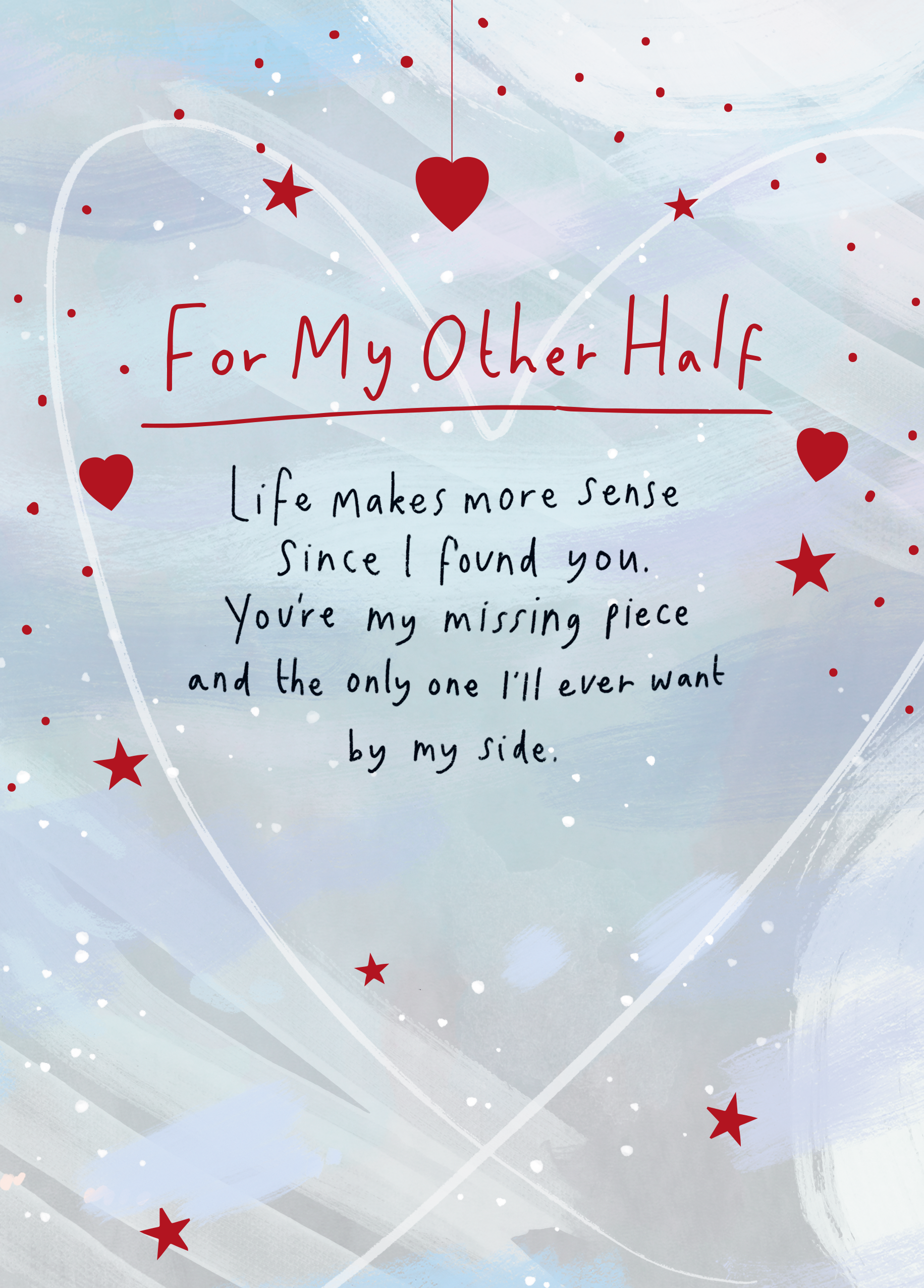 Printed on premium-quality board, this card features a watercolour design of sky and clouds overlaid with a white outline heart shape and small red hearts and stars surrounding red and black lettering, with the message 'For my other half. Life makes more sense since I found you. You're my missing piece and the only one I'll ever want by my side.', and comes complete with a co-ordinating white envelope.