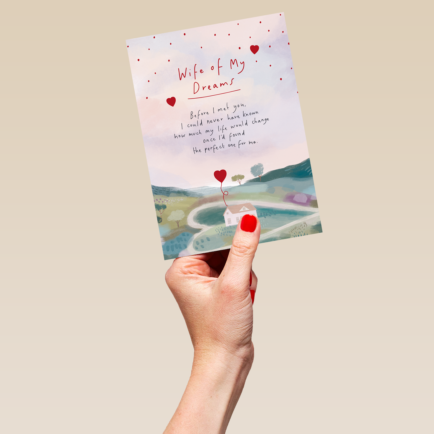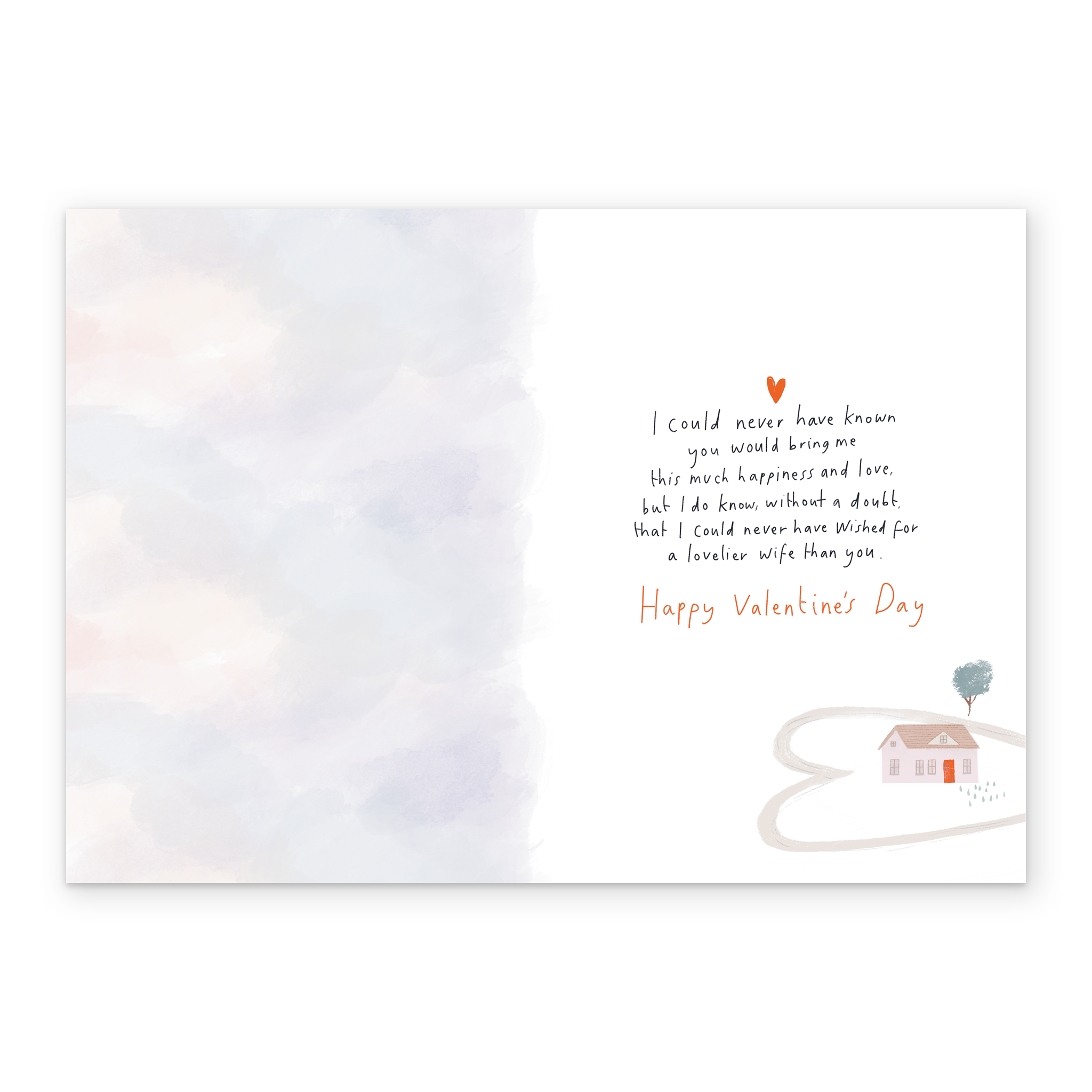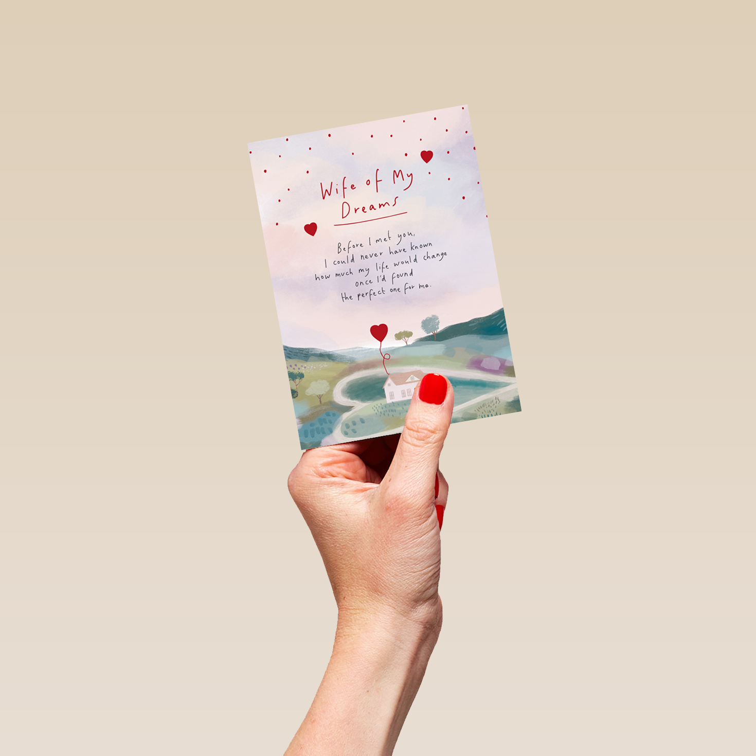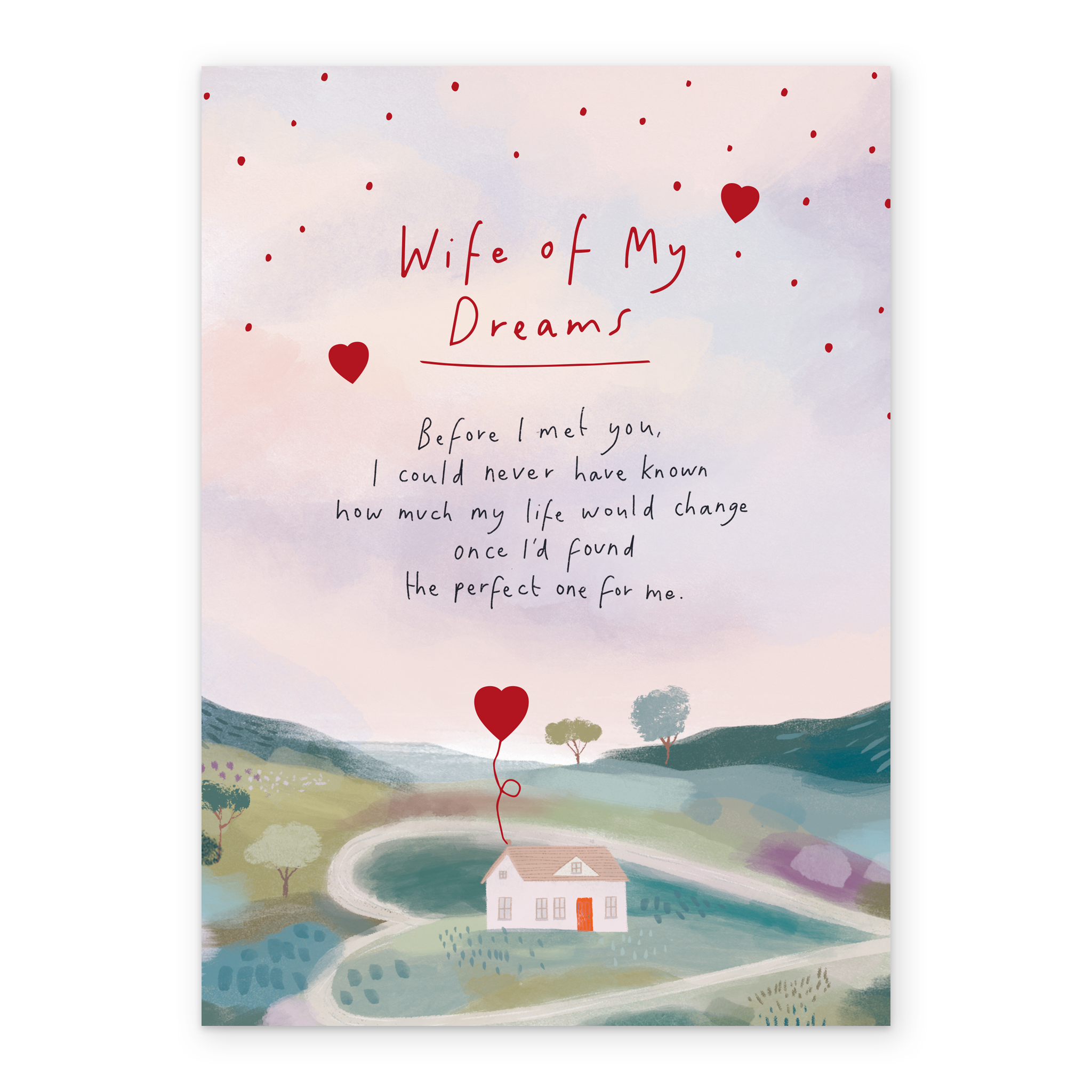 Printed on premium-quality board, this card features a watercolour design of a cute cottage on a hill beneath a pinkish sky overlaid with small red hearts surrounding red and black lettering, with the message 'Wife of My Dreams. Before I met you, I could never have known how much my life would change once I'd found the perfect one for me. ', and comes complete with a co-ordinating white envelope.