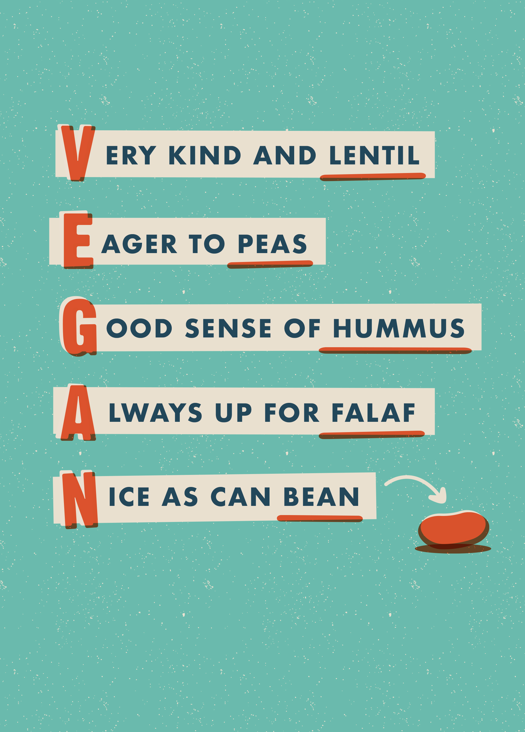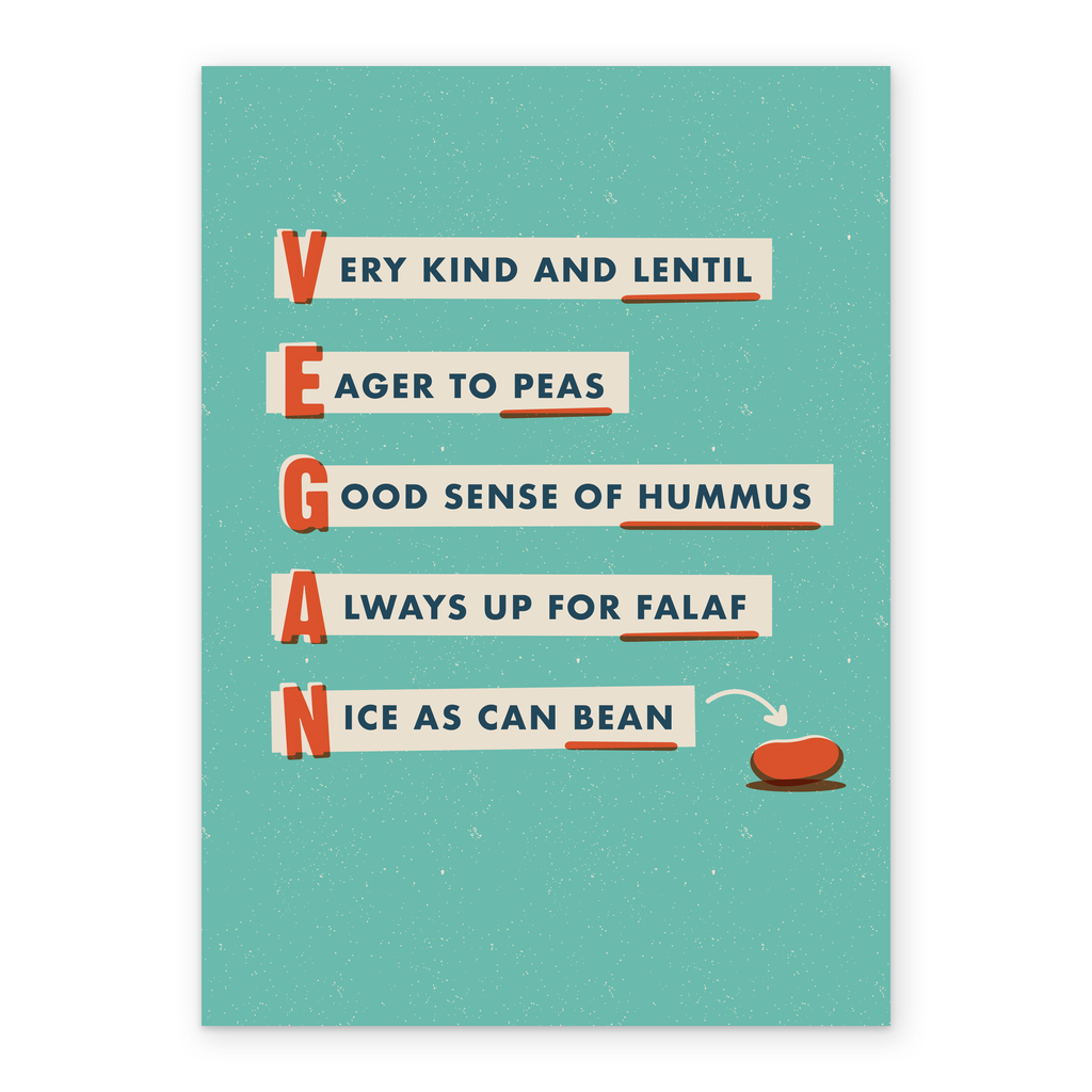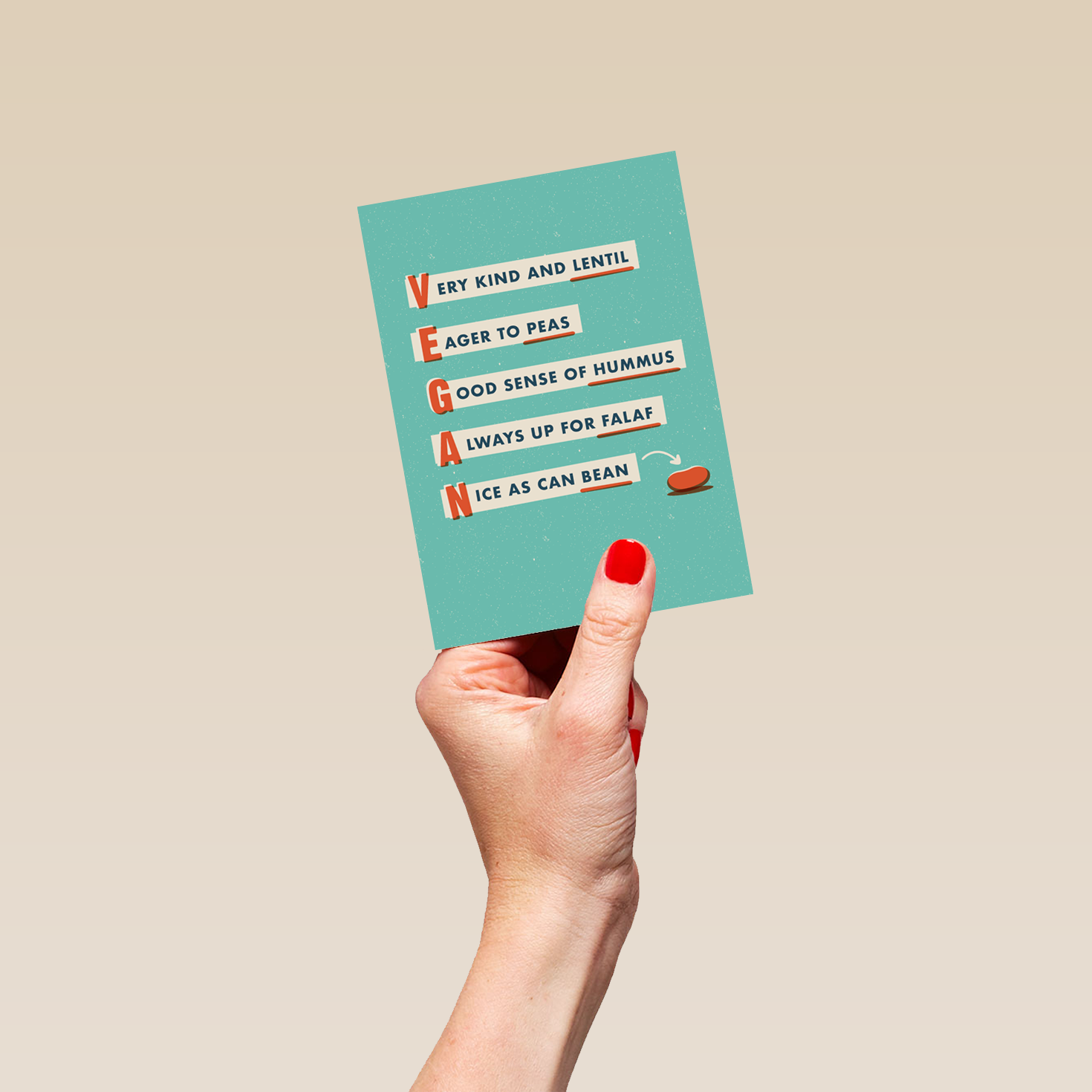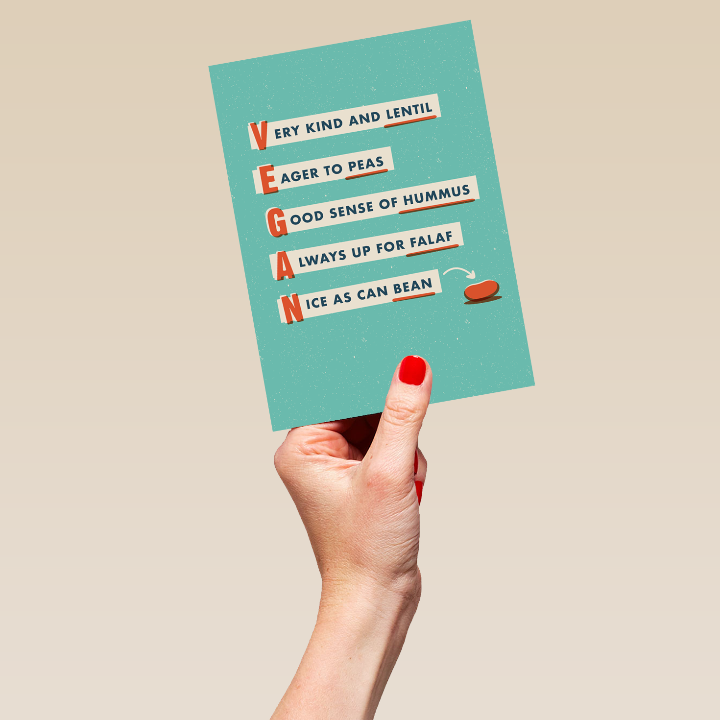 Show them you care with a personalised Veganuary funny letters card from Hallmark. Our funny cards are printed on premium quality, FSC®-certified card & delivered nationwide. This card is available as standard 12cm by 16.7cm and large 15.5cm by 21.6cm.