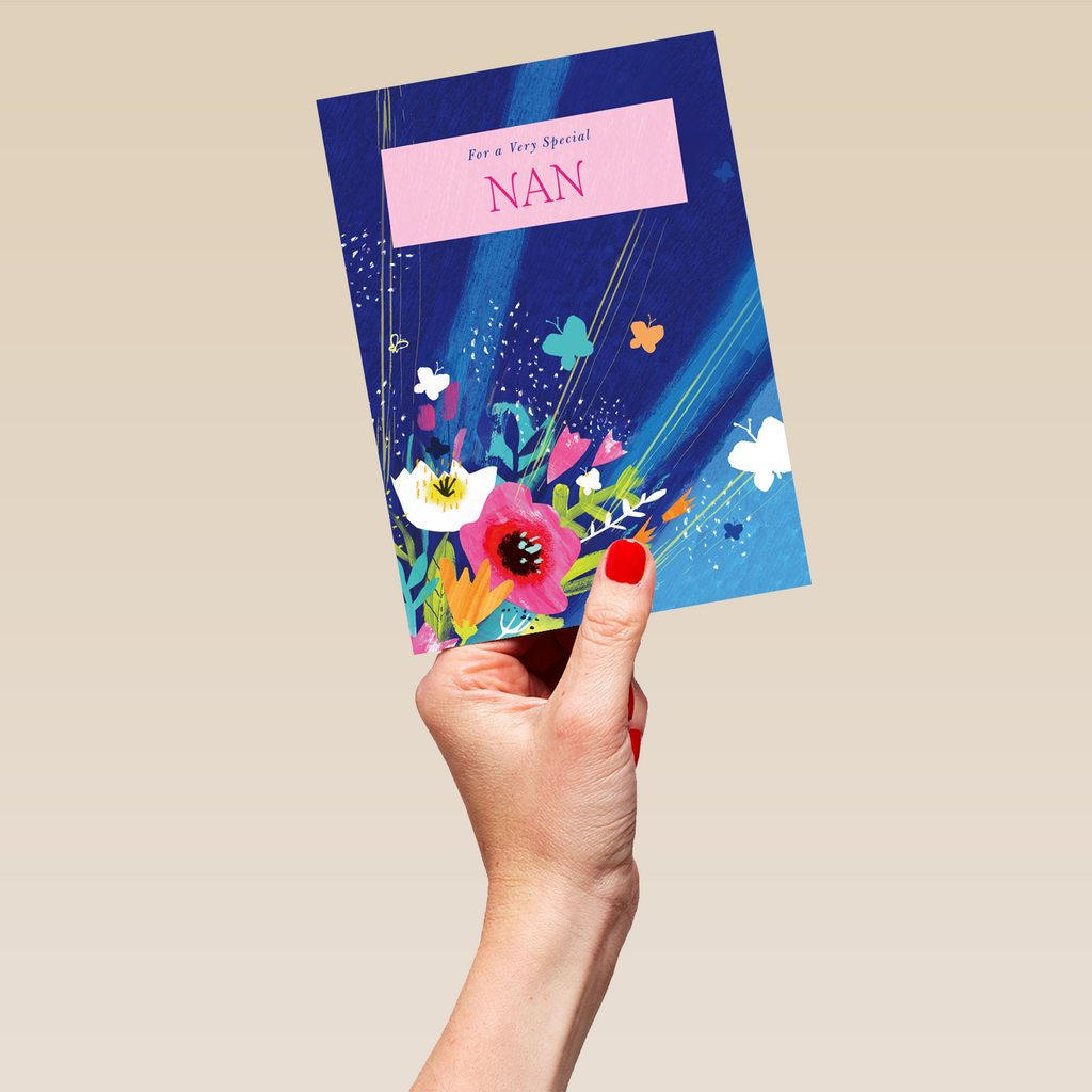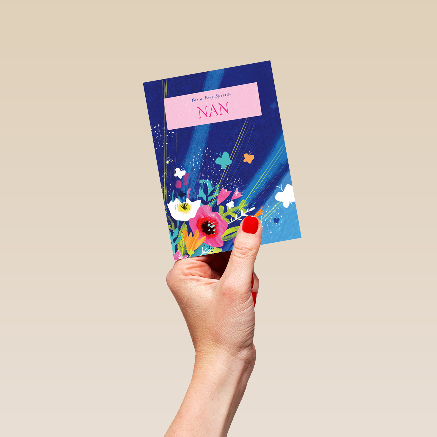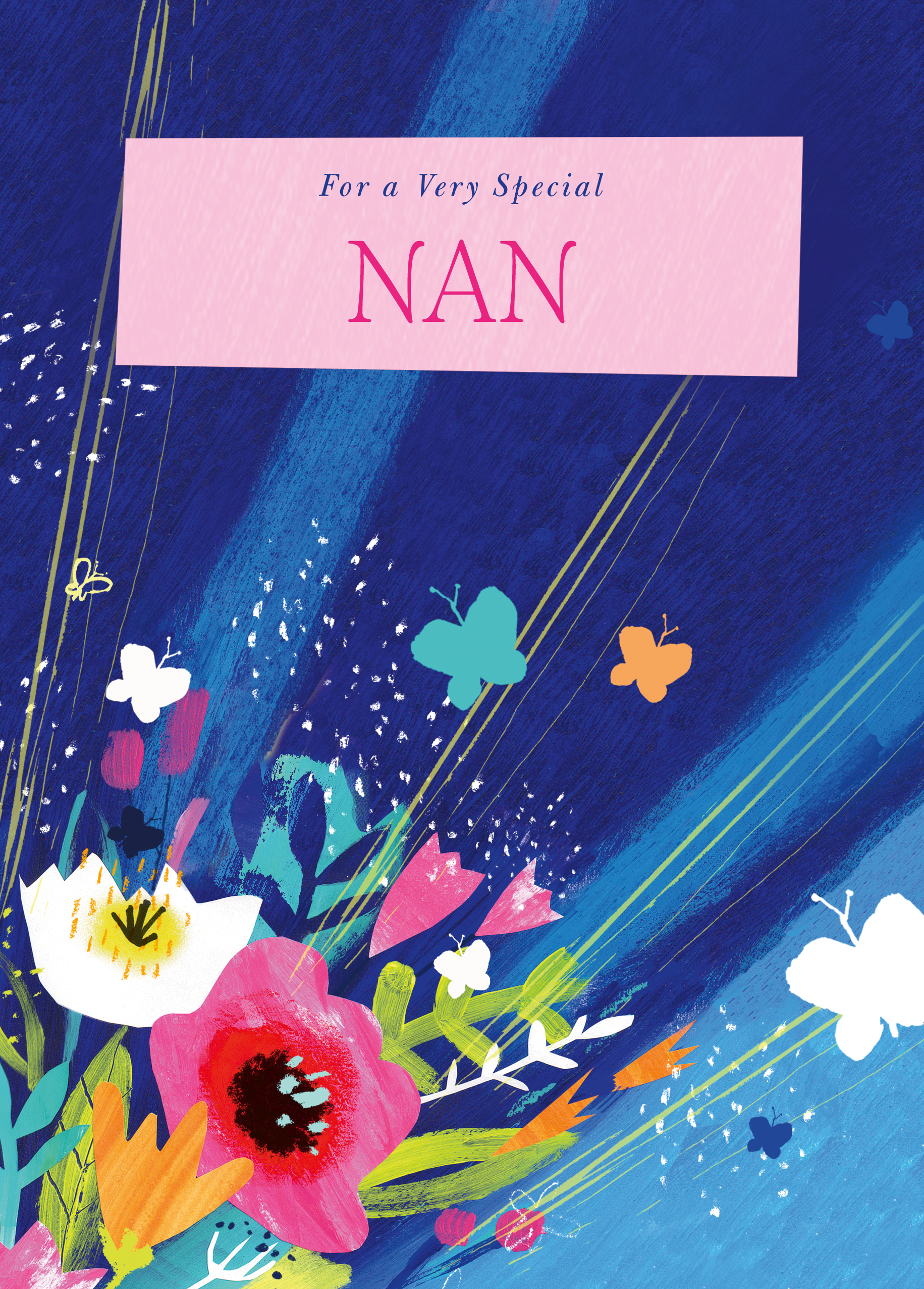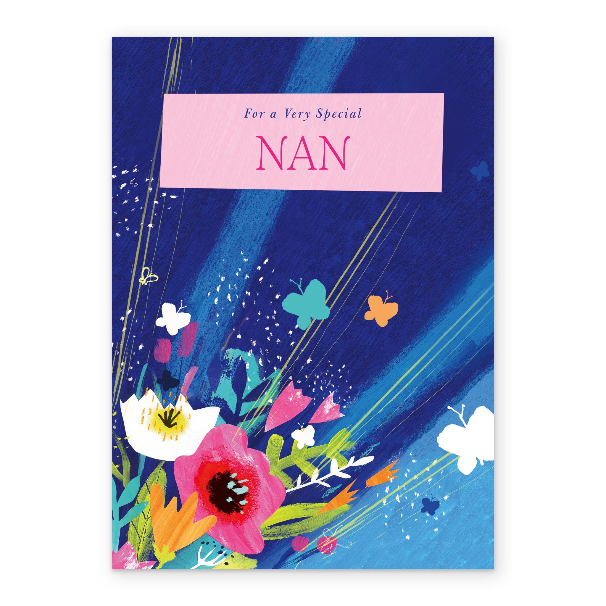 Printed on premium-quality board, this card features a vibrant colourful contemporary floral bouquet and butterflies on a blue background, with the message 'For a very special nan', space to personalise a name, and comes complete with a co-ordinating white envelope.