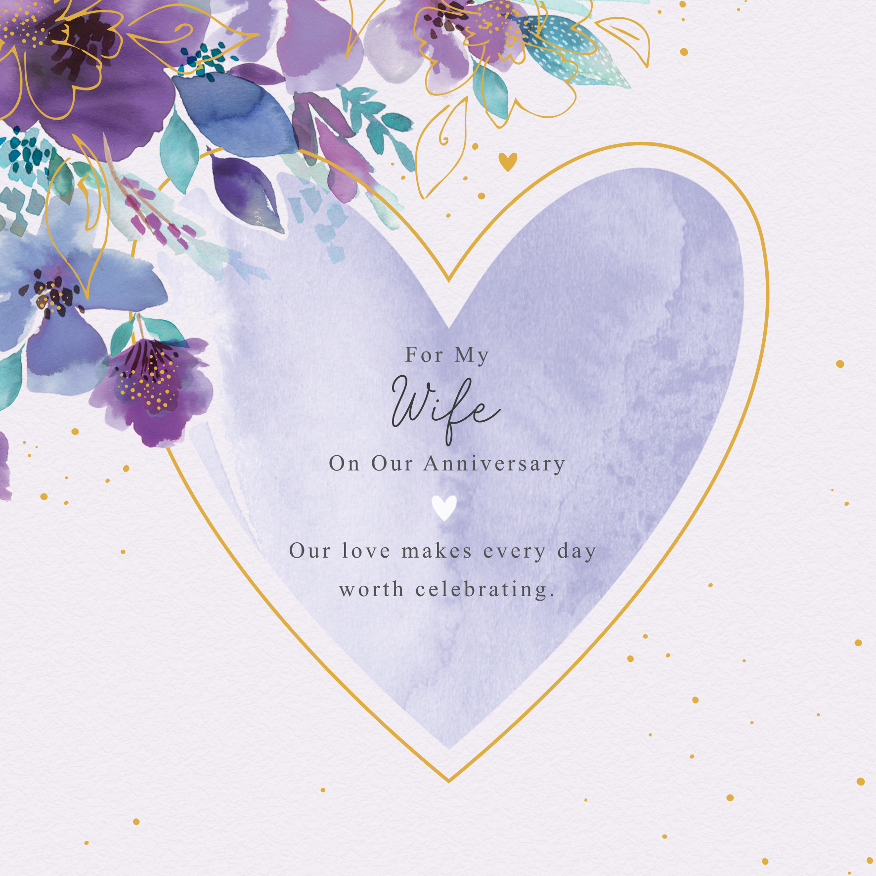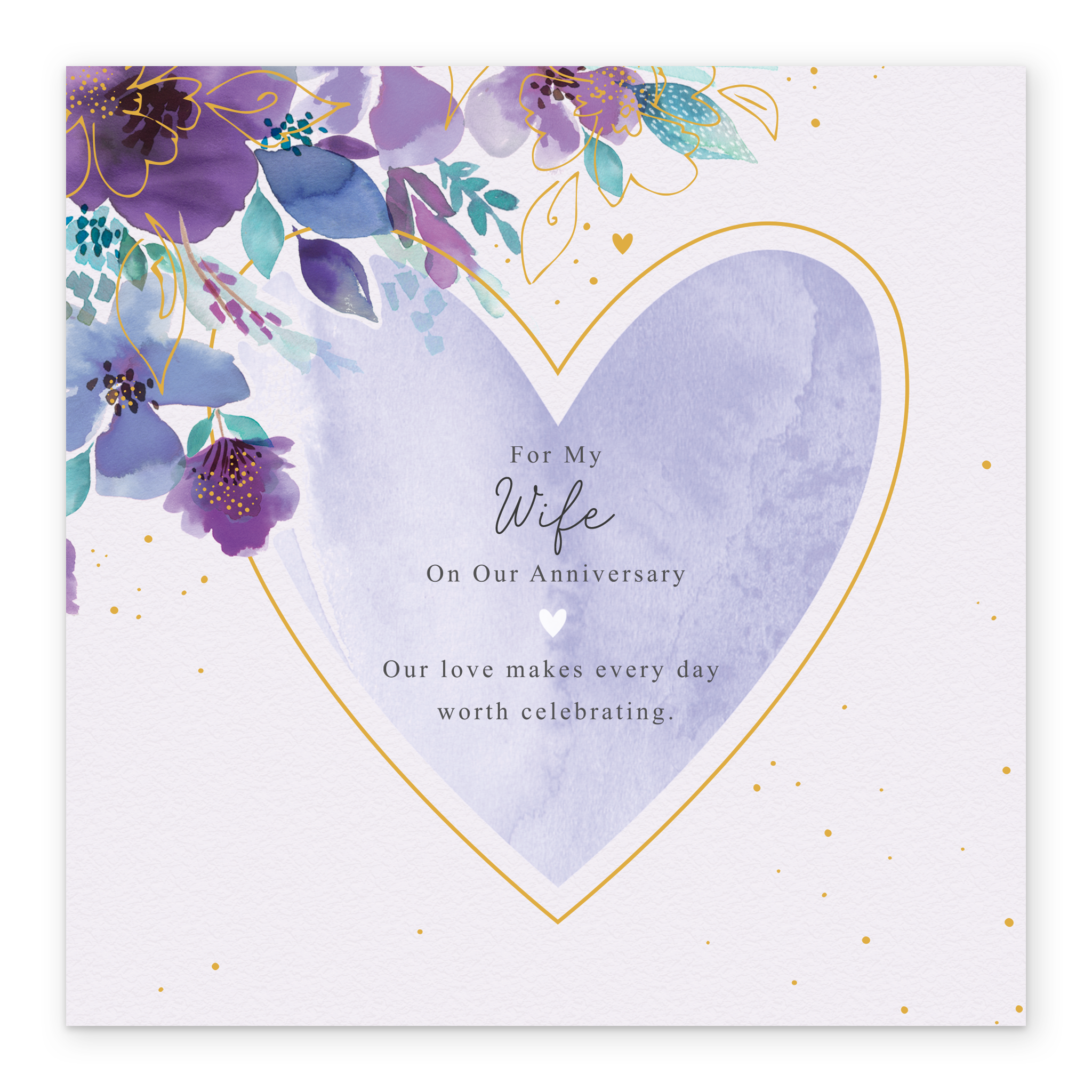 Printed on premium-quality board, this card features a blue watercolour heart, framed by a gold outline, set against a gold-flecked white background with blue and purple watercolour flowers in the top left corner of the card and black lettering in the centre of the heart, with the message 'For My [NAME] On Our Anniversary. Our love makes every day worth celebrating.', space to personalise a name, and comes complete with a co-ordinating white envelope.
