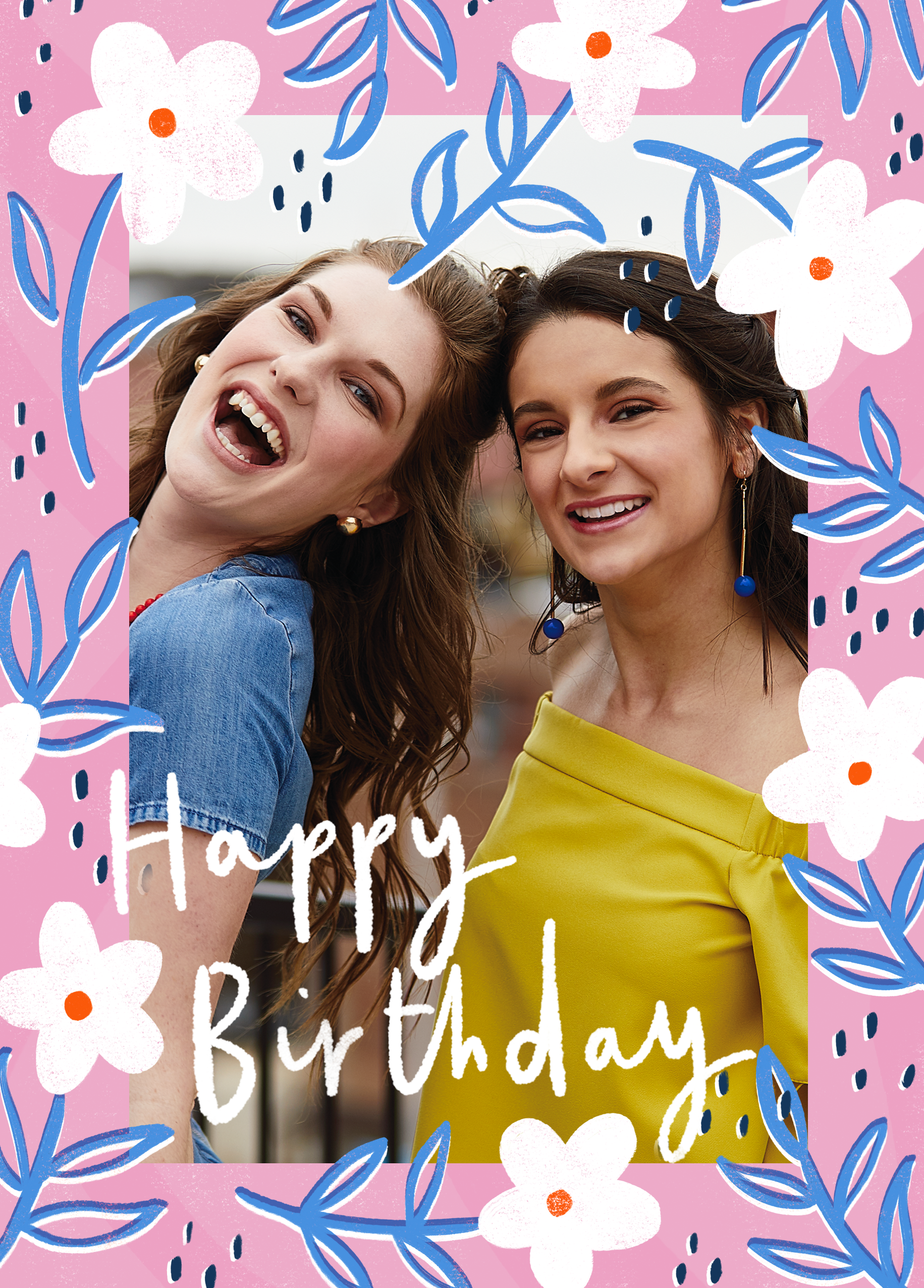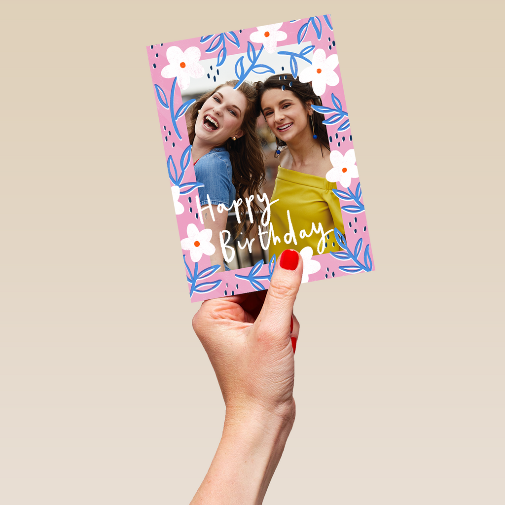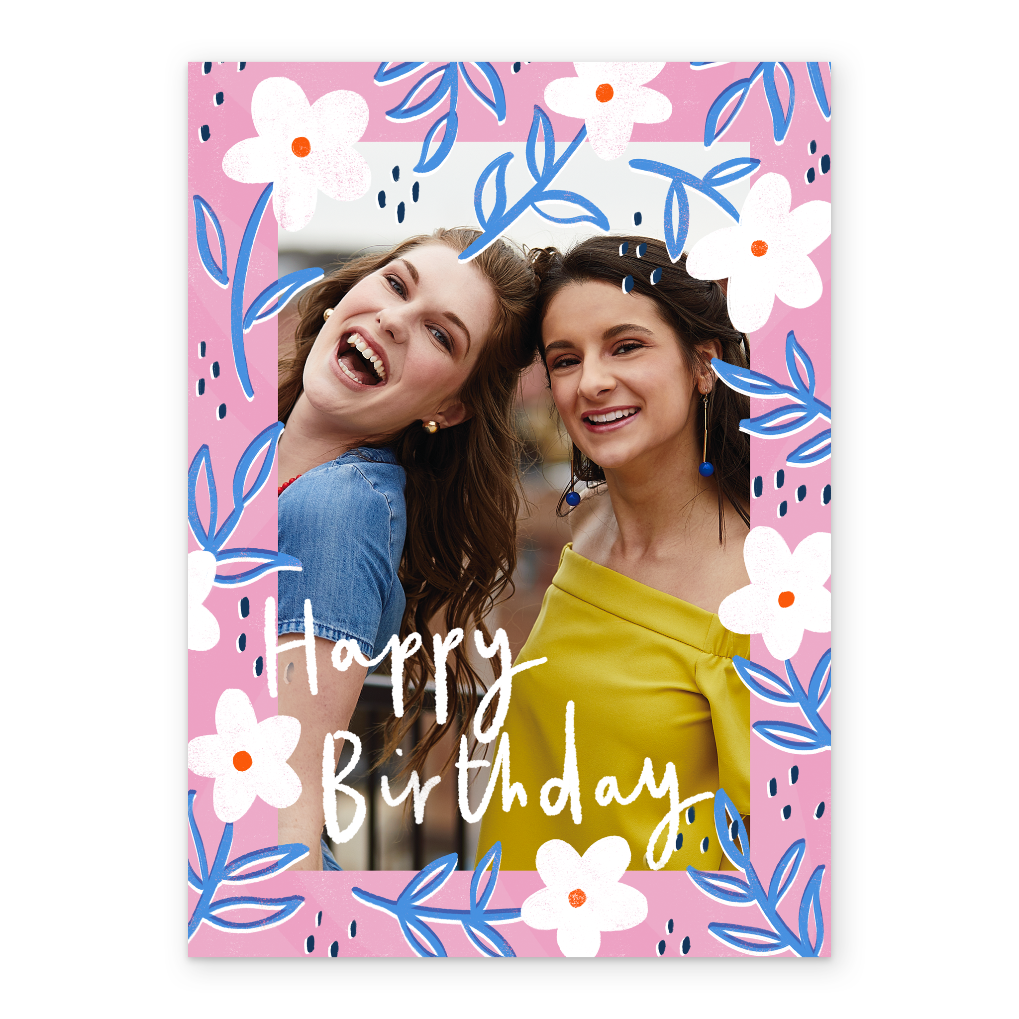 Printed on premium-quality board, this card features a fun flower pattern with a pink background, with the message 'Happy birthday', space to upload a photo, and comes complete with a co-ordinating white envelope.