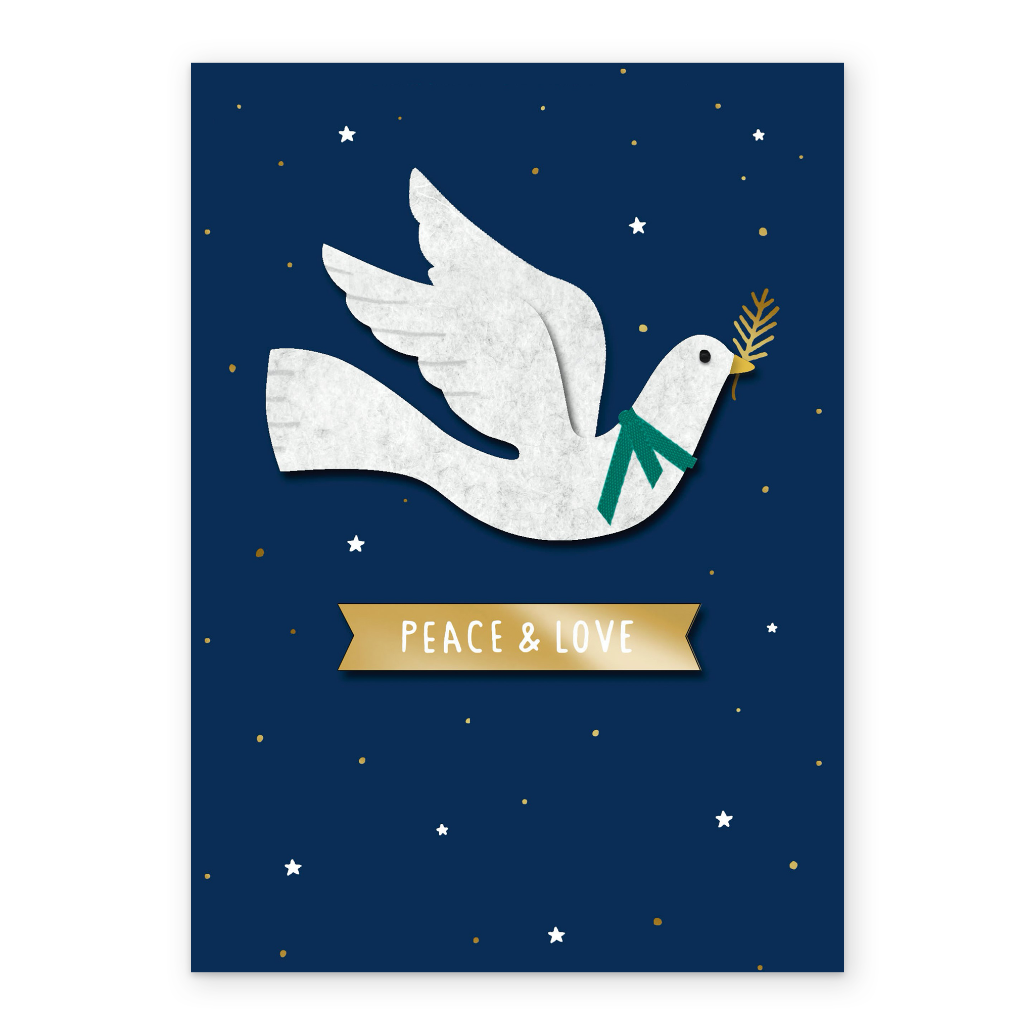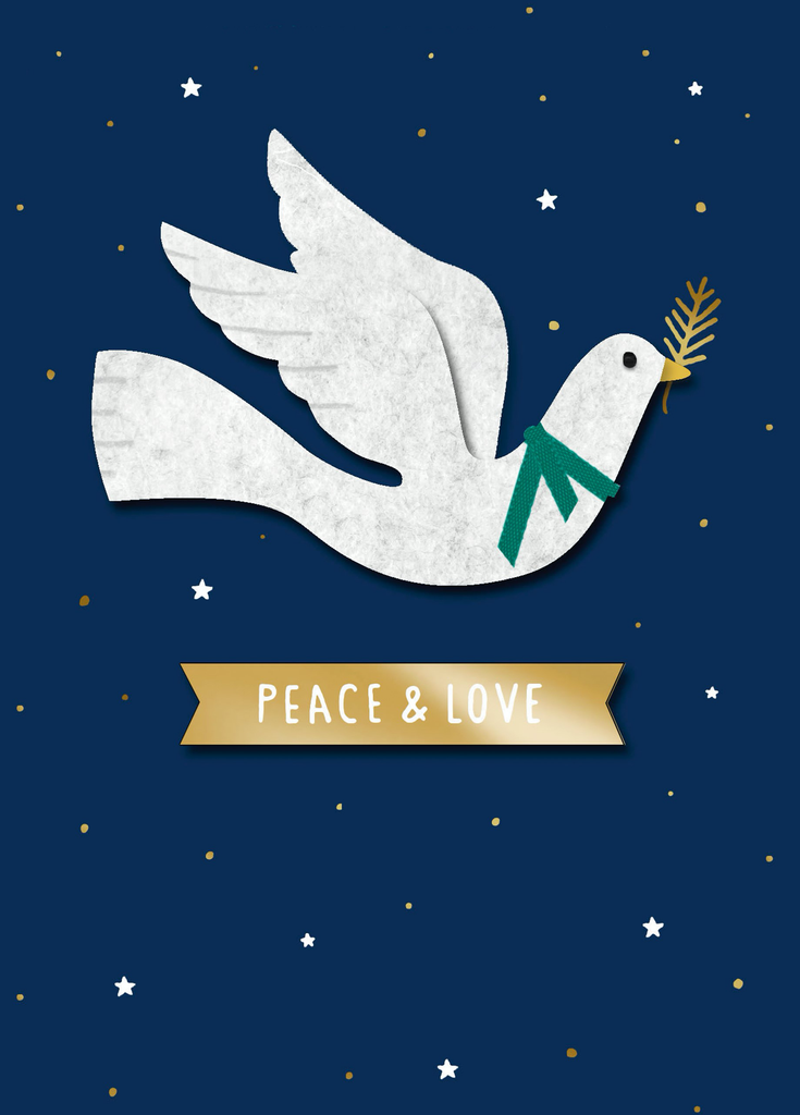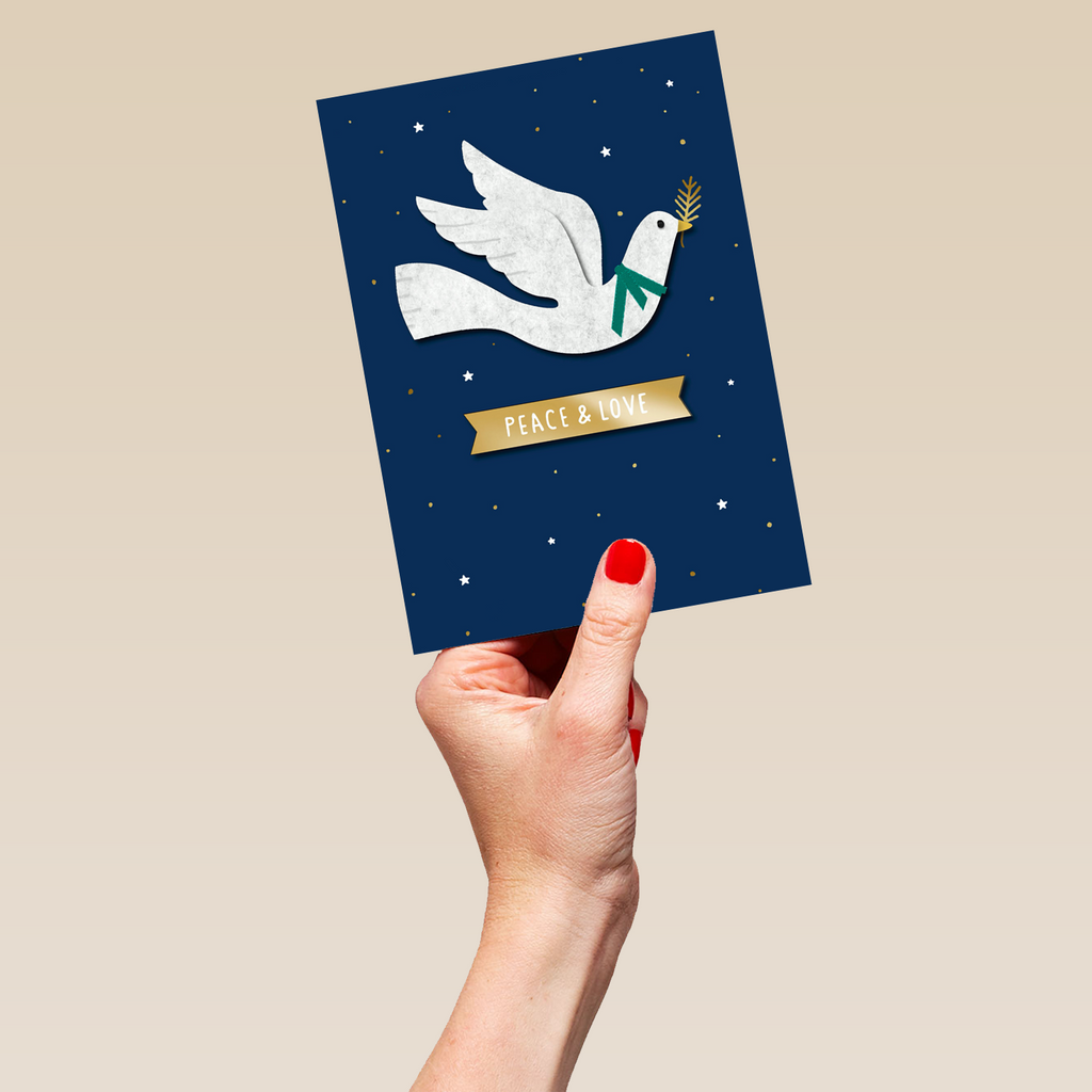 Show them you care with a personalised white peace dove card from Hallmark. Our Christmas cards are printed on premium quality, FSC®-certified card & delivered nationwide. This card is available as standard 12cm by 16.7cm and large 15.5cm by 21.6cm.