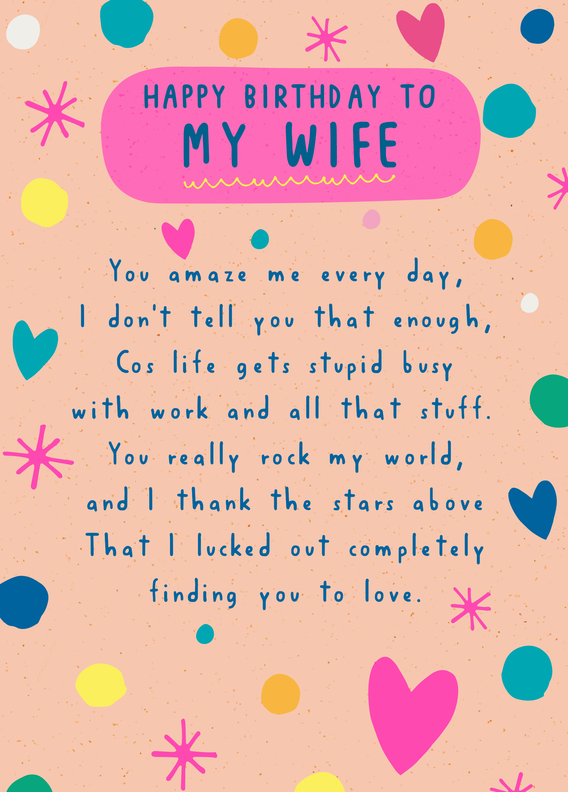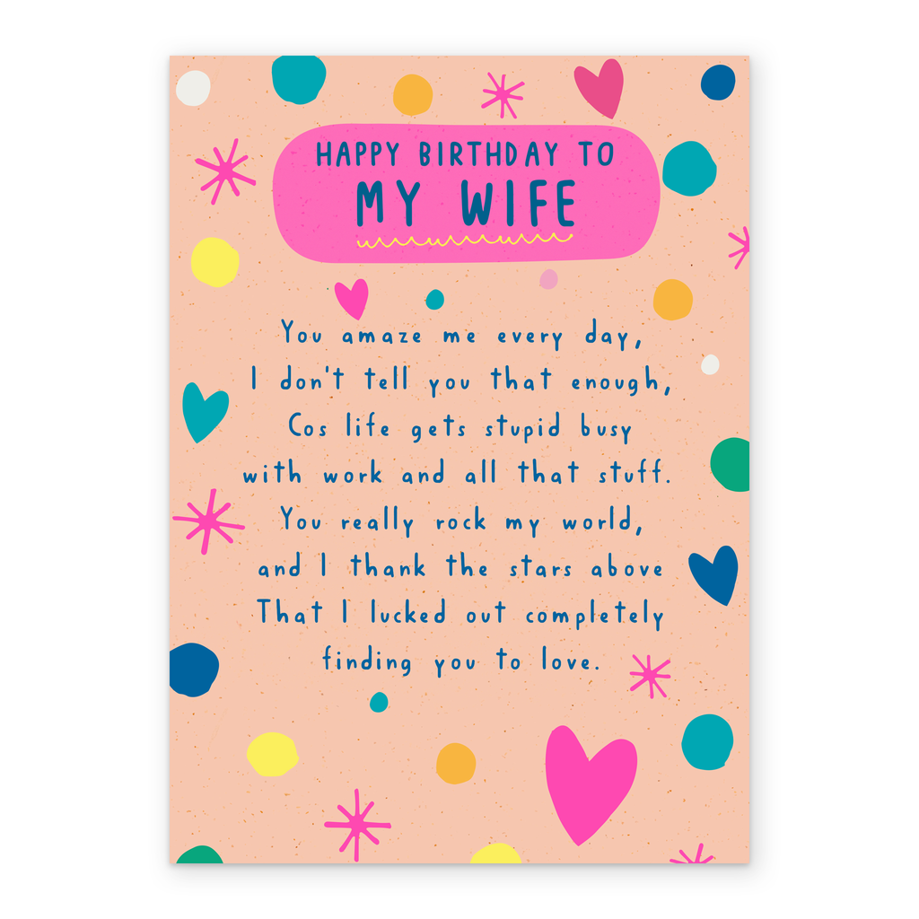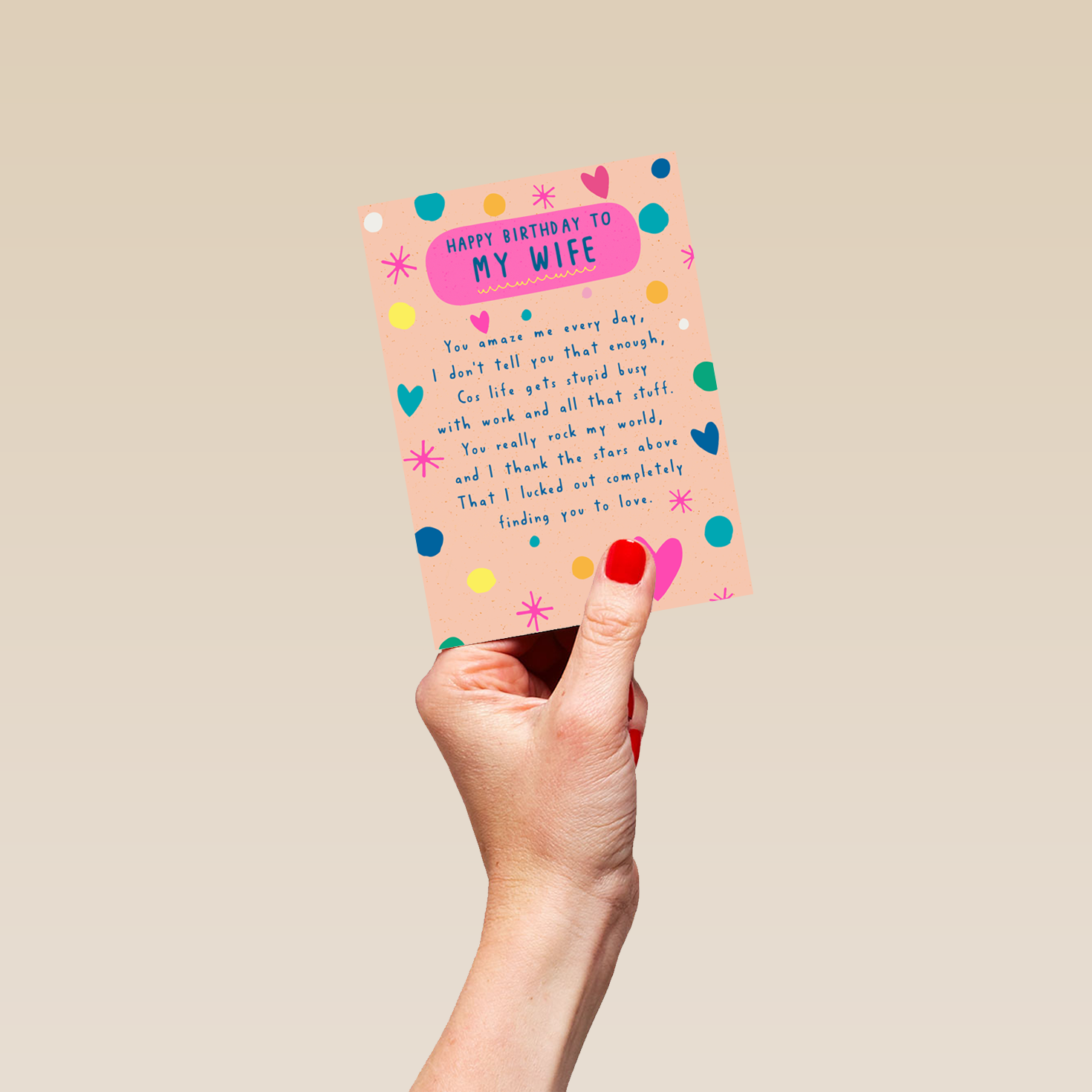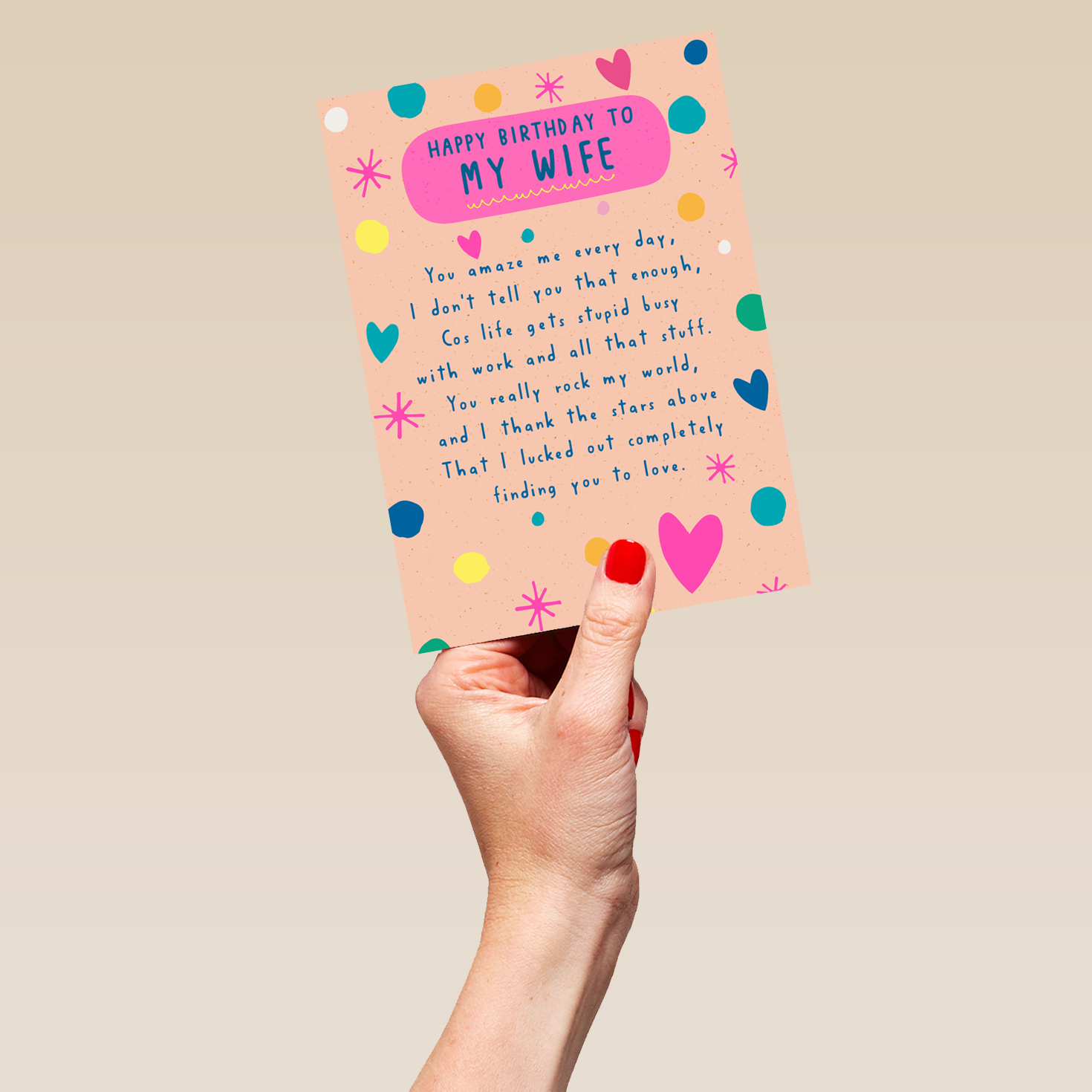 Show them you care with a personalised wife cute heart verse card from Hallmark. Our birthday cards are printed on premium quality, FSC®-certified card & delivered nationwide. This card is available as standard 12cm by 16.7cm and large 15.5cm by 21.6cm.
