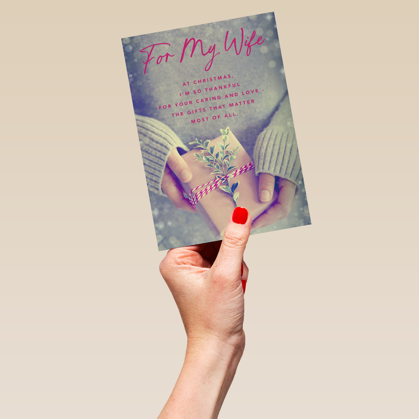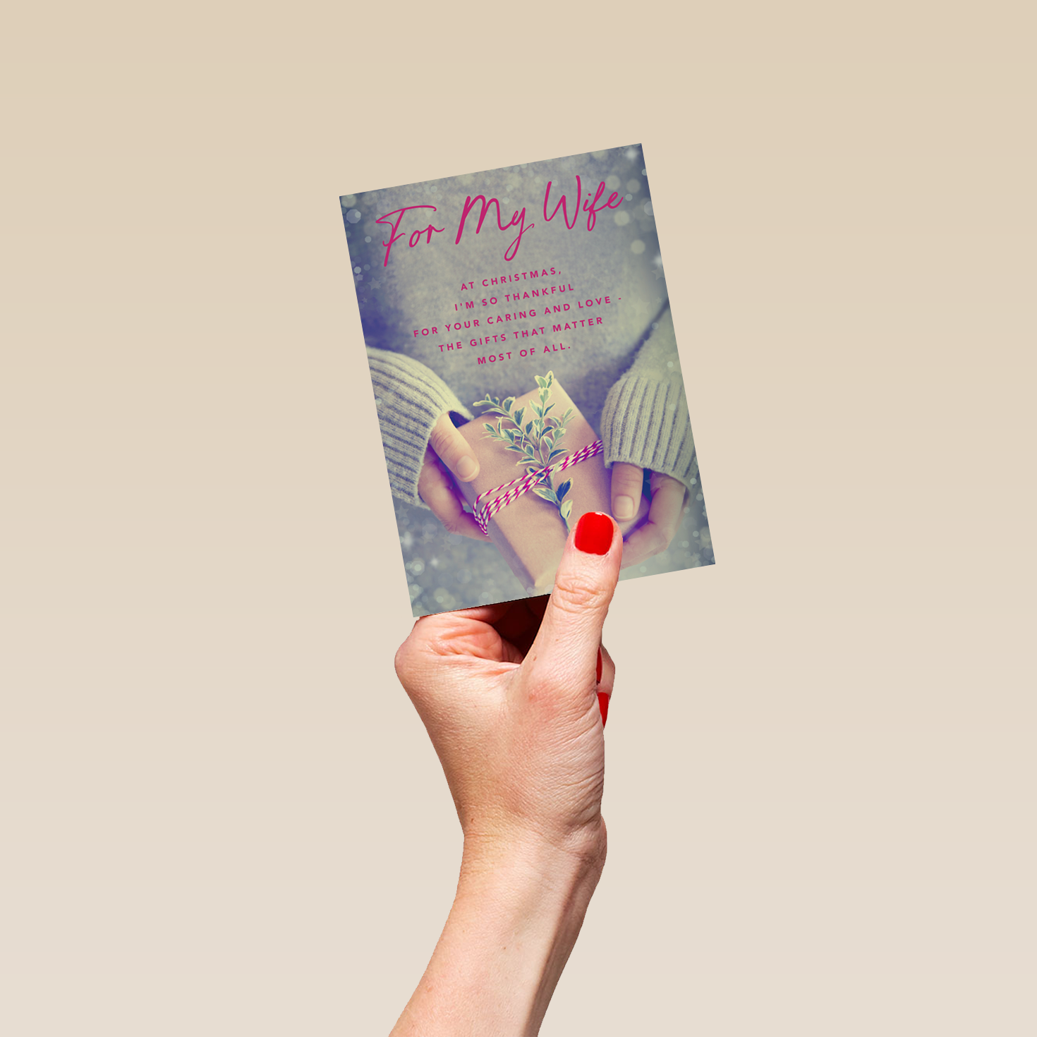 Show them you care with a personalised wife love and care gifts card from Hallmark. Our Christmas cards are printed on premium quality, FSC®-certified card & delivered nationwide. This card is available as standard 12cm by 16.7cm and large 15.5cm by 21.6cm.