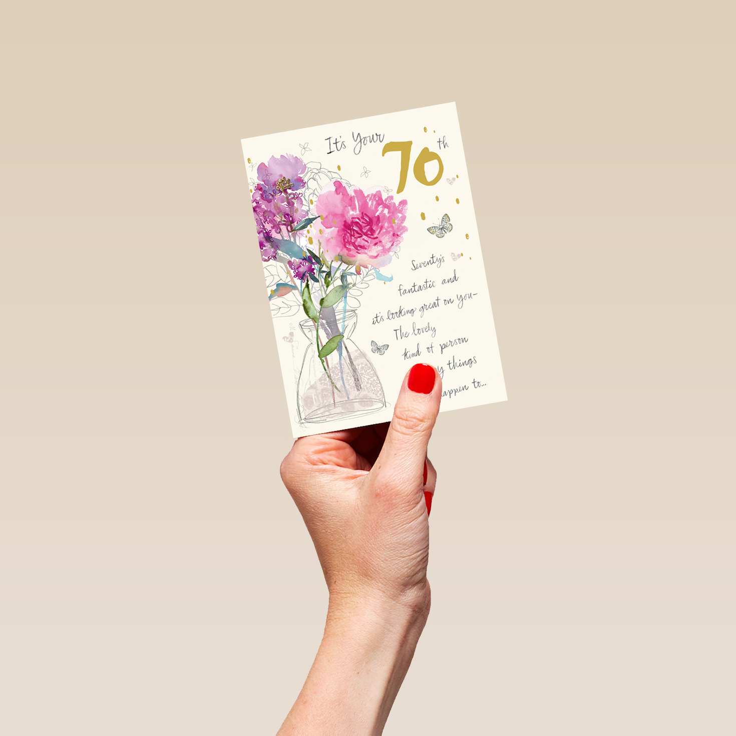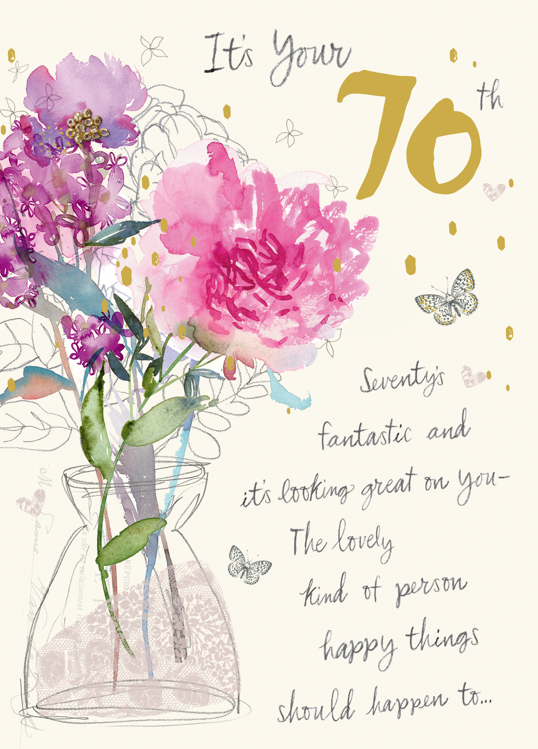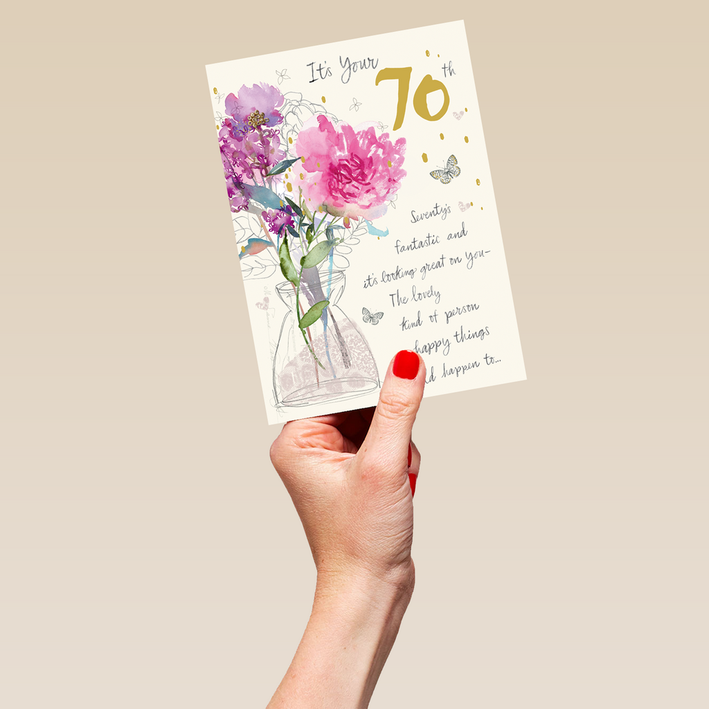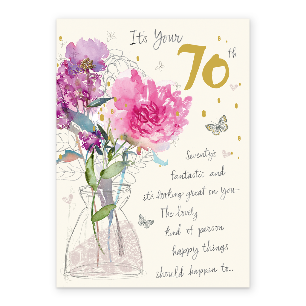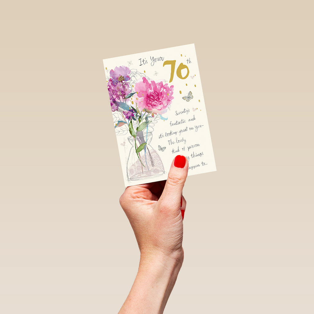 Printed on premium-quality board, this card features watercolour style florals, with the message 'It’s your 70th. Seventy is fantastic and it’s looking great on you - The kind of person lovely things happen to…', and comes complete with a co-ordinating white envelope.