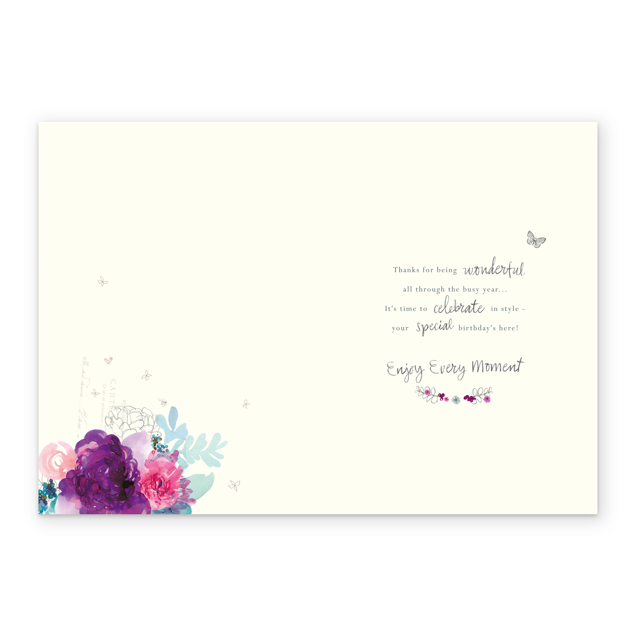 Message inside reads: Thanks for being wonderful all through the busy year… It’s time to celebrate in style - your special birthday’s here! Enjoy Every Moment