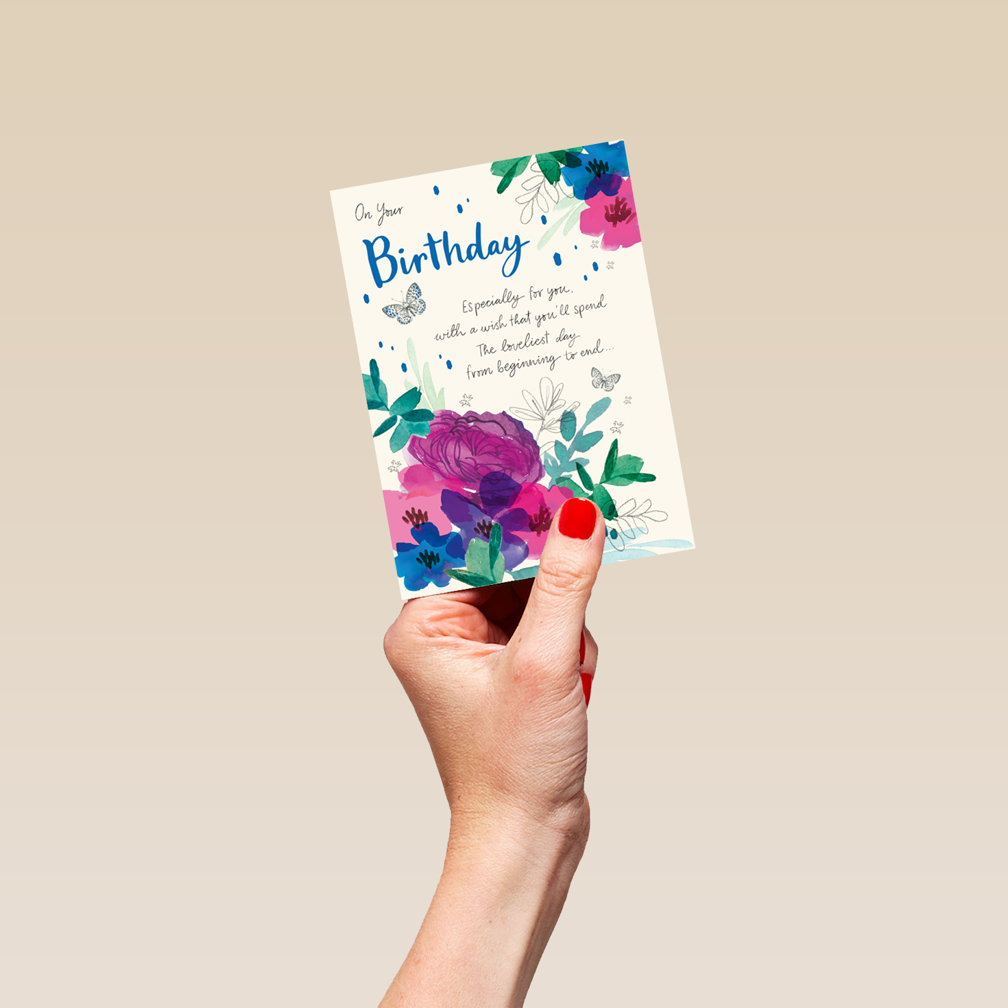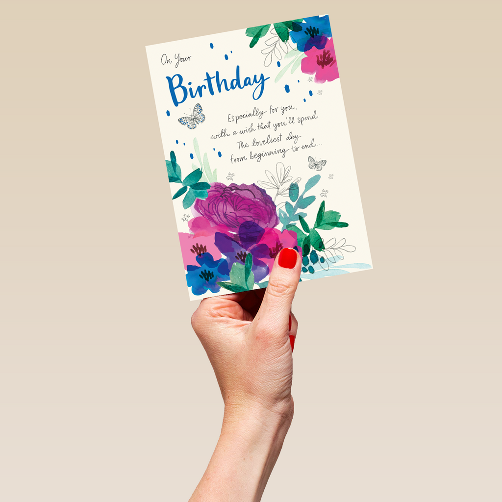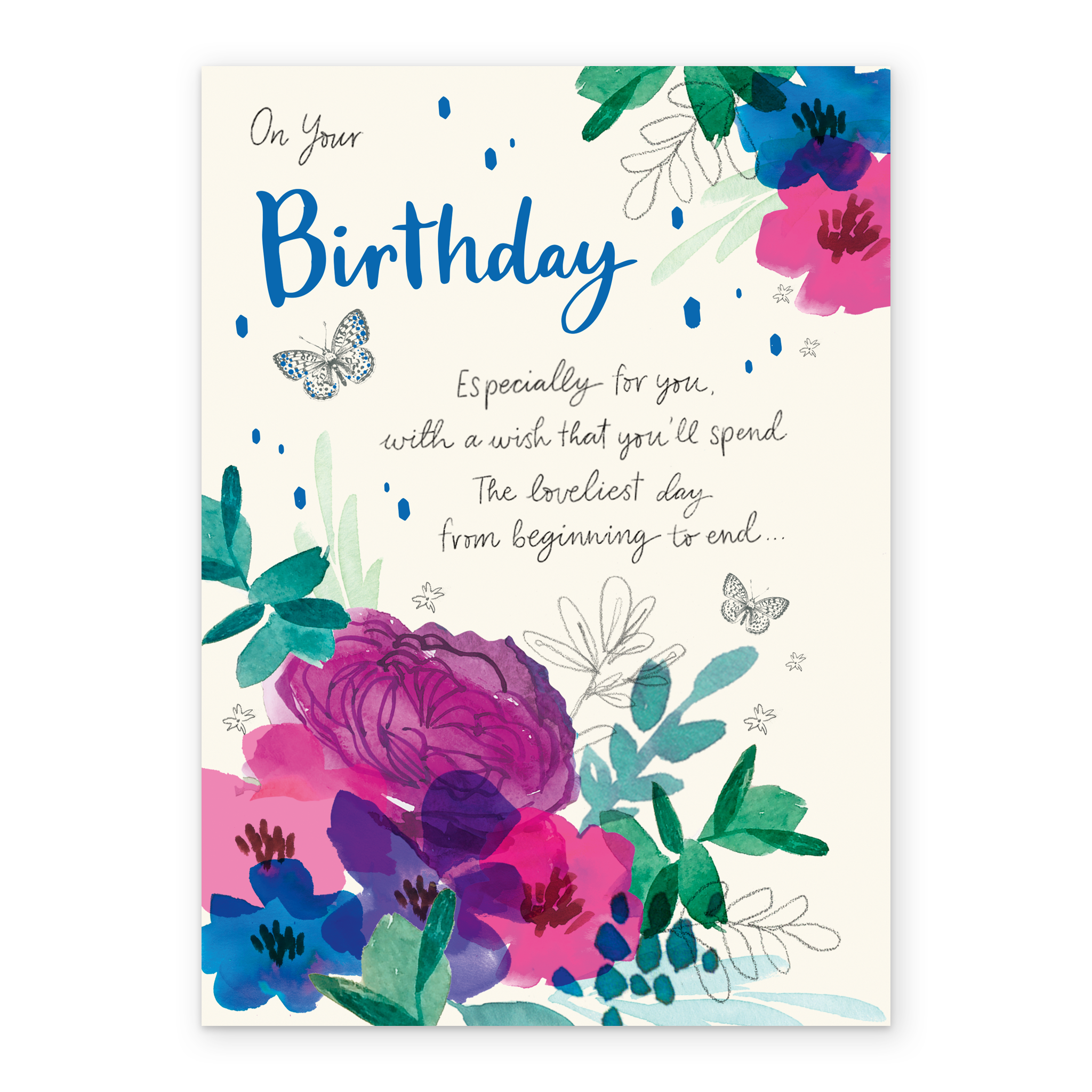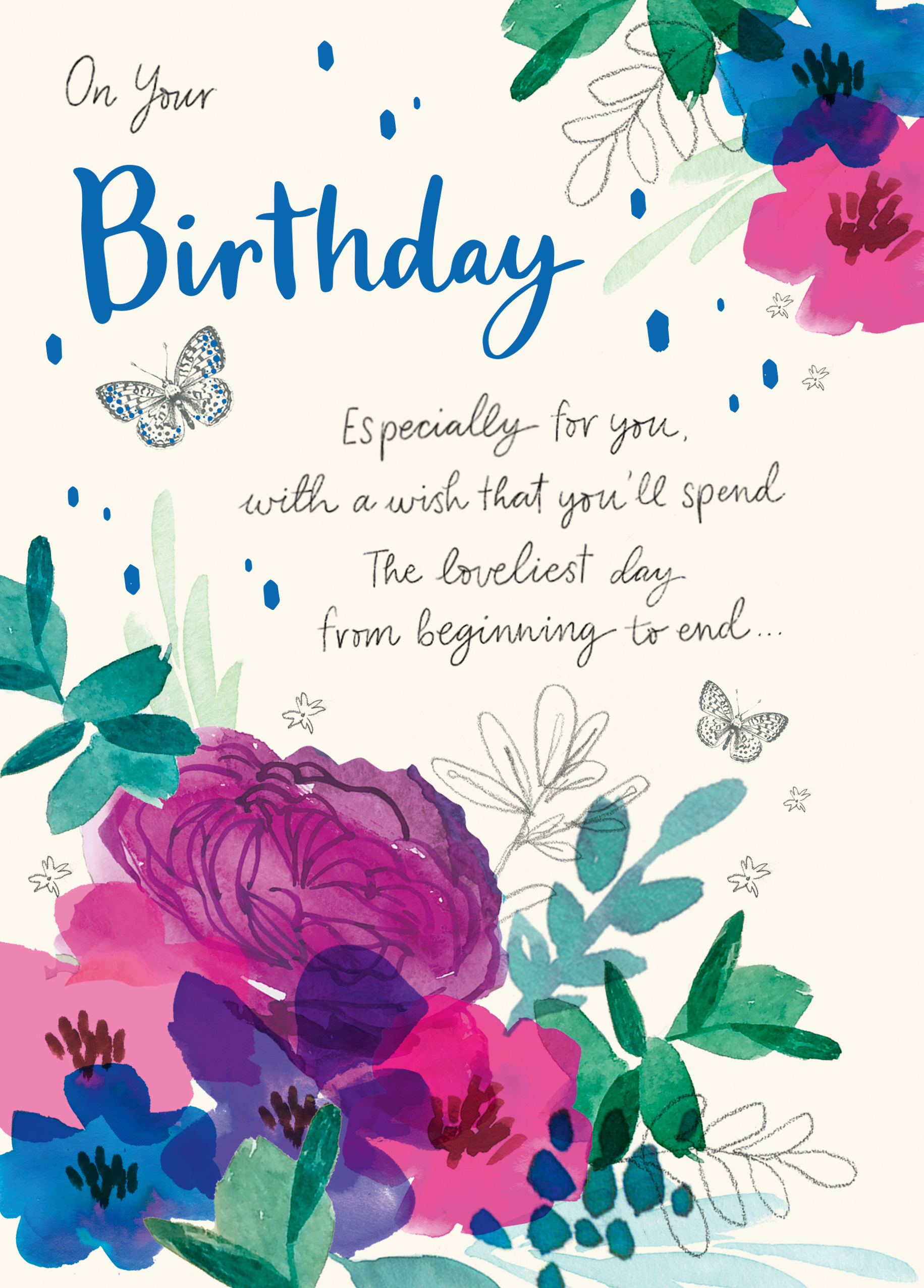 Printed on premium-quality board, this card features watercolour style florals, with the message 'On your birthday, especially for you, with a wish that you’ll spend the loveliest day from beginning to end…', and comes complete with a co-ordinating white envelope.