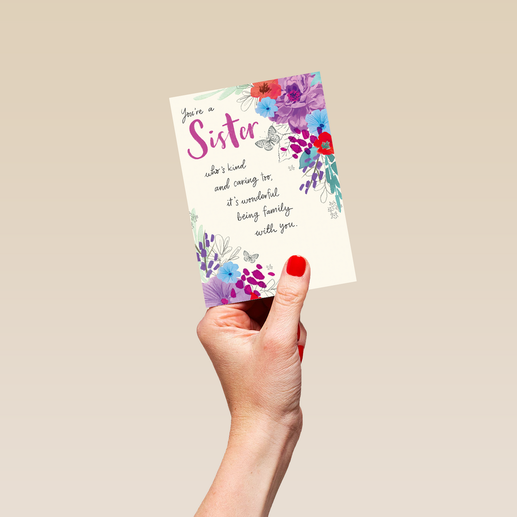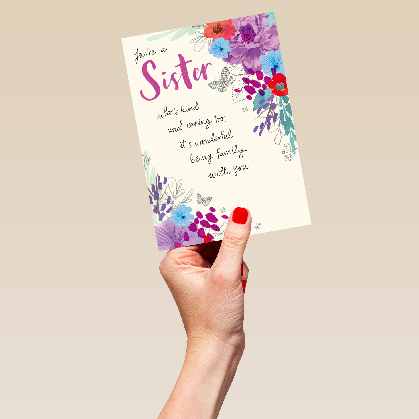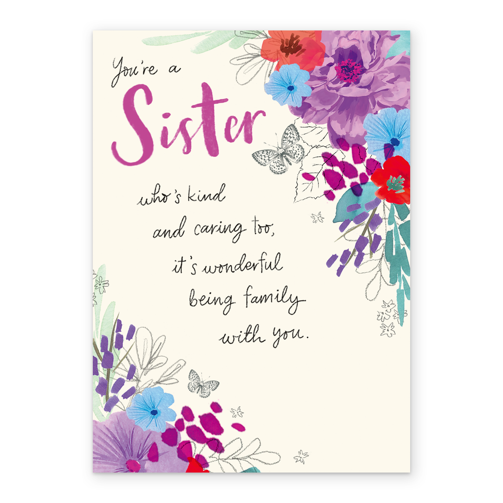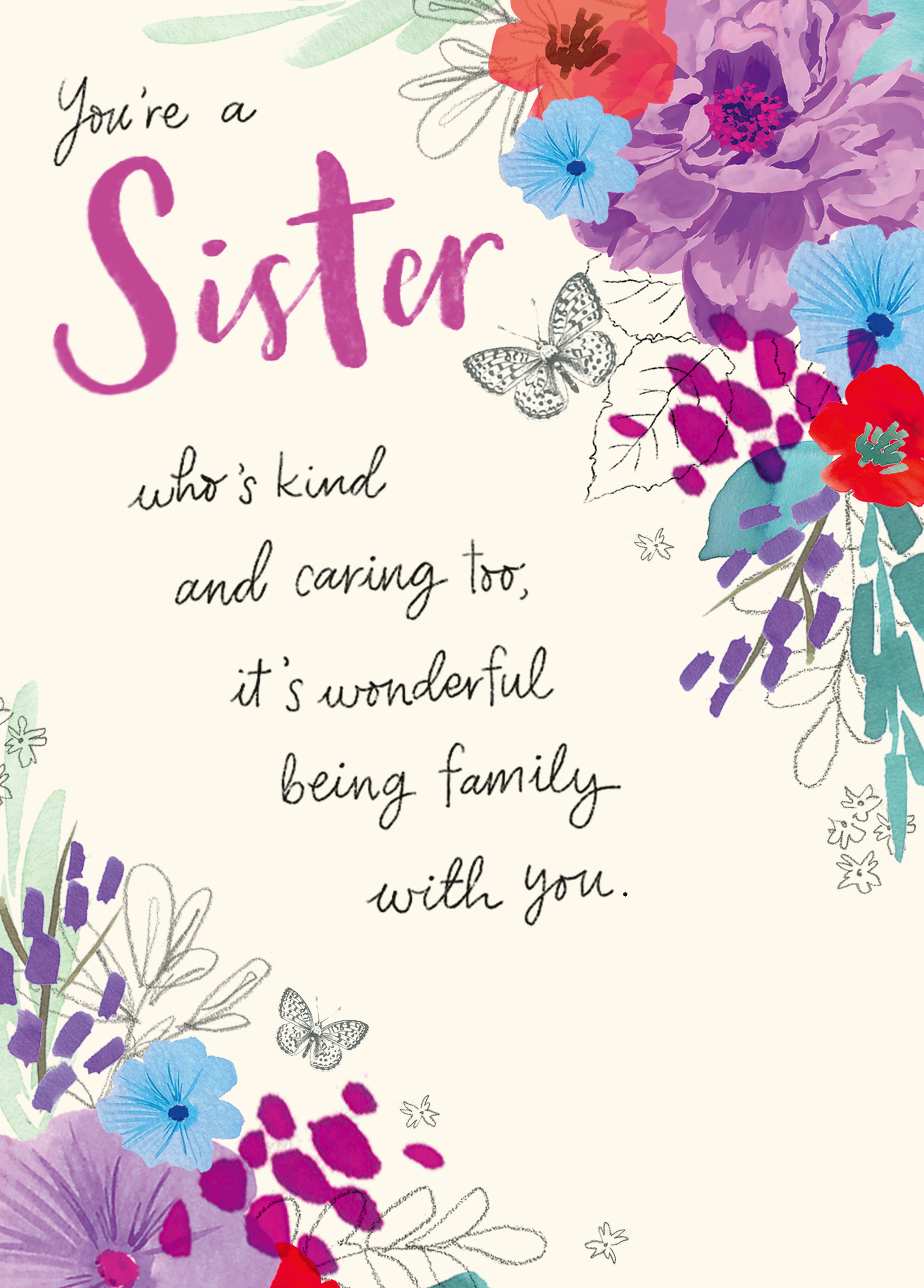Printed on premium-quality board, this card features watercolour style florals, with the message 'You’re a sister who’s kind and caring too, it’s wonderful being family with you.', and comes complete with a co-ordinating white envelope.