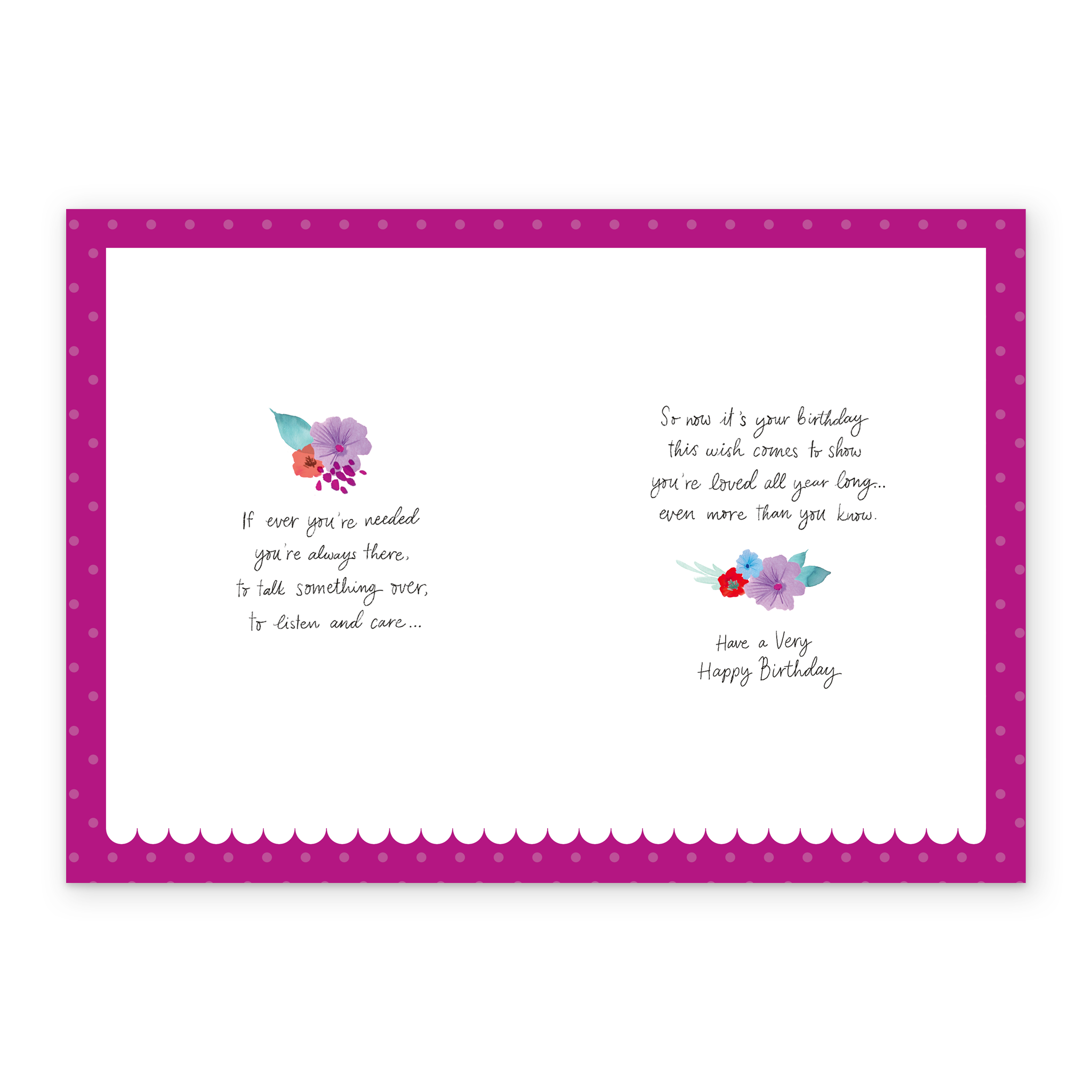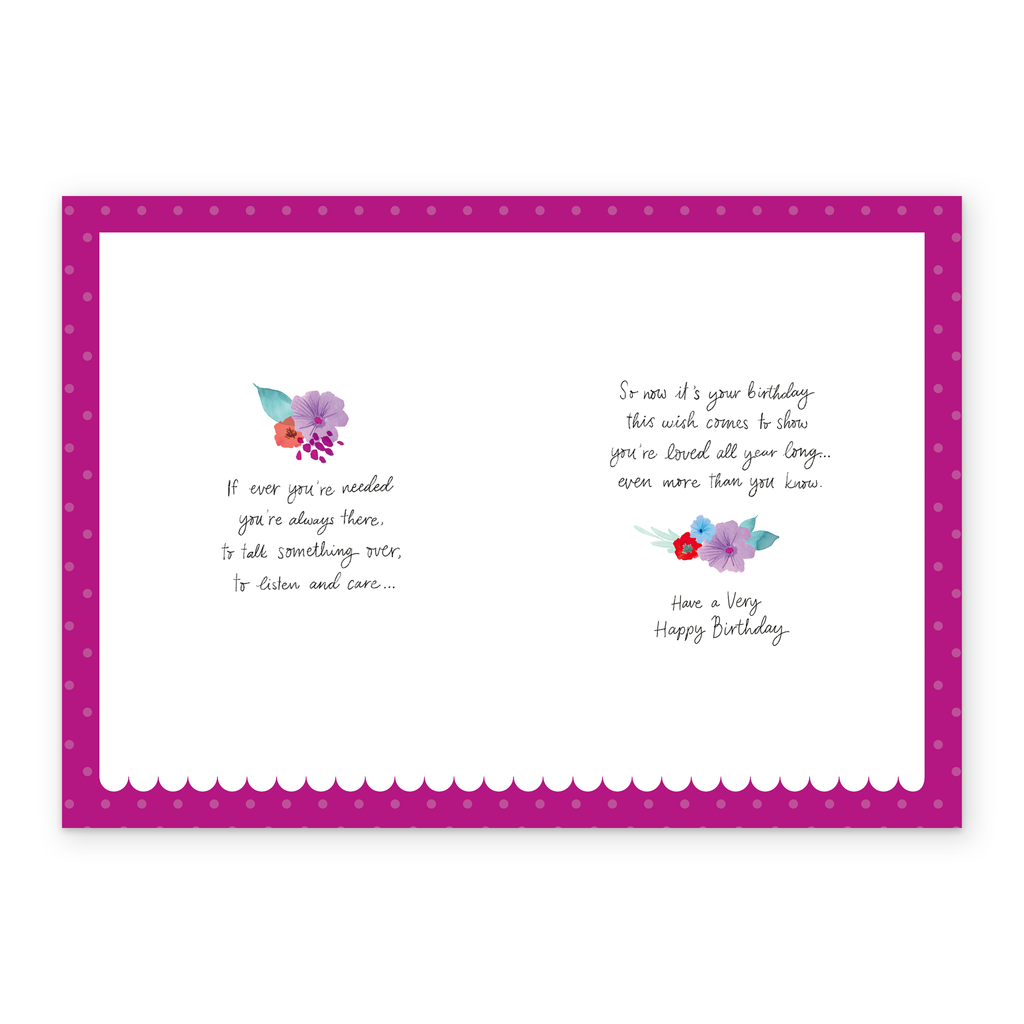 Message inside reads: If ever you’re needed you’re always there, to talk something over, to listen and care… So now it’s your birthday this wish comes to show you’re loved all year long… even more than you know. Have a very happy birthday.